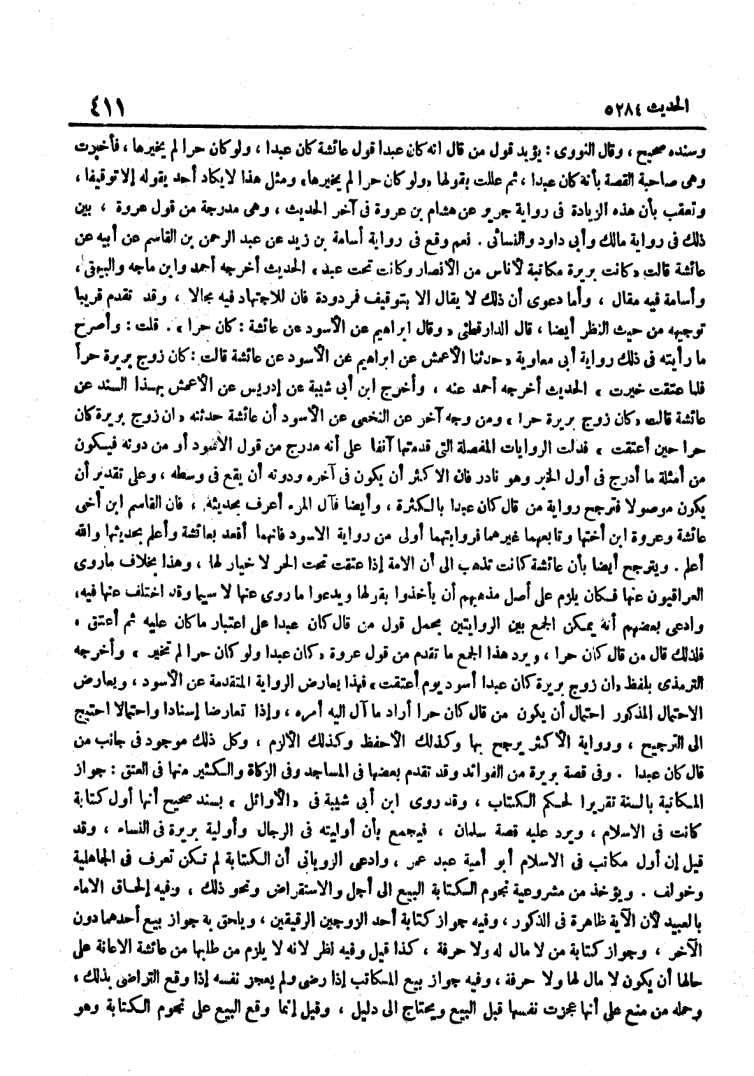 وَسَنَدُهُ صَحِيحٌ وَقَالَ النَّوَوِيُّ يُؤَيِّدُ قَوْلَ مَنْ قَالَ إِنَّهُ كَانَ عَبْدًا قَوْلُ عَائِشَةَ كَانَ عبدا وَلَو كَانَ حرا لم يخبرها فَأَخْبَرَتْ وَهِيَ صَاحِبَةُ الْقِصَّةِ بِأَنَّهُ كَانَ عَبْدًا ثُمَّ عَلَّلَتْ بِقَوْلِهَا وَلَوْ كَانَ حُرًّا لَمْ يُخَيِّرْهَا وَمِثْلُ هَذَا لَا يَكَادُ أَحَدٌ يَقُولُهُ إِلَّا تَوْقِيفًا وَتُعُقِّبَ بِأَنَّ هَذِهِ الزِّيَادَةَ فِي رِوَايَةِ جَرِيرٍ عَنْ هِشَامِ بْنِ عُرْوَةَ فِي آخِرِ الْحَدِيثِ وَهِيَ مُدْرَجَةٌ مِنْ قَوْلِ عُرْوَةَ بَيَّنَ ذَلِكَ فِي رِوَايَةِ مَالِكٍ وَأَبِي دَاوُدَ وَالنَّسَائِيِّ نَعَمْ وَقَعَ فِي رِوَايَةِ أُسَامَةَ بْنِ زيد عَنْ عَبْدِ الرَّحْمَنِ بْنِ الْقَاسِمِ عَنْ أَبِيهِ عَنْ عَائِشَةَ قَالَتْ كَانَتْ بَرِيرَةُ مُكَاتَبَةً لِأُنَاسٍ مِنَ الْأَنْصَارِ وَكَانَتْ تَحْتَ عَبْدٍ الْحَدِيثَ أخرجه أَحْمد وبن مَاجَهْ وَالْبَيْهَقِيُّ وَأُسَامَةُ فِيهِ مَقَالٌ وَأَمَّا دَعْوَى أَنَّ ذَلِكَ لَا يُقَالُ إِلَّا بِتَوْقِيفٍ فَمَرْدُودَةٌ فَإِنَّ لِلِاجْتِهَادِ فِيهِ مَجَالًا وَقَدْ تَقَدَّمَ قَرِيبًا تَوْجِيهُهُ مِنْ حَيْثُ النَّظَرُ أَيْضًا قَالَ الدَّارَقُطْنِيُّ وَقَالَ إِبْرَاهِيمُ عَنِ الْأَسْوَدِ عَنْ عَائِشَةَ كَانَ حُرًّا قُلْتُ وَأَصْرَحُ مَا رَأَيْتُهُ فِي ذَلِكَ رِوَايَةُ أَبِي مُعَاوِيَةَ حَدَّثَنَا الْأَعْمَشُ عَنْ إِبْرَاهِيمَ عَنِ الْأَسْوَدِ عَنْ عَائِشَةَ قَالَتْ كَانَ زَوْجُ بَرِيرَةَ حُرًّا فَلَمَّا عُتِقَتْ خُيِّرَتْ الْحَدِيثَ أَخْرَجَهُ أَحْمد عَنهُ وَأخرج بن أَبِي شَيْبَةَ عَنْ إِدْرِيسَ عَنِ الْأَعْمَشِ بِهَذَا السَّنَدِ عَنْ عَائِشَةَ قَالَتْ كَانَ زَوْجُ بَرِيرَةَ حُرًّا وَمِنْ وَجْهٍ آخَرَ عَنِ النَّخَعِيِّ عَنِ الْأَسْوَدِ أَنَّ عَائِشَةَ حَدَّثَتْهُ أَنَّ زَوْجَ بَرِيرَةَ كَانَ حُرًّا حِينَ أُعْتِقَتْ فَدَلَّتِ الرِّوَايَاتُ الْمُفَصَّلَةُ الَّتِي قَدَّمْتُهَا آنِفًا عَلَى أَنَّهُ مُدْرَجٌ مِنْ قَوْلِ الْأَسْوَدِ أَوْ مَنْ دُونَهُ فَيَكُونُ مِنْ أَمْثِلَةِ مَا أُدْرِجَ فِي أَوَّلِ الْخَبَرِ وَهُوَ نَادِرٌ فَإِنَّ الْأَكْثَرَ أَنْ يَكُونَ فِي آخِرِهِ وَدُونَهُ أَنْ يَقَعَ فِي وَسَطِهِ وَعَلَى تَقْدِيرِ أَنْ يَكُونَ مَوْصُولًا فَتُرَجَّحُ رِوَايَةُ مَنْ قَالَ كَانَ عَبْدًا بِالْكَثْرَةِ وَأَيْضًا فَآلُ الْمَرْءِ أَعْرَفُ بحَديثه فَإِن الْقَاسِم بن أخي عَائِشَة وَعُرْوَة بن أُخْتِهَا وَتَابَعَهُمَا غَيْرُهُمَا فَرِوَايَتُهُمَا أَوْلَى مِنْ رِوَايَةِ الْأَسْوَدِ فَإِنَّهُمَا أَقْعَدُ بِعَائِشَةَ وَأَعْلَمُ بِحَدِيثِهَا وَاللَّهُ أَعْلَمُ وَيَتَرَجَّحُ أَيْضًا بِأَنَّ عَائِشَةَ كَانَتْ تَذْهَبُ إِلَى أَنَّ الْأَمَةَ إِذَا عَتَقَتْ تَحْتَ الْحُرِّ لَا خِيَارَ لَهَا وَهَذَا بِخِلَافِ مَا رَوَى الْعِرَاقِيُّونَ عَنْهَا فَكَانَ يَلْزَمُ عَلَى أَصْلِ مَذْهَبِهِمْ أَنْ يَأْخُذُوا بِقَوْلِهَا وَيَدَعُوا مَا رُوِيَ عَنْهَا لَا سِيَّمَا وَقَدِ اخْتُلِفَ عَنْهَا فِيهِ وَادَّعَى بَعْضُهُمْ أَنَّهُ يُمْكِنُ الْجَمْعُ بَيْنَ الرِّوَايَتَيْنِ بِحَمْلِ قَوْلِ مَنْ قَالَ كَانَ عَبْدًا عَلَى اعْتِبَارِ مَا كَانَ عَلَيْهِ ثُمَّ أُعْتِقَ فَلِذَلِكَ قَالَ مَنْ قَالَ كَانَ حُرًّا وَيَرُدُّ هَذَا الْجَمْعَ مَا تَقَدَّمَ مِنْ قَوْلِ عُرْوَةَ كَانَ عَبْدًا وَلَوْ كَانَ حُرًّا لَمْ تُخَيَّرْ وَأَخْرَجَهُ التِّرْمِذِيُّ بِلَفْظِ أَنَّ زَوْجَ بَرِيرَةَ كَانَ عَبْدًا أَسْوَدَ يَوْمَ أُعْتِقَتْ فَهَذَا يُعَارِضُ الرِّوَايَةَ الْمُتَقَدِّمَةَ عَنِ الْأَسْوَدِ وَيُعَارِضُ الِاحْتِمَالَ الْمَذْكُورَ احْتِمَالُ أَنْ يَكُونَ مَنْ قَالَ كَانَ حُرًّا أَرَادَ مَا آلَ إِلَيْهِ أَمْرُهُ 