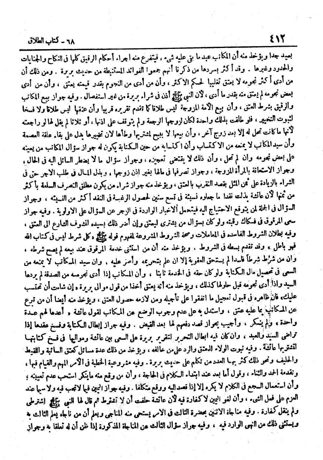 بَعِيدٌ جِدًّا وَيُؤْخَذُ مِنْهُ أَنَّ الْمُكَاتَبَ عَبْدٌ مَا بَقِيَ عَلَيْهِ شَيْءٌ فَيَتَفَرَّعُ مِنْهُ إِجْرَاءُ أَحْكَامِ الرَّقِيقِ كُلِّهَا فِي النِّكَاحِ وَالْجِنَايَاتِ وَالْحُدُودِ وَغَيْرِهَا وَقَدْ أَكْثَرَ بِسَرْدِهَا مَنْ ذَكَرْنَا أَنَّهُمْ جَمَعُوا الْفَوَائِدَ الْمُسْتَنْبَطَةَ مِنْ حَدِيثِ بَرِيرَةَ وَمِنْ ذَلِكَ أَنَّ مَنْ أَدَّى أَكْثَرَ نُجُومِهِ لَا يَعْتِقُ تَغْلِيبًا لِحُكْمِ الْأَكْثَرِ وَأَنَّ مَنْ أَدَّى مِنَ النُّجُومِ بِقَدْرِ قِيمَتِهِ يُعْتَقُ وَأَنَّ مَنْ أَدَّى بَعْضَ نُجُومِهِ لَمْ يُعْتَقْ مِنْهُ بِقَدْرِ مَا أَدَّى لِأَنَّ النَّبِيَّ صَلَّى اللَّهُ عَلَيْهِ وَسَلَّمَ أَذِنَ فِي شِرَاءِ بَرِيرَةَ مِنْ غَيْرِ اسْتِفْصَالٍ وَفِيهِ جَوَازُ بَيْعِ الْمُكَاتَبِ وَالرَّقِيقِ بِشَرْطِ الْعِتْقِ وَأَنَّ بَيْعَ الْأَمَةِ الْمُزَوَّجَةِ لَيْسَ طَلَاقًا كَمَا تَقَدَّمَ تَقْرِيرُهُ قَرِيبًا وَأَنَّ عِتْقَهَا لَيْسَ طَلَاقًا وَلَا فَسْخًا لِثُبُوتِ التَّخْيِيرِ فَلَوْ طَلُقَتْ بِذَلِكَ وَاحِدَةً لَكَانَ لِزَوْجِهَا الرَّجْعَةُ وَلَمْ يَتَوَقَّفْ عَلَى إِذْنِهَا أَوْ ثَلَاثًا لَمْ يَقُلْ لَهَا لَو راجعته لِأَنَّهَا مَا كَانَتْ تَحِلُّ لَهُ إِلَّا بَعْدَ زَوْجٍ آخَرَ وَأَنَّ بَيْعَهَا لَا يُبِيحُ لِمُشْتَرِيهَا وَطَأْهَا لِأَنَّ تَخْيِيرَهَا يَدُلُّ عَلَى بَقَاءِ عُلْقَةِ الْعِصْمَةِ وَأَنَّ سَيِّدَ الْمُكَاتَبِ لَا يَمْنَعُهُ مِنَ الِاكْتِسَابِ وَأَنَّ اكْتِسَابَهُ مِنْ حِينِ الْكِتَابَةِ يَكُونُ لَهُ جَوَازُ سُؤَالِ الْمُكَاتَبِ مَنْ يُعِينُهُ عَلَى بَعْضِ نُجُومِهِ وَإِنْ لَمْ تَحِلَّ وَأَنَّ ذَلِكَ لَا يَقْتَضِي تَعْجِيزَهُ وَجَوَازُ سُؤَالِ مَا لَا يُضْطَرُّ السَّائِلُ إِلَيْهِ فِي الْحَالِ وَجَوَازُ الِاسْتِعَانَةِ بِالْمَرْأَةِ الْمُزَوَّجَةِ وَجَوَازُ تَصَرُّفِهَا فِي مَالِهَا بِغَيْرِ إِذْنِ زَوْجِهَا وَبَذْلِ الْمَالِ فِي طَلَبِ الْأَجْرِ حَتَّى فِي الشِّرَاءِ بِالزِّيَادَةِ عَلَى ثَمَنِ الْمِثْلِ بِقَصْدِ التَّقَرُّبِ بِالْعِتْقِ وَيُؤْخَذُ مِنْهُ جَوَازُ شِرَاءِ مَنْ يَكُونُ مُطْلَقُ التَّصَرُّفِ السِّلْعَةَ بِأَكْثَرَ مِنْ ثَمَنِهَا لِأَنَّ عَائِشَةَ بَذَلَتْ نَقْدًا مَا جَعَلُوهُ نَسِيئَةً فِي تِسْعِ سِنِينَ لِحُصُولِ الرَّغْبَةِ فِي النَّقْدِ أَكْثَرَ مِنَ النَّسِيئَةِ وَجَوَازُ السُّؤَالِ فِي الْجُمْلَة لمن يتَوَقَّع الِاحْتِيَاج إِلَيْهِ فيتحمل الْأَخْبَارُ الْوَارِدَةُ فِي الزَّجْرِ عَنِ السُّؤَالِ عَلَى الْأَوْلَوِيَّةِ وَفِيهِ جَوَازُ سَعْيِ الْمَرْقُوقِ فِي فِكَاكِ رَقَبَتِهِ وَلَوْ كَانَ بِسُؤَالِ مَنْ يَشْتَرِي لِيَعْتِقَ وَإِنْ أَضَرَّ ذَلِكَ بِسَيِّدِهِ لِتَشَوُّفِ الشَّارِعِ إِلَى الْعِتْقِ وَفِيهِ بُطْلَانُ الشُّرُوطِ الْفَاسِدَةِ فِي الْمُعَامَلَاتِ وَصِحَّةُ الشُّرُوطِ الْمَشْرُوعَةِ لِمَفْهُومِ قَوْلِهِ صَلَّى اللَّهُ عَلَيْهِ وَسَلَّمَ كُلُّ شَرْطٍ لَيْسَ فِي كِتَابِ اللَّهِ فَهُوَ بَاطِلٌ وَقَدْ تَقَدَّمَ بَسْطُهُ فِي الشُّرُوطِ وَيُؤْخَذُ مِنْهُ أَنَّ مَنِ اسْتَثْنَى خِدْمَةَ الْمَرْقُوقِ عِنْدَ بَيْعِهِ لَمْ يَصِحَّ شَرْطُهُ وَأَنَّ مَنْ شَرَطَ شَرْطًا فَاسِدًا لَمْ يَسْتَحِقَّ الْعُقُوبَةَ إِلَّا إِنْ عَلِمَ بِتَحْرِيمِهِ وَأَصَرَّ عَلَيْهِ وَأَنَّ سَيِّدَ الْمُكَاتَبِ لَا يَمْنَعُهُ مِنَ السَّعْي فِي تَحْصِيلِ مَالِ الْكِتَابَةِ وَلَوْ كَانَ حَقُّهُ فِي الْخِدْمَةِ ثَابِتًا وَأَنَّ الْمُكَاتَبَ إِذَا أَدَّى نُجُومَهُ من الصَّدَقَة لم يردهَا السَّيِّد وَإِذَا أَدَّى نُجُومَهُ قَبْلَ حُلُولِهَا كَذَلِكَ وَيُؤْخَذُ مِنْهُ أَنَّهُ يَعْتِقُ أَخْذًا مِنْ قَوْلِ مَوَالِي بَرِيرَة