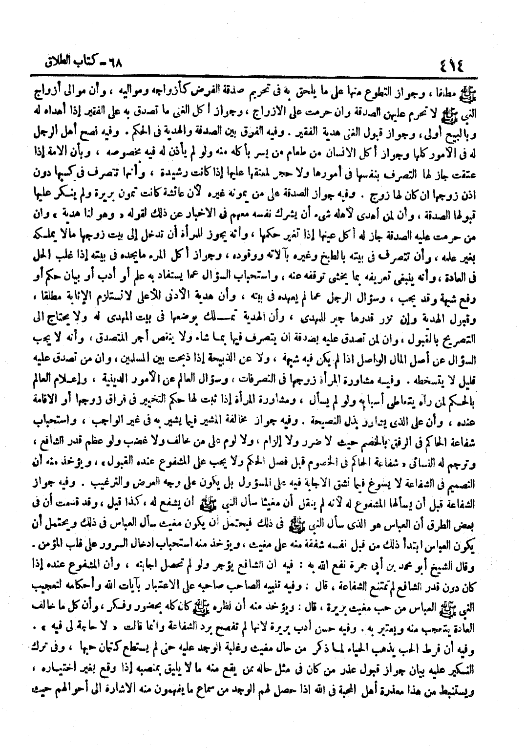 صَلَّى اللَّهُ عَلَيْهِ وَسَلَّمَ مُطْلَقًا وَجَوَازُ التَّطَوُّعِ مِنْهَا عَلَى مَا يَلْحَقُ بِهِ فِي تَحْرِيمِ صَدَقَةِ الْفَرْضِ كَأَزْوَاجِهِ وَمَوَالِيهِ وَأَنَّ مَوَالِي أَزْوَاجِ النَّبِيِّ صَلَّى اللَّهُ عَلَيْهِ وَسَلَّمَ لَا تَحْرُمُ عَلَيْهِنَّ الصَّدَقَةُ وَإِنْ حَرُمَتْ عَلَى الْأَزْوَاجِ وَجَوَازُ أَكْلِ الْغَنِيِّ مَا تُصَدِّقُ بِهِ عَلَى الْفَقِيرِ إِذَا أَهْدَاهُ لَهُ وَبِالْبَيْعِ أَوْلَى وَجَوَازُ قَبُولِ الْغَنِيِّ هَدِيَّةَ الْفَقِيرِ وَفِيهِ الْفَرْقُ بَيْنَ الصَّدَقَةِ وَالْهَدِيَّةِ فِي الْحُكْمِ وَفِيهِ نُصْحُ أَهْلِ الرَّجُلِ لَهُ فِي الْأُمُورِ كُلِّهَا وَجَوَازُ أَكْلِ الْإِنْسَانِ مِنْ طَعَامِ مَنْ يُسَرُّ بِأَكْلِهِ مِنْهُ وَلَوْ لَمْ يَأْذَنْ لَهُ فِيهِ بِخُصُوصِهِ وَبِأَنَّ الْأَمَةَ إِذَا عَتَقَتْ جَازَ لَهَا التَّصَرُّفُ بِنَفْسِهَا فِي أُمُورِهَا وَلَا حَجْرَ لِمُعْتِقِهَا عَلَيْهَا إِذَا كَانَتْ رَشِيدَةً وَأَنَّهَا تَتَصَرَّفُ فِي كَسْبِهَا دُونَ إِذْنِ زَوْجِهَا إِنْ كَانَ لَهَا زَوْجٌ وَفِيهِ جَوَازُ الصَّدَقَةِ عَلَى مَنْ يَمُونُهُ غَيْرُهُ لِأَنَّ عَائِشَةَ كَانَتْ تَمُونُ بَرِيرَةَ وَلَمْ يُنْكِرْ عَلَيْهَا قَبُولَهَا الصَّدَقَةَ وَأَنَّ لِمَنْ أُهْدِيَ لِأَهْلِهِ شَيْءٌ أَنْ يُشْرِكَ نَفْسَهُ مَعَهُمْ فِي الْإِخْبَارِ عَنْ ذَلِكَ لِقَوْلِهِ وَهُوَ لَنَا هدِيَّةٌ وَأَنَّ مَنْ حَرُمَتْ عَلَيْهِ الصَّدَقَةُ جَازَ لَهُ أَكْلُ عَيْنِهَا إِذَا تَغَيَّرَ حُكْمُهَا وَأَنَّهُ يَجُوزُ لِلْمَرْأَةِ أَنْ تُدْخِلَ إِلَى بَيْتِ زَوْجِهَا مَا لَا يَمْلِكُهُ بِغَيْرِ عِلْمِهِ وَأَنْ تَتَصَرَّفَ فِي بَيْتِهِ بِالطَّبْخِ وَغَيْرِهِ بَآلَاتِهِ وَوُقُودِهِ وَجَوَازُ أَكْلِ الْمَرْءِ مَا يَجِدُهُ فِي بَيْتِهِ إِذَا غَلَبَ الْحِلُّ فِي الْعَادَةِ وَأَنَّهُ يَنْبَغِي تَعْرِيفُهُ بِمَا يَخْشَى تَوَقُّفَهُ عَنْهُ وَاسْتِحْبَابُ السُّؤَالِ عَمَّا يُسْتَفَادُ بِهِ عِلْمٌ أَوْ أَدَبٌ أَوْ بَيَانُ حُكْمٍ أَوْ رَفْعُ شُبْهَةٍ وَقَدْ يَجِبُ وَسُؤَالُ الرَّجُلِ عَمَّا لَمْ يَعْهَدَهُ فِي بَيْتِهِ وَأَنَّ هَدِيَّةَ الْأَدْنَى لِلْأَعْلَى لَا تَسْتَلْزِمُ الْإِثَابَةَ مُطْلَقًا وَقَبُولُ الْهَدِيَّةِ وَإِنْ نَزَرَ قَدْرُهَا جَبْرٌ لِلْمُهْدِي وَأَنَّ الْهَدِيَّةَ تُمْلَكُ بِوَضْعِهَا فِي بَيْتِ الْمُهْدِي لَهُ وَلَا يَحْتَاجُ إِلَى التَّصْرِيحِ بِالْقَبُولِ وَأَنَّ لِمَنْ تُصُدِّقَ عَلَيْهِ بِصَدَقَةٍ أَنْ يَتَصَرَّفَ فِيهَا بِمَا شَاءَ وَلَا يَنْقُصُ أَجْرُ الْمُتَصَدِّقِ وَأَنَّهُ لَا يَجِبُ السُّؤَالُ عَنْ أَصْلِ الْمَالِ الْوَاصِلِ إِذَا لَمْ يَكُنْ فِيهِ شُبْهَةٌ وَلَا عَنِ الذَّبِيحَةِ إِذَا ذُبِحَتْ بَيْنَ الْمُسْلِمِينَ وَأَنَّ مَنْ تُصُدِّقَ عَلَيْهِ قَلِيلٌ لَا يَتَسَخَّطُهُ وَفِيهِ مُشَاوَرَةُ الْمَرْأَةِ زَوْجَهَا فِي التَّصَرُّفَاتِ وَسُؤَالُ الْعَالِمِ عَنِ الْأُمُورِ الدِّينِيَّةِ وَإِعْلَامُ الْعَالِمِ بِالْحُكْمِ لِمَنْ رَآهُ يَتَعَاطَى أَسْبَابَهُ وَلَوْ لَمْ يَسْأَلْ وَمُشَاوَرَةُ الْمَرْأَةِ إِذَا ثَبَتَ لَهَا حُكْمُ التَّخْيِيرِ فِي فِرَاقِ زَوْجِهَا أَوِ الْإِقَامَةِ عِنْدَهُ وَأَنَّ عَلَى الَّذِي يُشَاوِرُ بَذْلَ النَّصِيحَةِ وَفِيهِ جَوَازُ مُخَالَفَةِ الْمُشِيرِ فِيمَا يُشِيرُ بِهِ فِي غَيْرِ الْوَاجِبِ وَاسْتِحْبَابُ شَفَاعَةِ الْحَاكِمِ فِي الرِّفْقِ بِالْخَصْمِ حَيْثُ لَا ضَرَرَ وَلَا إِلْزَامَ وَلَا لَوْمَ عَلَى مَنْ خَالَفَ وَلَا غَضَبَ وَلَوْ عَظُمَ قَدْرُ الشَّافِعِ وَتَرْجَمَ لَهُ النَّسَائِيُّ شَفَاعَةُ الْحَاكِمِ فِي الْخُصُومِ قَبْلَ فَصْلِ الْحُكْمِ وَلَا يَجِبُ عَلَى الْمَشْفُوعِ عِن