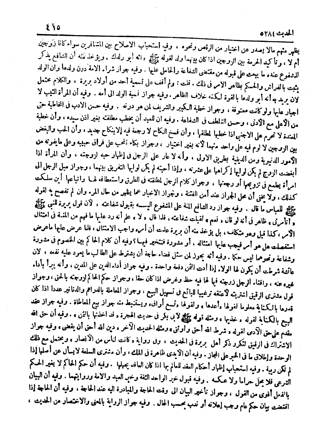 يَظْهَرُ مِنْهُمْ مَا لَا يَصْدُرُ عَنِ اخْتِيَارٍ مِنَ الرَّقْصِ وَنَحْوِهِ وَفِيهِ اسْتِحْبَابُ الْإِصْلَاحِ بَيْنَ الْمُتَنَافِرَيْنِ سَوَاءٌ كَانَا زَوْجَيْنِ أَمْ لَا وَتَأْكِيدُ الْحُرْمَةِ بَيْنَ الزَّوْجَيْنِ إِذَا كَانَ بَيْنَهُمَا وَلَدٌ لِقَوْلِهِ صَلَّى اللَّهُ عَلَيْهِ وَسَلَّمَ إِنَّهُ أَبُو وَلَدِكِ وَيُؤْخَذُ مِنْهُ أَنَّ الشَّافِعَ يَذْكُرُ لِلْمَشْفُوعِ عِنْده مَا يبْعَث على قَبُولِهِ مِنْ مُقْتَضَى الشَّفَاعَةِ وَالْحَامِلِ عَلَيْهَا وَفِيهِ جَوَازُ شِرَاءِ الْأَمَةِ دُونَ وَلَدِهَا وَأَنَّ الْوَلَدَ يَثْبُتُ بِالْفِرَاشِ وَالْحُكْمُ بِظَاهِرِ الْأَمْرِ فِي ذَلِكَ قُلْتُ وَلَمْ أَقِفْ عَلَى تَسْمِيَةِ أَحَدٍ مِنْ أَوْلَادِ بَرِيرَةَ وَالْكَلَامُ مُحْتَمِلٌ لِأَنْ يُرِيدَ بِهِ أَنَّهُ أَبُو وَلَدِهَا بِالْقُوَّةِ لَكِنَّهُ خِلَافُ الظَّاهِرِ وَفِيهِ جَوَازُ نِسْبَةِ الْوَلَدِ إِلَى أُمِّهِ وَفِيهِ أَنَّ الْمَرْأَةَ الثَّيِّبَ لَا إِجْبَارَ عَلَيْهَا وَلَوْ كَانَتْ مَعْتُوقَةً وَجَوَازُ خِطْبَةِ الْكَبِيرِ وَالشَّرِيفِ لِمَنْ هُوَ دُونَهُ وَفِيهِ حُسْنُ الْأَدَبِ فِي الْمُخَاطَبَةِ حَتَّى مِنَ الْأَعْلَى مَعَ الْأَدْنَى وَحُسْنُ التَّلَطُّفِ فِي الشَّفَاعَةِ وَفِيهِ أَنَّ لِلْعَبْدِ أَنْ يَخْطُبَ مطلقته بِغَيْر إِذن سَيّده وَأَنَّ خِطْبَةَ الْمُعْتَدَّةِ لَا تَحْرُمُ عَلَى الْأَجْنَبِيِّ إِذَا خَطَبَهَا لِمُطَلَّقِهَا وَأَنَّ فَسْخَ النِّكَاحِ لَا رَجْعَةَ فِيهِ إِلَّا بِنِكَاحٍ جَدِيدٍ وَأَنَّ الْحُبَّ وَالْبُغْضَ بَيْنَ الزَّوْجَيْنِ لَا لَوْمَ فِيهِ عَلَى وَاحِدٍ مِنْهُمَا لِأَنَّهُ بِغَيْرِ اخْتِيَارٍ وَجَوَازُ بُكَاءِ الْمُحِبِّ عَلَى فِرَاقِ حَبِيبِهِ وَعَلَى مَا يَفُوتُهُ مِنَ الْأُمُورِ الدُّنْيَوِيَّةِ وَمِنَ الدِّينِيَّةِ بِطَرِيقِ الْأَوْلَى وَأَنَّهُ لَا عَارَ عَلَى الرَّجُلِ فِي إِظْهَارِ حُبِّهِ لِزَوْجَتِهِ وَأَنَّ الْمَرْأَةَ إِذَا أَبْغَضَتِ الزَّوْجَ لَمْ يَكُنْ لِوَلِيِّهَا إِكْرَاهُهَا عَلَى عِشْرَتِهِ وَإِذَا أَحَبَّتْهُ لَمْ يَكُنْ لِوَلِيِّهَا التَّفْرِيقُ بَيْنَهُمَا وَجَوَازُ مَيْلِ الرَّجُلِ إِلَى امْرَأَةٍ يَطْمَعُ فِي تَزْوِيجِهَا أَوْ رَجَعْتِهَا وَجَوَازُ كَلَامِ الرَّجُلِ لِمُطَلَّقَتِهِ فِي الطُّرُقِ وَاسْتِعْطَافِهِ لَهَا وَاتِّبَاعِهَا أَيْنَ سَلَكَتْ كَذَلِكَ وَلَا يَخْفَى أَنَّ مَحِلَّ الْجَوَازِ عِنْدَ أَمْنِ الْفِتْنَةِ وَجَوَازُ الْإِخْبَارِ عَمَّا يَظْهَرُ مِنْ حَالِ الْمَرْءِ وَإِنْ لَمْ تُفْصِحْ بِهِ لِقَوْلِهِ صَلَّى اللَّهُ عَلَيْهِ وَسَلَّمَ لِلْعَبَّاسِ مَا قَالَ وَفِيهِ جَوَازُ رَدِّ الشَّافِعِ الْمِنَّةَ عَلَى الْمَشْفُوعِ إِلَيْهِ بِقَبُولِ شَفَاعَتِهِ لِأَنَّ قَوْلَ بَرِيرَةَ لِلنَّبِيِّ صَلَّى اللَّهُ عَلَيْهِ وَسَلَّمَ أَتَأْمُرُنِي ظَاهِرٌ فِي أَنَّهُ لَوْ قَالَ نَعَمْ لَقَبِلَتْ شَفَاعَتَهُ فَلَمَّا قَالَ لَا عُلِمَ أَنَّهُ رَدَّ عَلَيْهَا مَا فُهِمَ مِنَ الْمِنَّةِ فِي امْتِثَالِ الْأَمْرِ كَذَا قِيلَ وَهُوَ مُتَكَلَّفٌ بَلْ يُؤْخَذُ مِنْهُ أَنَّ بَرِيرَةَ عَلِمَتْ أَنَّ أَمْرَهُ وَاجِبُ الِامْتِثَالِ فَلَمَّا عَرَضَ عَلَيْهَا مَا عَرَضَ اسْتَفْصَلَتْ هَلْ هُوَ أَمْرٌ فَيَجِبُ عَلَيْهَا امْتِثَالُهُ أَوْ مَشُورَةٌ فَتَتَخَيَّرُ فِيهَا وَفِيهِ أَنَّ كَلَامَ الْحَاكِمِ بَيْنَ الْخُصُومِ فِي مَشُورَةٍ وَشَفَاعَةٍ وَنَحْوِهِمَا لَيْسَ حُكْمًا وَفِيهِ أَنَّهُ يَجُوزُ لِمَنْ سُئِلَ قَضَاءَ حَاجَةٍ أَنْ يَشْتَرِطَ عَلَى الطَّالِبِ مَا يَعُودُ عَلَيْهِ نَفْعُهُ لِأَنَّ عَائِشَةَ شَرَطَتْ أَنْ يَكُونَ لَهَا الْوَلَاءُ إِذَا أَدَّتِ الثَّمَنَ دَفْعَةً وَاحِدَةً وَفِ