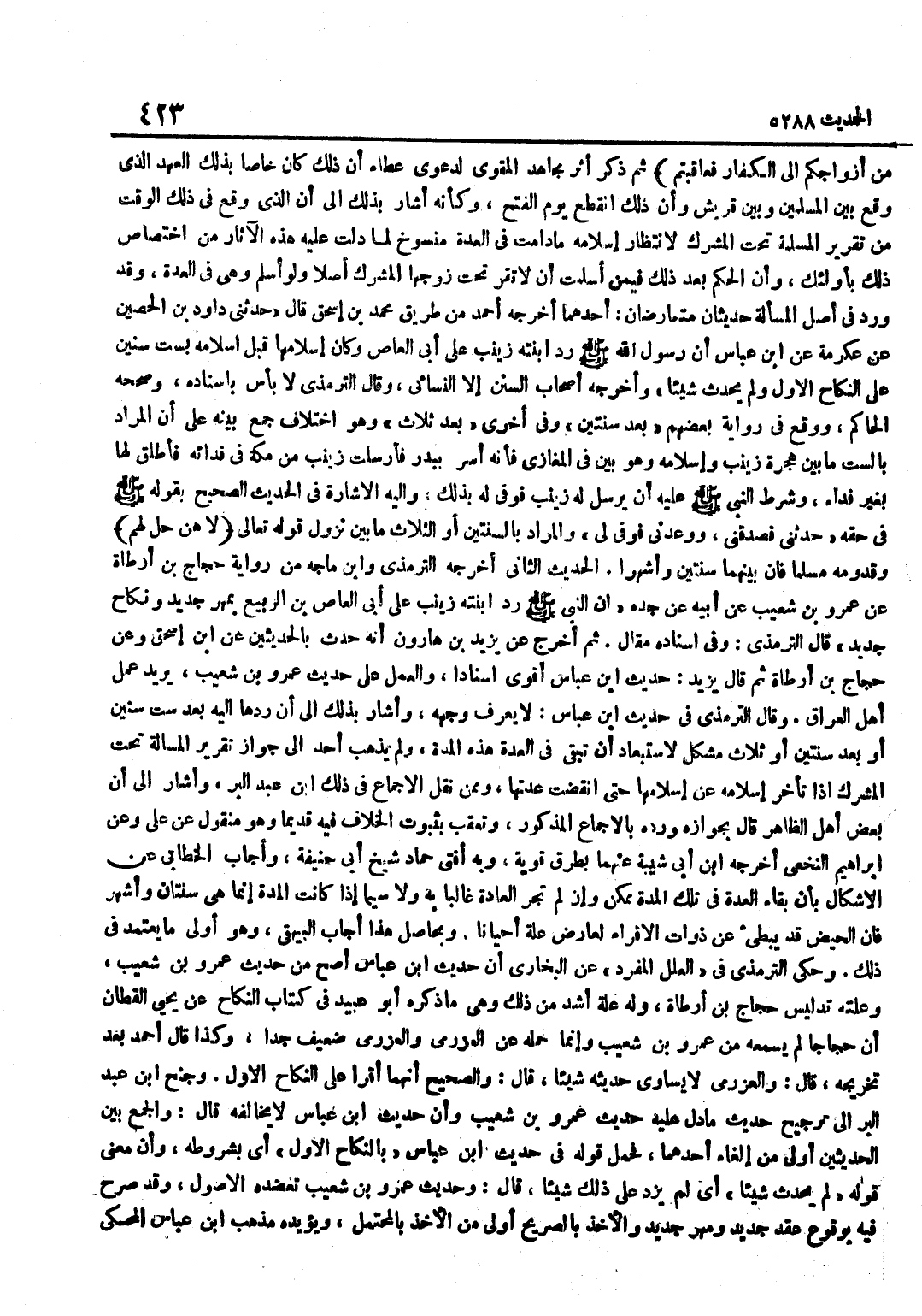 من ازواجكم إِلَى الْكفَّار فعاقبتم ثُمَّ ذَكَرَ أَثَرَ مُجَاهِدٍ الْمُقَوِّيَ لِدَعْوَى عَطَاءٍ أَنَّ ذَلِكَ كَانَ خَاصًّا بِذَلِكَ الْعَهْدِ الَّذِي وَقَعَ بَيْنَ الْمُسْلِمِينَ وَبَيْنَ قُرَيْشٍ وَأَنَّ ذَلِكَ انْقَطَعَ يَوْمَ الْفَتْحِ وَكَأَنَّهُ أَشَارَ بِذَلِكَ إِلَى أَنَّ الَّذِي وَقَعَ فِي ذَلِكَ الْوَقْتِ مِنْ تَقْرِيرِ الْمُسْلِمَةِ تَحْتَ الْمُشْرِكِ لِانْتِظَارِ إِسْلَامِهِ مَا دَامَتْ فِي الْعِدَّةِ مَنْسُوخٌ لِمَا دَلَّتْ عَلَيْهِ هَذِهِ الْآثَارُ مِنِ اخْتِصَاصِ ذَلِكَ بِأُولَئِكَ وَأَنَّ الْحُكْمَ بَعْدَ ذَلِكَ فِيمَنْ أَسْلَمَتْ أَنْ لَا تُقَرَّ تَحْتَ زَوْجِهَا الْمُشْرِكِ أَصْلًا وَلَوْ أَسْلَمَ وَهِيَ فِي الْعِدَّةِ وَقَدْ وَرَدَ فِي أَصْلِ الْمَسْأَلَةِ حَدِيثَانِ مُتَعَارِضَانِ أَحَدُهُمَا أَخْرَجَهُ أَحْمَدُ مِنْ طَرِيقِ مُحَمَّدِ بْنِ إِسْحَاقَ قَالَ حَدَّثَنِي دَاوُدُ بن الْحصين عَن عِكْرِمَة عَن بن عَبَّاسٍ أَنَّ رَسُولَ اللَّهِ صَلَّى اللَّهُ عَلَيْهِ وَسَلَّمَ رَدَّ ابْنَتَهُ زَيْنَبَ عَلَى أَبِي الْعَاصِ وَكَانَ إِسْلَامُهَا قَبْلَ إِسْلَامِهِ بِسِتِّ سِنِينَ عَلَى النِّكَاحِ الْأَوَّلِ وَلَمْ يُحْدِثْ شَيْئًا وَأَخْرَجَهُ أَصْحَابُ السُّنَنِ إِلَّا النَّسَائِيَّ وَقَالَ التِّرْمِذِيُّ لَا بَأْسَ بِإِسْنَادِهِ وَصَحَّحَهُ الْحَاكِمُ وَوَقَعَ فِي رِوَايَةِ بَعْضِهِمْ بَعْدَ سَنَتَيْنِ وَفِي أُخْرَى بَعْدَ ثَلَاثٍ وَهُوَ اخْتِلَافٌ جُمِعَ بَيْنَهُ عَلَى أَنَّ الْمُرَادَ بِالسِّتِّ مَا بَيْنَ هِجْرَةِ زَيْنَبَ وَإِسْلَامِهِ وَهُوَ بَيِّنٌ فِي الْمَغَازِي فَإِنَّهُ أُسِرَ بِبَدْرٍ فَأَرْسَلَتْ زَيْنَبُ مِنْ مَكَّةَ فِي فَدَائِهِ فَأُطْلِقَ لَهَا بِغَيْرِ فَدَاءٍ وَشَرَطَ النَّبِيُّ صَلَّى اللَّهُ عَلَيْهِ وَسَلَّمَ عَلَيْهِ أَنْ يُرْسِلَ لَهُ زَيْنَبَ فَوَفَّى لَهُ بِذَلِكَ وَإِلَيْهِ الْإِشَارَةُ فِي الْحَدِيثِ الصَّحِيحِ بِقَوْلِهِ صَلَّى اللَّهُ عَلَيْهِ وَسَلَّمَ فِي حَقِّهِ حَدَّثَنِي فَصَدَقَنِي وَوَعَدَنِي فَوَفَّى لِي وَالْمُرَادُ بِالسَّنَتَيْنِ أَوِ الثَّلَاثِ مَا بَيْنَ نُزُولِ قَوْلِهِ تَعَالَى لَا هن حل لَهُم وَقُدُومِهِ مُسْلِمًا فَإِنَّ بَيْنَهُمَا سَنَتَيْنِ وَأَشْهُرًا الْحَدِيثُ الثَّانِي أخرجه التِّرْمِذِيّ وبن مَاجَهْ مِنْ رِوَايَةِ حَجَّاجِ بْنِ أَرْطَاةَ عَنْ عَمْرِو بْنِ شُعَيْبٍ عَنْ أَبِيهِ عَنْ جَدِّهِ أَنَّ النَّبِيَّ صَلَّى اللَّهُ عَلَيْهِ وَسَلَّمَ رَدَّ ابْنَتَهُ زَيْنَبَ عَلَى أَبِي الْعَاصِ بْنِ الرَّبِيعِ بِمَهْرٍ جَدِيدٍ وَنِكَاحٍ جَدِيدٍ قَالَ التِّرْمِذِيُّ وَفِي إِسْنَادِهِ مَقَالٌ ثُمَّ أَخْرَجَ عَنْ يَزِيدَ بْنِ هَارُون أَنه حدث بِالْحَدِيثين عَن بن إِسْحَاقَ وَعَنْ حَجَّاجِ بْنِ أَرْطَاةَ ثُمَّ قَالَ يزِيد حَدِيث بن عَبَّاسٍ أَقْوَى إِسْنَادًا وَالْعَمَلُ عَلَى حَدِيثِ عَمْرِو بْنِ شُعَيْبٍ يُرِيدُ عَمَلَ أَهْلِ الْعِرَاقِ وَقَالَ التِّرْمِذِيّ فِي حَدِيث بن عَبَّاسٍ لَا يُعْرَفُ وَجْهُهُ وَأَشَارَ بِذَلِكَ إِلَى أَنَّ رَدَّهَا إِلَيْهِ بَعْدَ سِتِّ سِنِينَ أَوْ بَعْدَ سَنَتَيْنِ أَوْ ثَلَاثٍ مُشْكِلٌ لِاسْتِبْعَادِ أَنْ تَبْقَى فِي الْعِدَّةِ هَذِهِ الْمُدَّةِ وَلَمْ يَذْهَبْ أحد إِلَى جَوَاز تَقْرِير الْمَسْأَلَة تَحْتَ الْمُشْرِكِ إِذَا تَأَخَّرَ إِسْلَامُهُ عَنْ إِسْلَامِهَا حَتَّى انْقَضَتْ عِدَّتُهَا وَمِمَّنْ نَقَلَ الْإِجْمَاعَ فِي ذَلِك بن عَبْدِ الْبَرِّ وَأَشَارَ إِلَى أَنَّ بَعْضَ أَهْلِ الظَّاهِرِ قَالَ بِجَوَازِهِ وَرَدِّهِ بِالْإِجْمَاعِ الْمَذْكُورِ وَتُعُقِّبَ بِثُبُوتِ الْخِلَافِ فِيهِ قَدِيمًا وَهُوَ مَنْقُولٌ عَنْ عَليّ وَعَن إِبْرَاهِيم النَّخعِيّ أ