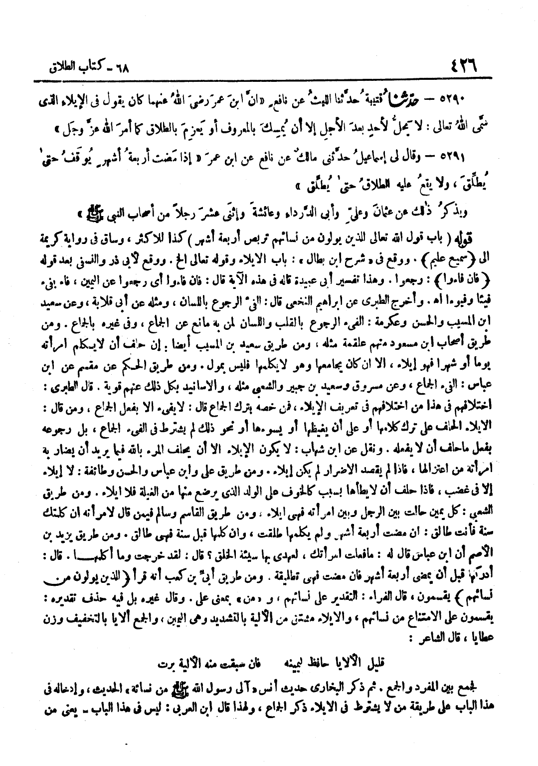 كَذَا لِلْأَكْثَرِ وَسَاقَ فِي رِوَايَةِ كَرِيمَةَ إِلَى سميع عليم وَوَقع فِي شرح بن بطال بَاب الْإِيلَاء وَقَوله تَعَالَى إِلَخْ وَوَقَعَ لِأَبِي ذَرٍّ وَالنَّسَفِيِّ بَعْدَ قَوْله فَإِن فاءوا رَجَعُوا وَهَذَا تَفْسِيرُ أَبِي عُبَيْدَةَ قَالَهُ فِي هَذِه الْآيَة قَالَ فَإِن فاءوا أَيْ رَجَعُوا عَنْ الْيَمِينِ فَاءَ يَفِيءُ فَيْئًا وَفُيُوءًا اه وَأَخْرَجَ الطَّبَرِيُّ عَنْ إِبْرَاهِيمَ النَّخَعِيِّ قَالَ الْفَيْءُ الرُّجُوعُ بِاللِّسَانِ وَمِثْلُهُ عَنْ أَبِي قِلَابَةَ وَعَنْ سَعِيدِ بْنِ الْمُسَيَّبِ وَالْحَسَنِ وَعِكْرِمَةَ الْفَيْءُ الرُّجُوعُ بِالْقَلْبِ وَاللِّسَانِ لِمَنْ بِهِ مَانِعٌ عَنِ الْجِمَاعِ وَفِي غَيْرِهِ بِالْجِمَاعِ وَمِنْ طَرِيقِ أَصْحَاب بن مَسْعُودٍ مِنْهُمْ عَلْقَمَةُ مِثْلُهُ وَمِنْ طَرِيقِ سَعِيدِ بْنِ الْمُسَيَّبِ أَيْضًا إِنْ حَلَفَ أَنْ لَا يُكَلِّمَ امْرَأَتَهُ يَوْمًا أَوْ شَهْرًا فَهُوَ إِيلَاءٌ إِلَّا إِنْ كَانَ يُجَامِعُهَا وَهُوَ لَا يُكَلِّمُهَا فَلَيْسَ بِمُولٍ وَمِنْ طَرِيقِ الْحَكَمِ عَنْ مِقْسَمٍ عَن بن عَبَّاسٍ الْفَيْءُ الْجِمَاعُ وَعَنْ مَسْرُوقٍ وَسَعِيدِ بْنِ جُبَيْرٍ وَالشَّعْبِيِّ مِثْلُهُ وَالْأَسَانِيدُ بِكُلِّ ذَلِكَ عَنْهُمْ قَوِيَّةٌ قَالَ الطَّبَرِيُّ اخْتِلَافُهُمْ فِي هَذَا مِنَ اخْتِلَافِهِمْ فِي تَعْرِيفِ الْإِيلَاءِ فَمَنْ خَصَّهُ بِتَرْكِ الْجِمَاعِ قَالَ لَا يَفِيءُ إِلَّا بِفِعْلِ الْجِمَاعِ وَمَنْ قَالَ الْإِيلَاءُ الْحَلِفُ عَلَى تَرْكِ كَلَامِهَا أَوْ عَلَى أَنْ يَغِيظَهَا أَوْ يَسُوءَهَا أَوْ نَحْوَ ذَلِكَ لَمْ يَشْتَرِطْ فِي الْفَيْءِ الْجِمَاعَ بَلْ رُجُوعُهُ بِفِعْلِ مَا حَلَفَ أَنْ لَا يَفْعَله وَنقل عَن بن شِهَابٍ لَا يَكُونُ الْإِيلَاءُ إِلَّا أَنْ يَحْلِفَ الْمَرْءُ بِاللَّهِ فِيمَا يُرِيدُ أَنْ يُضَارَّ بِهِ امْرَأَتَهُ مِنِ اعْتِزَالِهَا فَإِذَا لَمْ يَقْصِدِ الْإِضْرَارَ لم يكن إِيلَاء وَمن طَرِيق عَليّ وبن عَبَّاسٍ وَالْحَسَنِ وَطَائِفَةٍ لَا إِيلَاءَ إِلَّا فِي غَضَبٍ فَإِذَا حَلَفَ أَنْ لَا يَطَأَهَا بِسَبَبٍ كَالْخَوْفِ عَلَى الْوَلَدِ الَّذِي يَرْضَعُ مِنْهَا مِنَ الْغِيلَةِ فَلَا إِيلَاءَ وَمِنْ طَرِيقِ الشَّعْبِيِّ كُلُّ يَمِين حَالَتْ بَيْنَ الرَّجُلِ وَبَيْنَ امْرَأَتِهِ فَهِيَ إِيلَاءٌ وَمِنْ طَرِيقِ الْقَاسِمِ وَسَالِمٍ فِيمَنْ قَالَ لِامْرَأَتِهِ إِنْ كَلَّمْتُكِ سَنَةً فَأَنْتِ طَالِقٌ إِنْ مَضَتْ أَرْبَعَةُ أَشْهُرٍ وَلَمْ يُكَلِّمِهَا طَلُقَتْ وَإِنْ كَلَّمَهَا قَبْلَ سَنَةٍ فَهِيَ طَالِقٌ وَمِنْ طَرِيقِ يَزِيدَ بْنِ الْأَصَم أَن بن عَبَّاسٍ قَالَ لَهُ مَا فَعَلَتِ امْرَأَتُكَ لَعَهْدِي بِهَا سَيِّئَةُ الْخُلُقِ قَالَ لَقَدْ خَرَجْتُ وَمَا أُكَلِّمُهَا قَالَ أَدْرِكْهَا قَبْلَ أَنْ يَمْضِيَ أَرْبَعَةُ أَشْهُرٍ فَإِنْ مَضَتْ فَهِيَ تَطْلِيقَةٌ وَمِنْ طَرِيقِ أبي بن كَعْب أَنه قَرَأَ الَّذين يولون من نِسَائِهِم يقسمون قَالَ الْفراء التَّقْدِير على نِسَائِهِم وَمن بِمَعْنَى عَلَى وَقَالَ غَيْرُهُ بَلْ فِيهِ حَذْفٌ تَقْدِيرُهُ يَقْسِمُونَ عَلَى الِامْتِنَاعِ مِنْ نِسَائِهِمْ وَالْإِيلَاءُ مُشْتَقٌّ مِنَ الْأَلِيَّةِ بِالتَّشْدِيدِ وَهِيَ الْيَمِينُ وَالْجَمْعُ أَلَايَا بِالتَّخْفِيفِ وَزْنَ عَطَايَا قَالَ الشَّاعِرُ قَلِيلُ الْأَلَايَا حَافِظٌ لِيَمِينِهِ فَإِنْ سَبَقَتْ مِنْهُ الْأَلِيَّةُ بَرَّتِ فَجَمَعَ بَيْنَ الْمُفْرَدِ وَالْجَمْعِ ثُمَّ ذَكَرَ الْبُخَارِيُّ حَدِيثَ أَنَسٍ إِلَى رَسُولِ اللَّهِ صَلَّى اللَّهُ عَلَيْهِ وَسَلَّمَ مِنْ نِسَائِهِ الْحَدِيثَ وَإِدْخَالُهُ فِي هَذَا الْبَابِ عَلَى طَرِيقَةِ مَنْ لَا يَشْتَرِطُ فِي الْإِيلَاءِ ذِكْرَ الْجِم