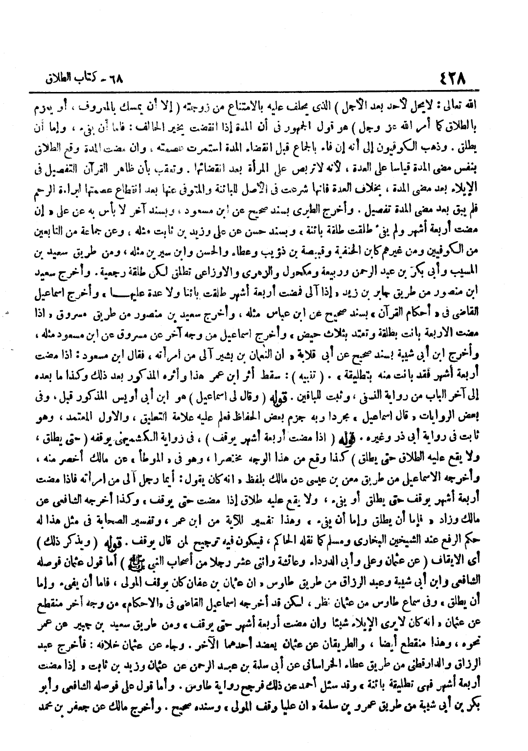 اللَّهُ تَعَالَى لَا يَحِلُّ لِأَحَدٍ بَعْدَ الْأَجَلِ الَّذِي يَحْلِفُ عَلَيْهِ بِالِامْتِنَاعِ مِنْ زَوْجَتِهِ إِلَّا أَن يمسك بِالْمَعْرُوفِ أَو يعزم بِالطَّلَاق كَمَا أَمَرَ اللَّهُ عَزَّ وَجَلَّ هُوَ قَوْلُ الْجُمْهُورِ فِي أَنَّ الْمُدَّةَ إِذَا انْقَضَتْ يُخَيَّرُ الْحَالِفُ فَإِمَّا أَنْ يَفِيءَ وَإِمَّا أَنْ يُطَلِّقَ وَذَهَبَ الْكُوفِيُّونَ إِلَى أَنَّهُ إِنْ فَاءَ بِالْجِمَاعِ قَبْلَ انْقِضَاءِ الْمُدَّةِ اسْتَمَرَّتْ عِصْمَتُهُ وَإِنْ مَضَتِ الْمُدَّةُ وَقَعَ الطَّلَاقُ بِنَفْسِ مُضِيِّ الْمُدَّةِ قِيَاسًا عَلَى الْعِدَّةِ لِأَنَّهُ لَا تَرَبُّصَ عَلَى الْمَرْأَةِ بَعْدَ انْقِضَائِهَا وَتُعُقِّبَ بِأَنَّ ظَاهِرَ الْقُرْآنِ التَّفْصِيلُ فِي الْإِيلَاءِ بَعْدَ مُضِيِّ الْمُدَّةِ بِخِلَافِ الْعِدَّةِ فَإِنَّهَا شُرِعَتْ فِي الْأَصْلِ لِلْبَائِنَةِ وَالْمُتَوَفَّى عَنْهَا بَعْدَ انْقِطَاعِ عِصْمَتِهَا لِبَرَاءَةِ الرَّحِمِ فَلَمْ يَبْقَ بَعْدَ مُضِيِّ الْمُدَّةِ تَفْصِيلٌ وَأَخْرَجَ الطَّبَرِيُّ بِسَنَدٍ صَحِيح عَن بن مَسْعُودٍ وَبِسَنَدٍ آخَرَ لَا بَأْسَ بِهِ عَنْ عَليّ أَن مَضَت أَرْبَعَة اشهر وَلم يفِيء طَلُقَتْ طَلْقَةً بَائِنَةً وَبِسَنَدٍ حَسَنٍ عَنْ عَلِيٍّ وَزَيْدِ بْنِ ثَابِتٍ مِثْلُهُ وَعَنْ جَمَاعَةٍ مِنَ التَّابِعِينَ مِنَ الْكُوفِيِّينَ وَمِنْ غَيْرِهِمْ كَابْنِ الْحَنَفِيَّةَ وَقبيصَة بن ذُؤَيْب وَعَطَاء وَالْحسن وبن سِيرِينَ مِثْلُهُ وَمِنْ طَرِيقِ سَعِيدِ بْنِ الْمُسَيَّبِ وَأَبِي بَكْرِ بْنِ عَبْدِ الرَّحْمَنِ وَرَبِيعَةَ وَمَكْحُولٍ وَالزُّهْرِيِّ وَالْأَوْزَاعِيِّ تَطْلُقُ لَكِنْ طَلْقَةً رَجْعِيَّةً وَأَخْرَجَ سَعِيدُ بْنُ مَنْصُورٍ مِنْ طَرِيقِ جَابِرِ بْنِ زَيْدٍ إِذَا آلَى فَمَضَتْ أَرْبَعَةُ أَشْهُرٍ طَلُقَتْ بَائِنًا وَلَا عِدَّةَ عَلَيْهَا وَأَخْرَجَ إِسْمَاعِيلُ الْقَاضِي فِي أَحْكَامِ الْقُرْآنِ بِسَنَدٍ صَحِيح عَن بن عَبَّاسٍ مِثْلَهُ وَأَخْرَجَ سَعِيدُ بْنُ مَنْصُورٍ مِنْ طَرِيقِ مَسْرُوقٍ إِذَا مَضَتِ الْأَرْبَعَةُ بَانَتْ بِطَلْقَةٍ وَتَعْتَدُّ بِثَلَاثِ حِيَضٍ وَأَخْرَجَ إِسْمَاعِيلُ مِنْ وَجْهٍ آخر عَن مَسْرُوق عَن بن مَسْعُود مثله وَأخرج بن أَبِي شَيْبَةَ بِسَنَدٍ صَحِيحٍ عَنْ أَبِي قِلَابَةَ أَنَّ النُّعْمَانَ بْنَ بَشِيرٍ آلَى مِنِ امْرَأَتِهِ فَقَالَ بن مَسْعُودٍ إِذَا مَضَتْ أَرْبَعَةُ أَشْهُرٍ فَقَدْ بَانَتْ مِنْهُ بتطليقة تَنْبِيه سقط أثر بن عُمَرَ هَذَا وَأَثَرُهُ الْمَذْكُورُ بَعْدَ ذَلِكَ وَكَذَا مَا بَعْدَهُ إِلَى آخِرِ الْبَابِ مِنْ رِوَايَةِ النَّسَفِيِّ وَثَبَتَ لِلْبَاقِينَ قَوْلُهُ وَقَالَ لِي إِسْمَاعِيلُ هُوَ بن أَبِي أُوَيْسٍ الْمَذْكُورُ قَبْلُ وَفِي بَعْضِ الرِّوَايَاتِ قَالَ إِسْمَاعِيلُ مُجَرَّدًا وَبِهِ جَزَمَ بَعْضُ الْحُفَّاظِ فَعَلَّمَ عَلَيْهِ عَلَامَةَ التَّعْلِيقِ وَالْأَوَّلُ الْمُعْتَمَدُ وَهُوَ ثَابِتٌ فِي رِوَايَةِ أَبِي ذَرٍّ وَغَيْرِهِ قَوْلُهُ إِذَا مَضَتْ أَرْبَعَةُ أَشْهُرٍ يُوقَفُ فِي رِوَايَةِ الْكُشْمِيهَنِيِّ يُوقِفُهُ حَتَّى يُطَلِّقَ وَلَا يَقَعُ عَلَيْهِ الطَّلَاقُ حَتَّى يُطَلِّقَ كَذَا وَقَعَ مِنْ هَذَا الْوَجْهِ مُخْتَصَرًا وَهُوَ فِي الْمُوَطَّأِ عَنْ مَالِكٍ أَخَصْرُ مِنْهُ وَأَخْرَجَهُ الْإِسْمَاعِيلِيُّ مِنْ طَرِيقِ مَعْنِ بْنِ عِيسَى عَنْ مَالِكٍ بِلَفْظِ أَنَّهُ كَانَ يَقُولُ أَيُّمَا رَجُلٍ آلَى مِنِ امْرَأَتِهِ فَإِذَا مَضَتْ أَرْبَعَةُ أَشْهُرٍ يُوقَفُ حَتَّى يُطَلِّقَ أَوْ يَفِيءَ وَلَا يَقَعُ عَلَيْهِ طَلَاقٌ إِذَا مَضَتْ حَتَّى يُوقَفَ وَكَذَا أَخْرَجَهُ الشَّافِعِيُّ عَنْ مَالِكٍ وَزَادَ فَإِمَّا أَنْ يُطَلِّقَ وَإِمَّا أَنْ يَفِيء