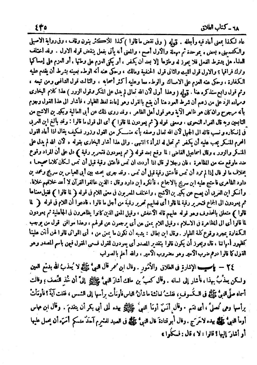 عَادَ لِكَذَا بِمَعْنَى أَعَادَ فِيهِ وَأَبْطَلَهُ قَوْلُهُ وَفِي نَقْضِ مَا قَالُوا كَذَا لِلْأَكْثَرِ بِنُونٍ وَقَافٍ وَفِي رِوَايَةِ الْأَصِيلِيِّ والْكُشْمِيهَنِيِّ بَعْضِ بِمُوَحَّدَةٍ ثُمَّ مُهْمَلَةٍ وَالْأَوَّلُ أَصَحُّ وَالْمَعْنَى أَنَّهُ يَأْتِي بِفِعْلٍ يَنْقُضُ قَوْلَهُ الْأَوَّلَ وَقَدِ اخْتَلَفَ الْعُلَمَاءُ هَلْ يُشْتَرَطُ الْفِعْلُ فَلَا يَجُوزُ لَهُ وَطْؤُهَا إِلَّا بَعْدَ أَنْ يُكَفِّرَ أَوْ يَكْفِي الْعَزْمُ عَلَى وَطْئِهَا أَوِ الْعَزْمُ عَلَى إِمْسَاكِهَا وَتَرْكِ فِرَاقِهَا وَالْأَوَّلُ قَوْلُ اللَّيْثِ وَالثَّانِي قَوْلُ الْحَنَفِيَّةِ وَمَالِكٍ وَحُكِيَ عَنْهُ أَنَّهُ الْوَطْءُ بِعَيْنِهِ بِشَرْطِ أَنْ يُقَدِّمَ عَلَيْهِ الْكَفَّارَةَ وَحُكِيَ عَنْهُ الْعَزْمُ عَلَى الْإِمْسَاكِ وَالْوَطْءِ مَعًا وَعَلَيْهِ أَكْثَرُ أَصْحَابِهِ وَالثَّالِثُ قَوْلُ الشَّافِعِيِّ وَمَنْ تَبِعَهُ وَثَمَّ قَوْلٌ رَابِعٌ سَنَذْكُرُهُ هُنَا قَوْلُهُ وَهَذَا أَوْلَى لِأَنَّ اللَّهَ تَعَالَى لَمْ يَدُلَّ عَلَى الْمُنْكَرِ وَقَوْلِ الزُّورِ هَذَا كَلَامُ الْبُخَارِيِّ وَمُرَادُهُ الرَّدُّ عَلَى مَنْ زَعَمَ أَنَّ شَرْطَ الْعَوْدِ هُنَا أَنْ يَقَعَ بِالْقَوْلِ وَهُوَ إِعَادَةُ لَفْظِ الظِّهَارِ فَأَشَارَ إِلَى هَذَا الْقَوْلِ وَجَزَمَ بِأَنَّهُ مَرْجُوحٌ وَإِنْ كَانَ هُوَ ظَاهِرُ الْآيَةِ وَهُوَ قَوْلُ أَهْلِ الظَّاهِرِ وَقَدْ رُوِيَ ذَلِكَ عَنْ أَبِي الْعَالِيَةِ وَبُكَيْرِ بْنِ الْأَشَجِّ مِنَ التَّابِعِينَ وَبِهِ قَالَ الْفَرَّاءُ النَّحْوِيُّ وَمَعْنَى قَوْلِهِ ثُمَّ يَعُودُونَ لِمَا قَالُوا أَيْ إِلَى قَوْلِ مَا قَالُوا وَقَدْ بَالَغَ بن الْعَرَبِيِّ فِي إِنْكَارِهِ وَنَسَبَ قَائِلَهُ إِلَى الْجَهْلِ لِأَنَّ اللَّهَ تَعَالَى وَصَفَهُ بِأَنَّهُ مُنْكَرٌ مِنَ الْقَوْلِ وَزُورٌ فَكَيْفَ يُقَالُ إِذَا أَعَادَ الْقَوْلَ الْمُحَرَّمَ الْمُنْكَرَ يَجِبُ عَلَيْهِ أَنْ يُكَفِّرَ ثُمَّ تَحِلُّ لَهُ الْمَرْأَةُ انْتَهَى وَإِلَى هَذَا أَشَارَ الْبُخَارِيُّ بِقَوْلِهِ لِأَنَّ اللَّهَ لَمْ يَدُلَّ عَلَى الْمُنْكَرِ وَالزُّورِ وَقَالَ إِسْمَاعِيلُ الْقَاضِي لَمَّا وَقَعَ بعد قَوْله ثمَّ يعودون فَتَحْرِير رَقَبَة دَلَّ عَلَى أَنَّ الْمُرَادَ وُقُوعُ ضِدِّ مَا وَقَعَ مِنْهُ مِنَ الْمُظَاهَرَةِ فَإِنَّ رَجُلًا لَوْ قَالَ إِذَا أَرَدْتَ أَنْ تَمَسَّ فَأَعْتِقْ رَقَبَةً قَبْلَ أَنْ تَمَسَّ لَكَانَ كَلَامًا صَحِيحًا بِخِلَافِ مَا لَوْ قَالَ إِذَا لَمْ تُرِدْ أَنْ تَمَسَّ فَأَعْتِقَ رَقَبَةً قَبْلَ أَنْ تَمَسَّ وَقَدْ جَرَى بَحْثٌ بَيْنَ أَبِي الْعَبَّاسِ بْنِ سُرَيْجٍ وَمُحَمّد بن دَاوُد الظَّاهِرِيّ فاحتج عَلَيْهِ بن سُرَيج بِالْإِجْمَاع فَأنكرهُ بن دَاوُدَ وَقَالَ الَّذِينَ خَالَفُوا الْقُرْآنَ لَا أَعُدُّ خلافهم خلافًا وَأنكر بن الْعَرَبِيّ أَن يَصح عَن بكير بن الْأَشَجِّ وَاخْتَلَفَ الْمُعْرِبُونَ فِي مَعْنَى اللَّامِ فِي قَوْله لما قَالُوا فَقِيلَ مَعْنَاهَا ثُمَّ يَعُودُونَ إِلَى الْجِمَاعِ فَتَحْرِيرُ رَقَبَةٍ لِمَا قَالُوا أَيْ فَعَلَيْهِمْ تَحْرِيرُ رَقَبَةٍ مِنْ أَجْلِ مَا قَالُوا فَادَّعَوْا أَنَّ اللَّامَ فِي قَوْله لما قَالُوا مُتَعَلِّقٌ بِالْمَحْذُوفِ وَهُوَ قَوْلُهُ عَلَيْهِمْ قَالَهُ الْأَخْفَشُ وَقِيلَ الْمَعْنَى الَّذِينَ كَانُوا يُظَاهِرُونَ فِي الْجَاهِلِيَّةِ ثُمَّ يَعُودُونَ لِمَا قَالُوا أَيْ إِلَى الْمُظَاهَرَةِ فِي الْإِسْلَامِ وَقِيلَ اللَّامُ بِمَعْنَى عَنْ أَيْ يَرْجِعُونَ عَنْ قَوْلِهِمْ وَهَذَا مُوَافِقٌ قَوْلَ مَنْ يُوَجِّبُ الْكَفَّارَةَ بِمُجَرَّدِ وُقُوعِ كَلِمَةِ الظِّهَارِ وَقَالَ بن بَطَّالٍ يُشْبِهُ أَنْ تَكُونَ مَ