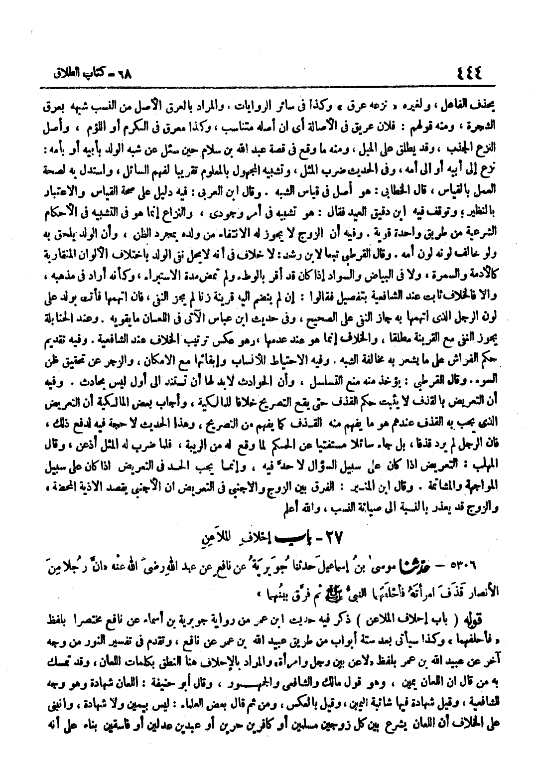 ذَكَرَ فِيهِ حَدِيثَ بن عُمَرَ مِنْ رِوَايَةِ جُوَيْرِيَةَ بْنِ أَسْمَاءَ عَنْ نَافِعٍ مُخْتَصَرًا بِلَفْظِ فَأَحْلَفَهُمَا وَكَذَا سَيَأْتِي بَعْدَ سِتَّةِ أَبْوَابٍ مِنْ طَرِيقِ عُبَيْدِ اللَّهِ بْنِ عُمَرَ عَنْ نَافِعٍ وَتَقَدَّمَ فِي تَفْسِيرِ النُّورِ مِنْ وَجْهٍ آخَرَ عَنْ عُبَيْدِ اللَّهِ بْنِ عُمَرَ بِلَفْظِ لَاعَنَ بَيْنَ رَجُلٍ وَامْرَأَةٍ وَالْمُرَادُ بِالْإِحْلَافِ هُنَا النُّطْقُ بِكَلِمَاتِ اللِّعَانِ وَقَدْ تَمَسَّكَ بِهِ مَنْ قَالَ إِنَّ اللِّعَانَ يَمِينٌ وَهُوَ قَوْلُ مَالِكٍ وَالشَّافِعِيِّ وَالْجُمْهُورِ وَقَالَ أَبُو حَنِيفَةَ اللِّعَانُ شَهَادَةٌ وَهُوَ وَجْهٌ لِلشَّافِعِيَّةِ وَقِيلَ شَهَادَةٌ فِيهَا شَائِبَةُ الْيَمِينِ وَقِيلَ بِالْعَكْسِ وَمِنْ ثَمَّ قَالَ بَعْضُ الْعُلَمَاءِ لَيْسَ بِيَمِينٍ وَلَا شَهَادَةٍ وَانْبَنَى عَلَى الْخِلَافِ أَنَّ اللِّعَانَ يُشْرَعُ بَيْنَ كُلِّ زَوْجَيْنِ مُسْلِمَيْنِ أَوْ كَافِرَيْنِ حُرَّيْنِ أَوْ عَبْدَيْنِ عَدْلَيْنِ أَوْ فَاسِقَيْنِ بِنَاءً عَلَى أَنَّهُ