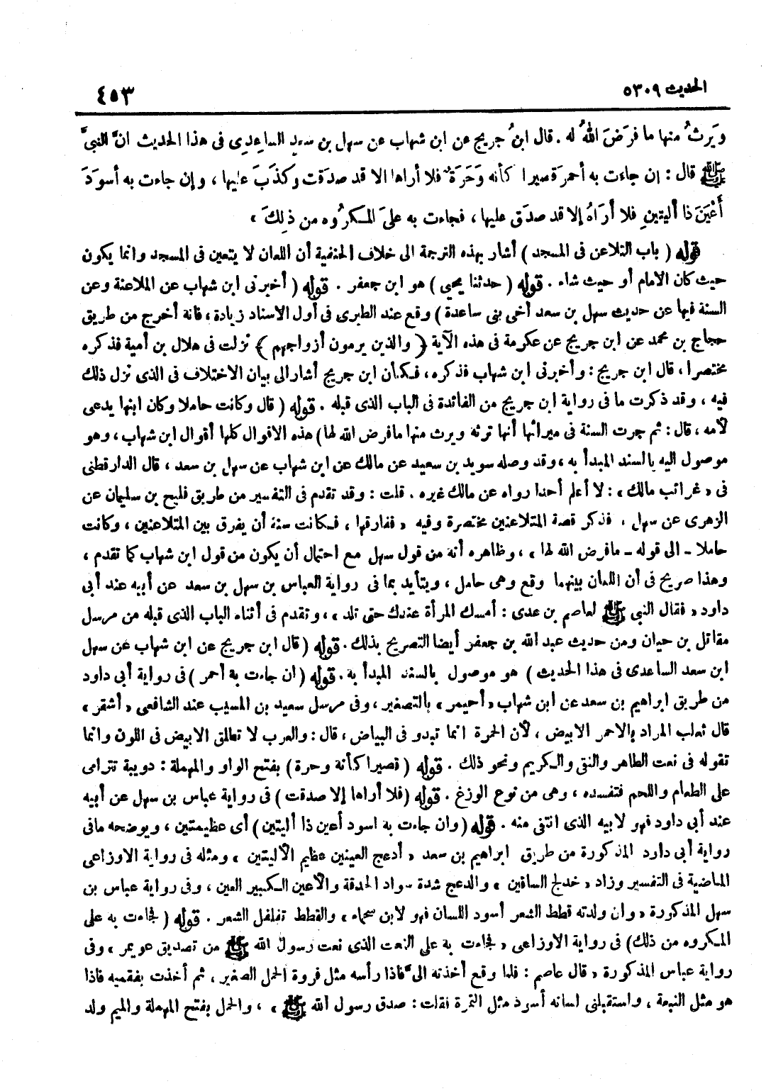 [5309] قَوْلُهُ حَدَّثَنَا يَحْيَى هُوَ بن جَعْفَر قَوْله أَخْبرنِي بن شِهَابٍ عَنِ الْمُلَاعَنَةِ وَعَنِ السُّنَّةِ فِيهَا عَنْ حَدِيثِ سَهْلِ بْنِ سَعْدٍ أَخِي بَنِي سَاعِدَةَ وَقَعَ عِنْدَ الطَّبَرِيِّ فِي أَوَّلِ الْإِسْنَادِ زِيَادَةٌ فَإِنَّهُ أَخْرَجَ مِنْ طَرِيقِ حَجَّاجِ بْنِ مُحَمَّدٍ عَن بن جريج عَن عِكْرِمَة فِي هَذِه الْآيَة وَالَّذِي يرْمونَ ازواجهم نَزَلَتْ فِي هِلَالِ بْنِ أُمَيَّةَ فَذَكَرَهُ مُخْتَصَرًا قَالَ بن جريج وَأَخْبرنِي بن شهَاب فَذكره فَكَأَن بن جُرَيْجٍ أَشَارَ إِلَى بَيَانِ الِاخْتِلَافِ فِي الَّذِي نَزَلَ ذَلِكَ فِيهِ وَقَدْ ذَكَرْتُ مَا فِي رِوَايَة بن جُرَيْجٍ مِنَ الْفَائِدَةِ فِي الْبَابِ الَّذِي قَبْلَهُ قَوْلُهُ قَالَ وَكَانَتْ حَامِلًا وَكَانَ ابْنُهَا يُدْعَى لِأُمِّهِ قَالَ ثُمَّ جَرَتِ السُّنَّةُ فِي مِيرَاثِهَا أَنَّهَا تَرِثُهُ وَيَرِثُ مِنْهَا مَا فَرَضَ اللَّهُ لَهَا هَذِه الْأَقْوَال كلهَا أَقْوَال بن شِهَابٍ وَهُوَ مَوْصُولٌ إِلَيْهِ بِالسَّنَدِ الْمُبْدَأِ بِهِ وَقَدْ وَصَلَهُ سُوَيْدُ بْنُ سَعِيدٍ عَنْ مَالِكٍ عَن بن شِهَابٍ عَنْ سَهْلِ بْنِ سَعْدٍ قَالَ الدَّارَقُطْنِيُّ فِي غَرَائِبِ مَالِكٍ لَا أَعْلَمُ أَحَدًا رَوَاهُ عَنْ مَالِكٍ غَيْرَهُ قُلْتُ وَقَدْ تَقَدَّمَ فِي التَّفْسِيرِ مِنْ طَرِيقِ فُلَيْحِ بْنِ سُلَيْمَانَ عَنِ الزُّهْرِيِّ عَنْ سَهْلٍ فَذَكَرَ قِصَّةَ الْمُتَلَاعِنَيْنِ مُخْتَصَرَةً وَفِيهِ فَفَارَقَهَا فَكَانَتْ سُنَّةً أَنْ يُفَرَّقَ بَيْنَ الْمُتَلَاعِنَيْنِ وَكَانَتْ حَامِلًا إِلَى قَوْلِهِ مَا فَرَضَ الله لَهَا وَظَاهره أَنَّهُ مِنْ قَوْلِ سَهْلٍ مَعَ احْتِمَالِ أَنْ يكون من قَول بن شِهَابٍ كَمَا تَقَدَّمَ وَهَذَا صَرِيحٌ فِي أَنَّ اللِّعَانِ بَيْنَهُمَا وَقَعَ وَهِيَ حَامِلٌ وَيَتَأَيَّدُ بِمَا فِي رِوَايَةِ الْعَبَّاسِ بْنِ سَهْلِ بْنِ سَعْدٍ عَنْ أَبِيهِ عِنْدَ أَبِي دَاوُدَ فَقَالَ النَّبِيُّ صَلَّى اللَّهُ عَلَيْهِ وَسَلَّمَ لِعَاصِمِ بْنِ عَدِيٍّ أَمْسِكِ الْمَرْأَةَ عِنْدَكَ حَتَّى تَلِدَ وَتَقَدَّمَ فِي أَثْنَاءِ الْبَابِ الَّذِي قَبْلَهُ مِنْ مُرْسَلِ مُقَاتِلِ بْنِ حَيَّانَ وَمِنْ حَدِيثِ عَبْدِ اللَّهِ بْنِ جَعْفَر أَيْضا التَّصْرِيح بذلك قَوْله قَالَ بن جريج عَن بن شِهَابٍ عَنْ سَهْلِ بْنِ سَعْدٍ السَّاعِدِيِّ فِي هَذَا الْحَدِيثِ هُوَ مَوْصُولٌ بِالسَّنَدِ الْمُبْدَأِ بِهِ قَوْلُهُ إِنْ جَاءَتْ بِهِ أَحْمَرَ فِي رِوَايَةِ أَبِي دَاوُدَ مِنْ طَرِيقِ إِبْرَاهِيمَ بْنِ سَعْدٍ عَن بن شِهَابٍ أُحَيْمِرَ بِالتَّصْغِيرِ وَفِي مُرْسَلِ سَعِيدِ بْنِ الْمُسَيَّبِ عِنْدَ الشَّافِعِيِّ أَشْقَرَ قَالَ ثَعْلَبٌ الْمُرَادُ بِالْأَحْمَرِ الْأَبْيَضُ لِأَنَّ الْحُمْرَةَ إِنَّمَا تَبْدُو فِي الْبَيَاضِ قَالَ وَالْعَرَبُ لَا تُطْلِقُ الْأَبْيَضَ فِي اللَّوْنِ وَإِنَّمَا تَقُولُهُ فِي نَعْتِ الطَّاهِرِ وَالنَّقِيِّ وَالْكَرِيمِ وَنَحْوِ ذَلِكَ قَوْلُهُ قَصِيرًا كَأَنَّهُ وَحَرَةٌ بِفَتْحِ الْوَاوِ وَالْمُهْمَلَةِ دُوَيْبَةٌ تَتَرَامَى عَلَى الطَّعَامِ وَاللَّحْمِ فَتُفْسِدُهُ وَهِيَ مِنْ نَوْعِ الْوَزَغِ قَوْلُهُ فَلَا أَرَاهَا إِلَّا صَدَقَتْ فِي رِوَايَةِ عَبَّاسِ بْنِ سَهْلٍ عَنْ أَبِيهِ عِنْدَ أَبِي دَاوُدَ فَهُوَ لِأَبِيهِ الَّذِي انْتَفَى مِنْهُ قَوْلُهُ وَإِنْ جَاءَتْ بِهِ أَسْوَدَ أَعْيَنَ ذَا أَلْيَتَيْنِ أَيْ عَظِيمَتَيْنِ وَيُوَضِّحُهُ مَا فِي رِوَايَةِ أَبِي دَاوُدَ الْمَذْكُورَةِ مِنْ طَرِيقِ إِبْرَاهِيمَ بْنِ سَعْدٍ أَدْعَجَ الْعَيْنَيْنِ عَظِيمَ الْأَلْيَتَيْنِ وَمِثْلُهُ فِي رِوَايَةِ الْأَوْزَاعِيِّ الْمَاضِيَةِ فِي التَّفْسِيرِ وَزَادَ خَدَلَّجَ السَّاقَيْنِ وَالدَ