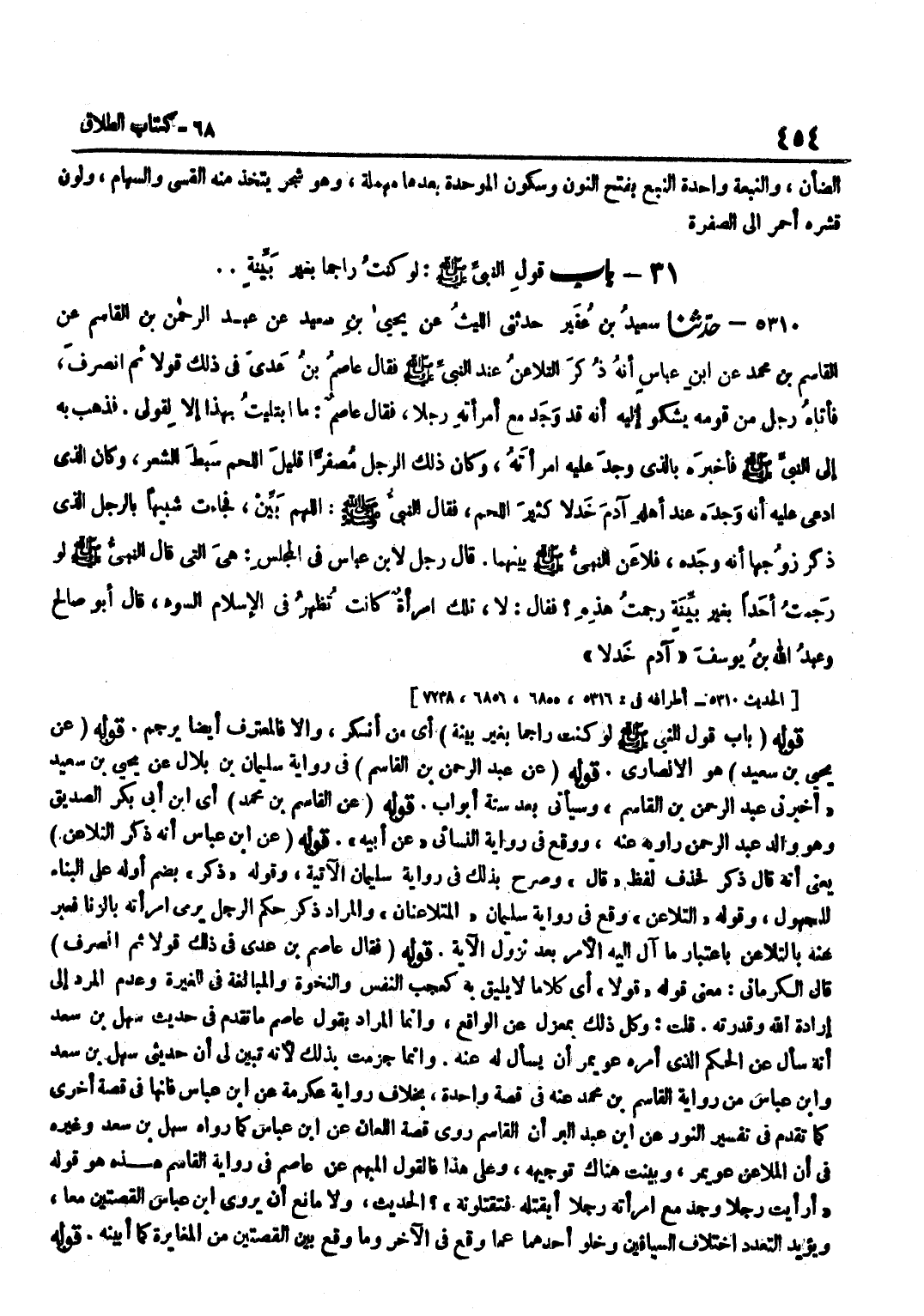 [5310] قَوْلُهُ عَنْ يَحْيَى بْنِ سَعِيدٍ هُوَ الْأَنْصَارِيُّ قَوْلُهُ عَنْ عَبْدِ الرَّحْمَنِ بْنِ الْقَاسِمِ فِي رِوَايَةِ سُلَيْمَانَ بْنِ بِلَالٍ عَنْ يَحْيَى بْنِ سَعِيدٍ أَخْبَرَنِي عَبْدُ الرَّحْمَنِ بْنُ الْقَاسِمِ وَسَيَأْتِي بَعْدَ سِتَّةِ أَبْوَابٍ قَوْلُهُ عَنِ الْقَاسِمِ بْنِ مُحَمَّدٍ أَي بن أَبِي بَكْرٍ الصِّدِّيقِ وَهُوَ وَالِدُ عَبْدِ الرَّحْمَنِ رَاوِيهِ عَنْهُ وَوَقَعَ فِي رِوَايَةِ النَّسَائِيِّ عَنْ أَبِيه قَوْله عَن بن عَبَّاسٍ أَنَّهُ ذُكِرَ التَّلَاعُنُ يَعْنِي أَنَّهُ قَالَ ذَكَرَ فَحَذَفَ لَفْظَ قَالَ وَصَرَّحَ بِذَلِكَ فِي رِوَايَةِ سُلَيْمَانَ الْآتِيَةِ وَقَوْلُهُ ذُكِرَ بِضَمِّ أَوَّلِهِ عَلَى الْبِنَاءِ لِلْمَجْهُولِ وَقَوْلُهُ التَّلَاعُنُ وَقَعَ فِي رِوَايَةِ سُلَيْمَانَ الْمُتَلَاعِنَانِ وَالْمُرَادُ ذِكْرُ حُكْمِ الرَّجُلِ يَرْمِي امْرَأَتَهُ بِالزِّنَا فَعَبَّرَ عَنْهُ بِالتَّلَاعُنِ بِاعْتِبَارِ مَا آلَ إِلَيْهِ الْأَمْرُ بَعْدَ نُزُولِ الْآيَةِ قَوْلُهُ فَقَالَ عَاصِمُ بْنُ عَدِيٍّ فِي ذَلِكَ قَوْلًا ثُمَّ انْصَرَفَ قَالَ الْكِرْمَانِيُّ مَعْنَى قَوْلِهِ قَوْلًا أَيْ كَلَامًا لَا يَلِيقُ بِهِ كَعُجْبِ النَّفْسِ وَالنَّخْوَةِ وَالْمُبَالَغَةِ فِي الْغَيْرَةِ وَعَدَمِ الْمَرَدِّ إِلَى إِرَادَةِ اللَّهِ وَقُدْرَتِهِ قُلْتُ وَكُلُّ ذَلِكَ بِمَعْزِلٍ عَنِ الْوَاقِعِ وَإِنَّمَا الْمُرَادُ بِقَوْلِ عَاصِمٍ مَا تَقَدَّمَ فِي حَدِيثِ سَهْلِ بْنِ سَعْدٍ أَنَّهُ سَأَلَ عَنِ الْحُكْمِ الَّذِي أَمَرَهُ عُوَيْمِرٌ أَنْ يَسْأَلَ لَهُ عَنْهُ وَإِنَّمَا جَزَمْتُ بِذَلِكَ لِأَنَّهُ تَبَيَّنَ لِي أَنَّ حَدِيثَيْ سَهْلِ بْنِ سعد وبن عَبَّاسٍ مِنْ رِوَايَةِ الْقَاسِمِ بْنِ مُحَمَّدٍ عَنْهُ فِي قِصَّةٍ وَاحِدَةٍ بِخِلَافِ رِوَايَةِ عِكْرِمَةَ عَنِ بن عَبَّاسٍ فَإِنَّهَا فِي قِصَّةٍ أُخْرَى كَمَا تَقَدَّمَ فِي تَفْسِير النُّور عَن بن عَبْدِ الْبَرِّ أَنَّ الْقَاسِمَ رَوَى قِصَّةَ اللِّعَانِ عَن بن عَبَّاسٍ كَمَا رَوَاهُ سَهْلُ بْنُ سَعْدٍ وَغَيْرُهُ فِي أَنَّ الْمُلَاعِنَ عُوَيْمِرٌ وَبَيَّنْتُ هُنَاكَ تَوْجِيهَهُ وَعَلَى هَذَا فَالْقَوْلُ الْمُبْهَمُ عَنْ عَاصِمٍ فِي رِوَايَةِ الْقَاسِمِ هَذِهِ هُوَ قَوْلُهُ أَرَأَيْتَ رَجُلًا وَجَدَ مَعَ امْرَأَتِهِ رَجُلًا أَيَقْتُلُهُ فَتَقْتُلُونَهُ الْحَدِيثَ وَلَا مَانع أَن يروي بن عَبَّاسٍ الْقِصَّتَيْنِ مَعًا وَيُؤَيِّدُ التَّعَدُّدَ اخْتِلَافُ السِّيَاقَيْنِ وَخُلُوُّ أَحَدِهِمَا عَمَّا وَقَعَ فِي الْآخَرِ وَمَا وَقَعَ بَيْنَ الْقِصَّتَيْنِ مِنَ الْمُغَايَرَةِ كَمَا أُبَيِّنُهُ قَوْله