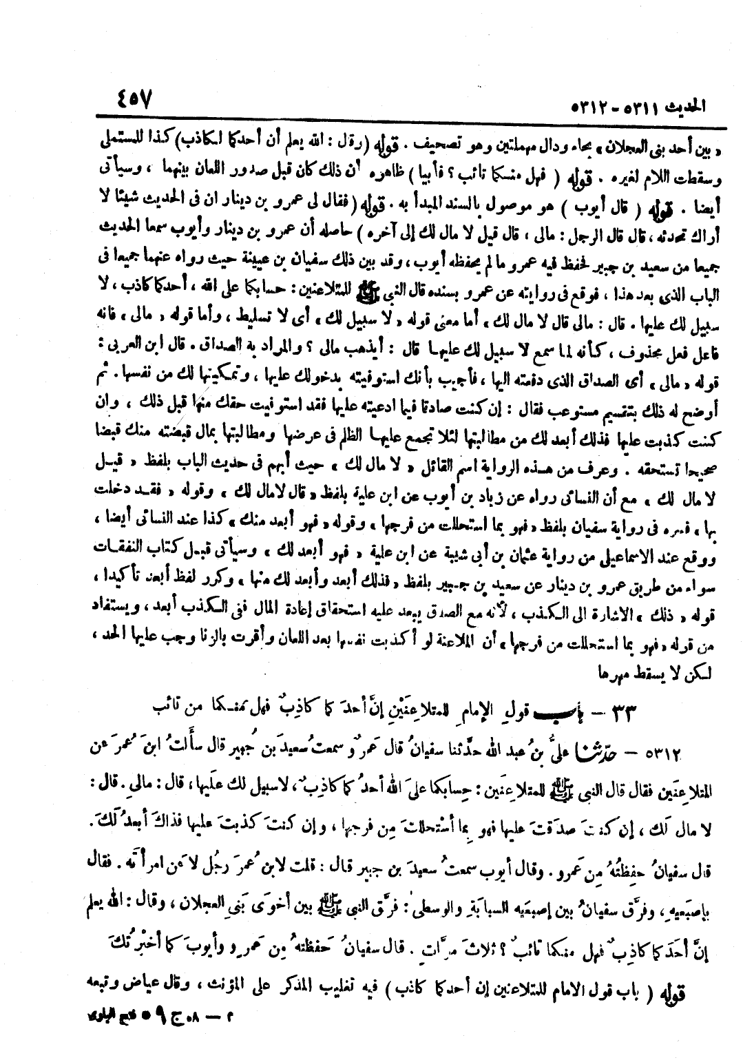 بَيْنَ أَحَدِ بَنِي الْعَجْلَانِ بِحَاءٍ وَدَالٍ مُهْمَلَتَيْنِ وَهُوَ تَصْحِيفٌ قَوْلُهُ وَقَالَ اللَّهُ يَعْلَمُ إِنَّ أَحَدَكُمَا لَكَاذِبٌ كَذَا لِلْمُسْتَمْلِي وَسَقَطَتِ اللَّامُ لِغَيْرِهِ قَوْلُهُ فَهَلْ مِنْكُمَا تَائِبٌ فَأَبَيَا ظَاهِرُهُ أَنَّ ذَلِكَ كَانَ قَبْلَ صُدُورِ اللِّعَانِ بَيْنَهُمَا وَسَيَأْتِي أَيْضًا قَوْلُهُ قَالَ أَيُّوبُ هُوَ مَوْصُولٌ بِالسَّنَدِ الْمُبْدَأِ بِهِ قَوْلُهُ فَقَالَ لِي عَمْرُو بْنُ دِينَارٍ أَنَّ فِي الْحَدِيثِ شَيْئًا لَا أَرَاكَ تُحَدِّثُهُ قَالَ قَالَ الرَّجُلُ مَالِي قَالَ قِيلَ لَا مَالَ لَكَ إِلَى آخِرِهِ حَاصِلُهُ أَنَّ عَمْرَو بْنَ دِينَارٍ وَأَيُّوبَ سَمِعَا الْحَدِيثَ جَمِيعًا مِنْ سَعِيدِ بْنِ جُبَيْرٍ فَحَفِظَ فِيهِ عَمْرٌو مَا لَمْ يَحْفَظْهُ أَيُّوبُ وَقَدْ بَيَّنَ ذَلِكَ سُفْيَانُ بْنُ عُيَيْنَةَ حَيْثُ رَوَاهُ عَنْهُمَا جَمِيعًا فِي الْبَابِ الَّذِي بَعْدَ هَذَا فَوَقَعَ فِي رِوَايَتِهِ عَنْ عَمْرٍو بِسَنَدِهِ قَالَ النَّبِيُّ صَلَّى اللَّهُ عَلَيْهِ وَسَلَّمَ لِلْمُتَلَاعِنَيْنِ حِسَابُكُمَا عَلَى اللَّهِ أَحَدُكُمَا كَاذِبٌ لَا سَبِيلَ لَكَ عَلَيْهَا قَالَ مَالِي قَالَ لَا مَالَ لَكَ أَمَّا مَعْنَى قَوْلِهِ لَا سَبِيلَ لَكَ أَيْ لَا تَسْلِيطَ وَأَمَّا قَوْلُهُ مَالِي فَإِنَّهُ فَاعِلُ فِعْلٍ مَحْذُوفٍ كَأَنَّهُ لَمَّا سَمِعَ لَا سَبِيلَ لَكَ عَلَيْهَا قَالَ أَيَذْهَبُ مَالِي وَالْمُرَادُ بِهِ الصَّدَاقُ قَالَ بن الْعَرَبِيِّ قَوْلُهُ مَالِي أَيِ الصَّدَاقُ الَّذِي دَفَعْتُهُ إِلَيْهَا فَأُجِيبَ بِأَنَّكَ اسْتَوْفَيْتَهُ بِدُخُولِكَ عَلَيْهَا وَتَمْكِينِهَا لَكَ مِنْ نَفْسِهَا ثُمَّ أَوْضَحَ لَهُ ذَلِكَ بِتَقْسِيمٍ مُسْتَوْعَبٍ فَقَالَ إِنْ كُنْتَ صَادِقًا فِيمَا ادَّعَيْتَهُ عَلَيْهَا فَقَدِ اسْتَوْفَيْتَ حَقَّكَ مِنْهَا قَبْلَ ذَلِكَ وَإِنْ كُنْتَ كَذَبْتَ عَلَيْهَا فَذَلِكَ أَبْعَدُ لَكَ مِنْ مُطَالَبَتِهَا لِئَلَّا تَجْمَعَ عَلَيْهَا الظُّلْمَ فِي عِرْضِهَا وَمُطَالَبَتِهَا بِمَالٍ قَبَضَتْهُ مِنْكَ قَبْضًا صَحِيحًا تَسْتَحِقُّهُ وَعُرِفَ مِنْ هَذِهِ الرِّوَايَةِ اسْمُ الْقَائِلِ لَا مَالَ لَكَ حَيْثُ أُبْهِمَ فِي حَدِيثِ الْبَابِ بِلَفْظِ قِيلَ لَا مَالَ لَكَ مَعَ أَنَّ النَّسَائِيَّ رَوَاهُ عَنْ زِيَادِ بْنِ أَيُّوب عَن بن عُلَيَّةَ بِلَفْظِ قَالَ لَا مَالَ لَكَ وَقَوْلُهُ فَقَدْ دَخَلْتَ بِهَا فَسَّرَهُ فِي رِوَايَةِ سُفْيَانَ بِلَفْظِ فَهُوَ بِمَا اسْتَحْلَلْتَ مِنْ فَرْجِهَا وَقَوْلُهُ فَهُوَ أَبْعَدُ مِنْكَ كَذَا عِنْدَ النَّسَائِيِّ أَيْضًا وَوَقَعَ عِنْدَ الْإِسْمَاعِيلِيِّ مِنْ رِوَايَةِ عُثْمَانَ بْنِ أَبِي شَيْبَةَ عَنْ بن عُلَيَّةَ فَهُوَ أَبْعَدُ لَكَ وَسَيَأْتِي قَبْلَ كِتَابِ النَّفَقَاتِ سَوَاءً مِنْ طَرِيقِ عَمْرُو بْنُ دِينَارٍ عَنْ سَعِيدِ بْنِ جُبَيْرٍ بِلَفْظِ فَذَلِكَ أَبْعَدُ وَأَبْعَدُ لَكَ مِنْهَا وَكَرَّرَ لَفْظَ أَبْعَدُ تَأْكِيدًا قَوْلُهُ ذَلِكَ الْإِشَارَةُ إِلَى الْكَذِبِ لِأَنَّهُ مَعَ الصِّدْقِ يَبْعُدُ عَلَيْهِ اسْتِحْقَاقُ إِعَادَةِ الْمَالِ فَفِي الْكَذِبِ أَبْعَدُ وَيُسْتَفَادُ مِنْ قَوْلِهِ فَهُوَ بِمَا اسْتَحْلَلْتَ مِنْ فَرْجِهَا أَنَّ الْمُلَاعَنَةَ لَوْ أَكَذَبَتْ نَفْسَهَا بَعْدَ اللِّعَانِ وَأَقَرَّتْ بِالزِّنَا وَجَبَ عَلَيْهَا الْحَد لَكِن لَا يسْقط مهرهَا