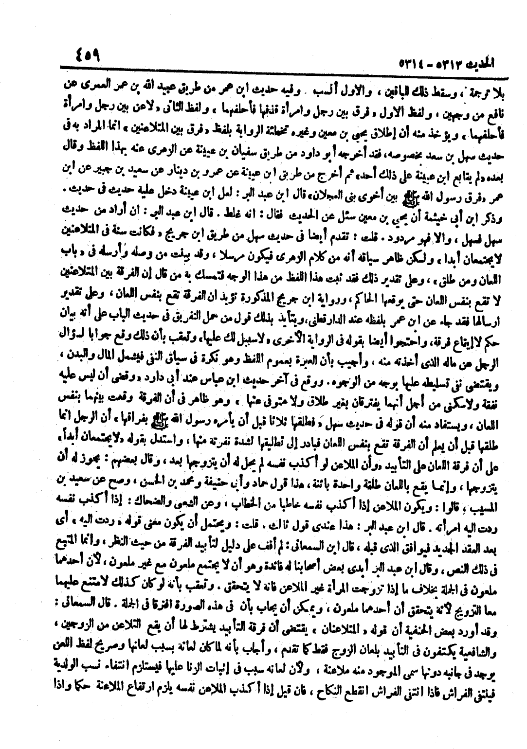 بِلَا تَرْجَمَةٍ وَسَقَطَ ذَلِكَ لِلْبَاقِينَ وَالْأَوَّلُ أَنْسَبُ وَفِيه حَدِيث بن عُمَرَ مِنْ طَرِيقِ عُبَيْدِ اللَّهِ بْنِ عُمَرَ الْعُمَرِيِّ عَنْ نَافِعٍ مِنْ وَجْهَيْنِ وَلَفْظُ الْأَوَّلِ فَرَّقَ بَيْنَ رَجُلٍ وَامْرَأَةٍ قَذَفَهَا فَأَحْلَفَهُمَا وَلَفْظُ الثَّانِي لَاعَنَ بَيْنَ رَجُلٍ وَامْرَأَةٍ فَأَحْلَفَهُمَا وَيُؤْخَذُ مِنْهُ أَنَّ إِطْلَاقَ يَحْيَى بْنِ مَعِينٍ وَغَيْرِهِ تَخْطِئَةَ الرِّوَايَةِ بِلَفْظِ فَرَّقَ بَيْنَ الْمُتَلَاعِنَيْنِ إِنَّمَا الْمُرَادُ بِهِ فِي حَدِيثِ سَهْلِ بْنِ سَعْدٍ بِخُصُوصِهِ فَقَدْ أَخْرَجَهُ أَبُو دَاوُدَ مِنْ طَرِيقِ سُفْيَانَ بْنِ عُيَيْنَةَ عَنِ الزُّهْرِيِّ عَنْهُ بِهَذَا اللَّفْظ وَقَالَ بعده لم يُتَابع بن عُيَيْنَةَ عَلَى ذَلِكَ أَحَدٌ ثُمَّ أَخْرَجَ مِنْ طَرِيق بْنِ عُيَيْنَةَ عَنْ عَمْرُو بْنُ دِينَارٍ عَنْ سَعِيدِ بْنِ جُبَيْرٍ عَن بن عُمَرَ فَرَّقَ رَسُولُ اللَّهِ صَلَّى اللَّهُ عَلَيْهِ وَسَلَّمَ بَيْنَ اخوي بني العجلان قَالَ بن عبد الْبر لَعَلَّ بن عُيَيْنَةَ دَخَلَ عَلَيْهِ حَدِيثٌ فِي حَدِيثٍ وَذَكَرَ بن أَبِي خَيْثَمَةَ أَنَّ يَحْيَى بْنَ مَعِينٍ سُئِلَ عَن الحَدِيث فَقَالَ أَنه غلط قَالَ بن عَبْدِ الْبَرِّ إِنْ أَرَادَ مِنْ حَدِيثِ سَهْلٍ فَسَهْلٌ وَإِلَّا فَهُوَ مَرْدُودٌ قُلْتُ تَقَدَّمَ أَيْضًا فِي حَدِيث سهل من طَرِيق بن جُرَيْجٍ فَكَانَتْ سُنَّةً فِي الْمُتَلَاعِنَيْنِ لَا يَجْتَمِعَانِ أَبَدًا وَلَكِنَّ ظَاهِرَ سِيَاقِهِ أَنَّهُ مِنْ كَلَامِ الزُّهْرِيِّ فَيَكُونُ مُرْسَلًا وَقَدْ بَيَّنْتُ مَنْ وَصَلَهُ وَأَرْسَلَهُ فِي بَابِ اللِّعَانِ وَمَنْ طَلَّقَ وَعَلَى تَقْدِيرِ ذَلِكَ فَقَدْ ثَبَتَ هَذَا اللَّفْظُ مِنْ هَذَا الْوَجْهِ فَتَمَسَّكَ بِهِ مَنْ قَالَ إِنَّ الْفُرْقَةَ بَيْنَ الْمُتَلَاعِنَيْنِ لَا تَقَعُ بِنَفْسِ اللِّعَانِ حَتَّى يوقعها الْحَاكِم وَرِوَايَة بن جُرَيْجٍ الْمَذْكُورَةُ تُؤَيِّدُ أَنَّ الْفُرْقَةَ تَقَعُ بِنَفْسِ اللِّعَانِ وَعَلَى تَقْدِيرِ إِرْسَالِهَا فَقَدْ جَاءَ عَنِ بن عُمَرَ بِلَفْظِهِ عِنْدَ الدَّارَقُطْنِيِّ وَيَتَأَيَّدُ بِذَلِكَ قَوْلُ مَنْ حَمَلَ التَّفْرِيقَ فِي حَدِيثِ الْبَابِ عَلَى أَنَّهُ بَيَانُ حُكْمٍ لَا إِيقَاعُ فُرْقَةٍ وَاحْتَجُّوا أَيْضًا بِقَوْلِهِ فِي الرِّوَايَةِ الْأُخْرَى لَا سَبِيلَ لَكَ عَلَيْهَا وَتُعُقِّبَ بِأَنَّ ذَلِكَ وَقَعَ جَوَابًا لِسُؤَالِ الرَّجُلِ عَنْ مَالِهِ الَّذِي أَخَذَتْهُ مِنْهُ وَأُجِيبَ بِأَنَّ الْعِبْرَةَ بِعُمُومِ اللَّفْظِ وَهُوَ نَكِرَةٌ فِي سِيَاقِ النَّفْيِ فَيَشْمَلُ الْمَالَ وَالْبَدَنَ وَيَقْتَضِي نَفْيَ تَسْلِيطِهِ عَلَيْهَا بِوَجْهٍ مِنَ الْوُجُوهِ وَوَقَعَ فِي آخر حَدِيث بن عَبَّاسٍ عِنْدَ أَبِي دَاوُدَ وَقَضَى أَنْ لَيْسَ عَلَيْهِ نَفَقَةٌ وَلَا سُكْنَى مِنْ أَجْلِ أَنَّهُمَا يَفْتَرِقَانِ بِغَيْرِ طَلَاقٍ وَلَا مُتَوَفَّى عَنْهَا وَهُوَ ظَاهِرٌ فِي أَنَّ الْفُرْقَةَ وَقَعَتْ بَيْنَهُمَا بِنَفْسِ اللِّعَانِ وَيُسْتَفَادُ مِنْهُ أَنَّ قَوْلَهُ فِي حَدِيثِ سَهْلٍ فَطَلَّقَهَا ثَلَاثًا قَبْلَ أَنْ يَأْمُرَهُ رَسُولُ اللَّهِ صَلَّى اللَّهُ عَلَيْهِ وَسَلَّمَ بِفِرَاقِهَا أَنَّ الرَّجُلَ إِنَّمَا طَلَّقَهَا قَبْلَ أَنْ يَعْلَمَ أَنَّ الْفُرْقَةَ تَقَعُ بِنَفْسِ اللِّعَانِ فَبَادَرَ إِلَى تَطْلِيقِهَا لِشِدَّةِ نُفْرَتِهِ مِنْهَا وَاسْتَدَلَّ بِقَوْلِهِ لَا يَجْتَمِعَانِ أَبَدًا عَلَى أَنَّ فُرْقَةَ اللِّعَانِ عَلَى التَّأْبِيدِ وَأَنَّ الْمُلَاعِنَ لَوْ أَكَذَبَ نَفْسَهُ لَمْ يَحِلَّ لَهُ أَنْ يَتَزَوَّجَهَا بَعْدُ وَقَالَ بَعْضُهُمْ يَجُوزُ لَهُ أَنْ يَتَزَوَّجَهَا وَإِنَّمَا يَقَعُ بِاللَّعَ