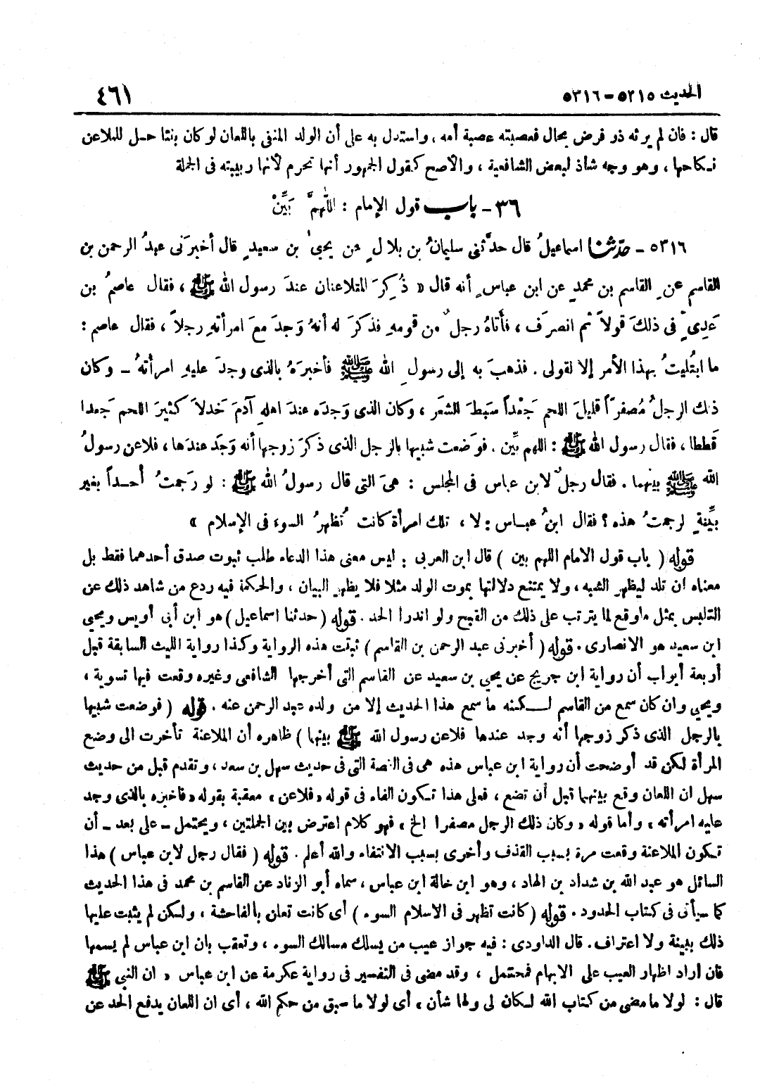 [5316] قَوْله حَدثنَا إِسْمَاعِيل هُوَ بن أَبِي أُوَيْسٍ وَيَحْيَى بْنُ سَعِيدٍ هُوَ الْأَنْصَارِيُّ قَوْلُهُ أَخْبَرَنِي عَبْدُ الرَّحْمَنِ بْنُ الْقَاسِمِ ثَبَتَتْ هَذِهِ الرِّوَايَةُ وَكَذَا رِوَايَةُ اللَّيْثِ السَّابِقَةُ قَبْلَ أَرْبَعَة أَبْوَاب أَن رِوَايَة بن جُرَيْجٍ عَنْ يَحْيَى بْنِ سَعِيدٍ عَنِ الْقَاسِمِ الَّتِي أَخْرَجَهَا الشَّافِعِيُّ وَغَيْرُهُ وَقَعَتْ فِيهَا تَسْوِيَةٌ وَيَحْيَى وَإِنْ كَانَ سَمِعَ مِنَ الْقَاسِمِ لَكِنَّهُ مَا سَمِعَ هَذَا الْحَدِيثِ إِلَّا مِنْ وَلَدِهِ عَبْدِ الرَّحْمَنِ عَنْهُ قَوْلُهُ فَوَضَعَتْ شَبِيهًا بِالرَّجُلِ الَّذِي ذَكَرَ زَوْجُهَا أَنَّهُ وَجَدَ عِنْدَهَا فَلَاعَنَ رَسُولُ اللَّهِ صَلَّى اللَّهُ عَلَيْهِ وَسَلَّمَ بَيْنَهُمَا ظَاهِرُهُ أَنَّ الْمُلَاعَنَةَ تَأَخَّرَتْ إِلَى وَضْعِ الْمَرْأَةِ لَكِن قد أوضحت أَن رِوَايَة بن عَبَّاسٍ هَذِهِ هِيَ فِي الْقِصَّةِ الَّتِي فِي حَدِيثِ سَهْلِ بْنِ سَعْدٍ وَتَقَدَّمَ قَبْلُ مِنْ حَدِيثِ سَهْلٍ أَنَّ اللِّعَانَ وَقَعَ بَيْنَهُمَا قَبْلَ أَنْ تَضَعَ فَعَلَى هَذَا تَكُونُ الْفَاءُ فِي قَوْلِهِ فَلَاعَنَ مُعَقَّبَةً بِقَوْلِهِ فَأَخْبَرَهُ بِالَّذِي وَجَدَ عَلَيْهِ امْرَأَتَهُ وَأَمَّا قَوْلُهُ وَكَانَ ذَلِكَ الرَّجُلُ مُصْفَرًّا إِلَخْ فَهُوَ كَلَامٌ اعْتَرَضَ بَيْنَ الْجُمْلَتَيْنِ وَيُحْتَمَلُ عَلَى بُعْدٍ أَنْ تَكُونَ الْمُلَاعَنَةُ وَقَعَتْ مَرَّةً بِسَبَبِ الْقَذْفِ وَأُخْرَى بِسَبَبِ الِانْتِفَاءِ وَاللَّهُ أَعْلَمُ قَوْلُهُ فَقَالَ رَجُلٌ لِابْنِ عَبَّاسٍ هَذَا السَّائِلُ هُوَ عَبْدِ اللَّهِ بْنِ شَدَّادِ بْنِ الْهَادِ وَهُوَ بن خَالَة بن عَبَّاسٍ سَمَّاهُ أَبُو الزِّنَادِ عَنِ الْقَاسِمِ بْنِ مُحَمَّدٍ فِي هَذَا الْحَدِيثِ كَمَا سَيَأْتِي فِي كِتَابِ الْحُدُودِ قَوْلُهُ كَانَتْ تُظْهَرُ فِي الْإِسْلَامِ السُّوءَ أَيْ كَانَتْ تُعْلِنُ بِالْفَاحِشَةِ وَلَكِنْ لَمْ يَثْبُتْ عَلَيْهَا ذَلِكَ بِبَيِّنَةٍ وَلَا اعْتِرَافٍ قَالَ الدَّاوُدِيُّ فِيهِ جَوَازُ عَيْبِ مَنْ يَسْلُكُ مَسَالِكَ السوء وَتعقب بَان بن عَبَّاسٍ لَمْ يُسَمِّهَا فَإِنْ أَرَادَ إِظْهَارَ الْعَيْبِ عَلَى الْإِبْهَامِ فَمُحْتَمَلٌ وَقَدْ مَضَى فِي التَّفْسِيرِ فِي رِوَايَة عِكْرِمَة عَن بن عَبَّاسٍ أَنَّ النَّبِيَّ صَلَّى اللَّهُ عَلَيْهِ وَسَلَّمَ قَالَ لَوْلَا مَا مَضَى مِنْ كِتَابِ اللَّهِ لَكَانَ لِي وَلَهَا شَأْنٌ أَيْ لَوْلَا مَا سَبَقَ مِنْ حُكْمِ اللَّهِ أَيْ أَنَّ اللِّعَانَ يَدْفَعُ الْحَدَّ عَنِ