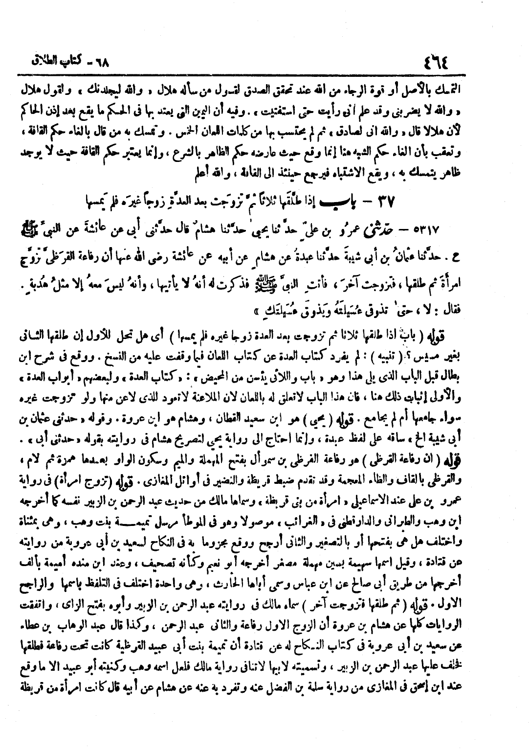 [5317] قَوْله يحيى هُوَ بن سعيد الْقطَّان وَهِشَام هُوَ بن عُرْوَةَ وَقَوْلُهُ حَدَّثَنِي عُثْمَانُ بْنُ أَبِي شَيْبَةَ إِلَخْ سَاقَهُ عَلَى لَفْظِ عَبْدَةَ وَإِنَّمَا احْتَاجَ إِلَى رِوَايَةِ يَحْيَى لِتَصْرِيحِ هِشَامٍ فِي رِوَايَتِهِ بِقَوْلِهِ حَدَّثَنِي أَبِي قَوْلُهُ إِنَّ رِفَاعَةَ الْقُرَظِيَّ هُوَ رِفَاعَةُ الْقُرَظِيُّ بْنُ سَمَوْأَلٍ بِفَتْحِ الْمُهْمَلَةِ وَالْمِيمِ وَسُكُونِ الْوَاوِ بَعْدَهَا هَمْزَةٌ ثُمَّ لَامٌ وَالْقُرَظِيُّ بِالْقَافِ وَالظَّاءِ الْمُعْجَمَةِ وَقَدْ تَقَدَّمَ ضَبْطُ قُرَيْظَةَ وَالنَّضِيرِ فِي أَوَائِلِ الْمَغَازِي قَوْلُهُ تَزَوَّجَ امْرَأَةً فِي رِوَايَةِ عَمْرِو بْنِ عَلِيٍّ عِنْدَ الْإِسْمَاعِيلِيِّ امْرَأَةً مِنْ بَنِي قُرَيْظَةَ وَسَمَّاهَا مَالِكٌ مِنْ حَدِيثِ عَبْدِ الرَّحْمَنِ بْنِ الزَّبِيرِ نَفْسِهِ كَمَا أخرجه بن وَهْبٍ وَالطَّبَرَانِيُّ وَالدَّارَقُطْنِيُّ فِي الْغَرَائِبِ مَوْصُولًا وَهُوَ فِي الْمُوَطَّأِ مُرْسَلٌ تَمِيمَةُ بِنْتُ وَهْبٍ وَهِيَ بِمُثَنَّاةٍ وَاخْتُلِفَ هَلْ هِيَ بِفَتْحِهَا أَوْ بِالتَّصْغِيرِ وَالثَّانِي أَرْجَحُ وَوَقَعَ مَجْزُومًا بِهِ فِي النِّكَاحِ لِسَعِيدِ بْنِ أَبِي عَرُوبَةَ مِنْ رِوَايَتِهِ عَنْ قَتَادَةَ وَقِيلَ اسْمُهَا سُهَيْمَةُ بِسِينٍ مُهْمَلَةٍ مُصَغَّرٌ أخرجه أَبُو نعيم وَكَأَنَّهُ تَصْحِيف وَعند بن مَنْدَهْ أُمَيْمَةُ بِأَلِفٍ أَخْرَجَهَا مِنْ طَرِيقِ أَبِي صَالح عَن بن عَبَّاسٍ وَسُمِّيَ أَبَاهَا الْحَارِثُ وَهِيَ وَاحِدَةٌ اخْتُلِفَ فِي التَّلَفُّظِ بِاسْمِهَا وَالرَّاجِحُ الْأَوَّلُ قَوْلُهُ ثُمَّ طَلَّقَهَا فَتَزَوَّجَتْ آخَرَ سَمَّاهُ مَالِكٌ فِي رِوَايَتِهِ عَبْدَ الرَّحْمَنِ بْنَ الزَّبِيرِ وَأَبُوهُ بِفَتْحِ الزَّايِ وَاتَّفَقَتِ الرِّوَايَاتُ كُلُّهَا عَنْ هِشَامِ بْنِ عُرْوَةَ أَنَّ الزَّوْجَ الْأَوَّلَ رِفَاعَةُ وَالثَّانِي عَبْدُ الرَّحْمَنِ وَكَذَا قَالَ عَبْدُ الْوَهَّابِ بْنُ عَطَاءٍ عَنْ سَعِيدُ بْنُ أَبِي عَرُوبَةَ فِي كِتَابِ النِّكَاحِ لَهُ عَنْ قَتَادَةَ أَنَّ تَمِيمَةَ بِنْتَ أَبِي عُبَيْدٍ الْقُرَظِيَّةَ كَانَتْ تَحْتَ رِفَاعَةَ فَطَلَّقَهَا فَخَلَفَ عَلَيْهَا عَبْدُ الرَّحْمَنِ بْنُ الزَّبِيرِ وَتَسْمِيَتُهُ لِأَبِيهَا لَا تُنَافِي رِوَايَةَ مَالِكٍ فَلَعَلَّ اسْمَهُ وَهْبٌ وَكُنْيَتَهُ أَبُو عُبَيْدٍ إِلَّا مَا وَقَعَ عِنْدَ بن إِسْحَاقَ فِي الْمَغَازِي مِنْ رِوَايَةِ سَلَمَةَ بْنِ الْفَضْلِ عَنْهُ وَتَفَرَّدَ بِهِ عَنْهُ عَنْ هِشَامٍ عَنْ أَبِيهِ قَالَ كَانَتِ امْرَأَةٌ مِنْ قُرَيْظَةَ