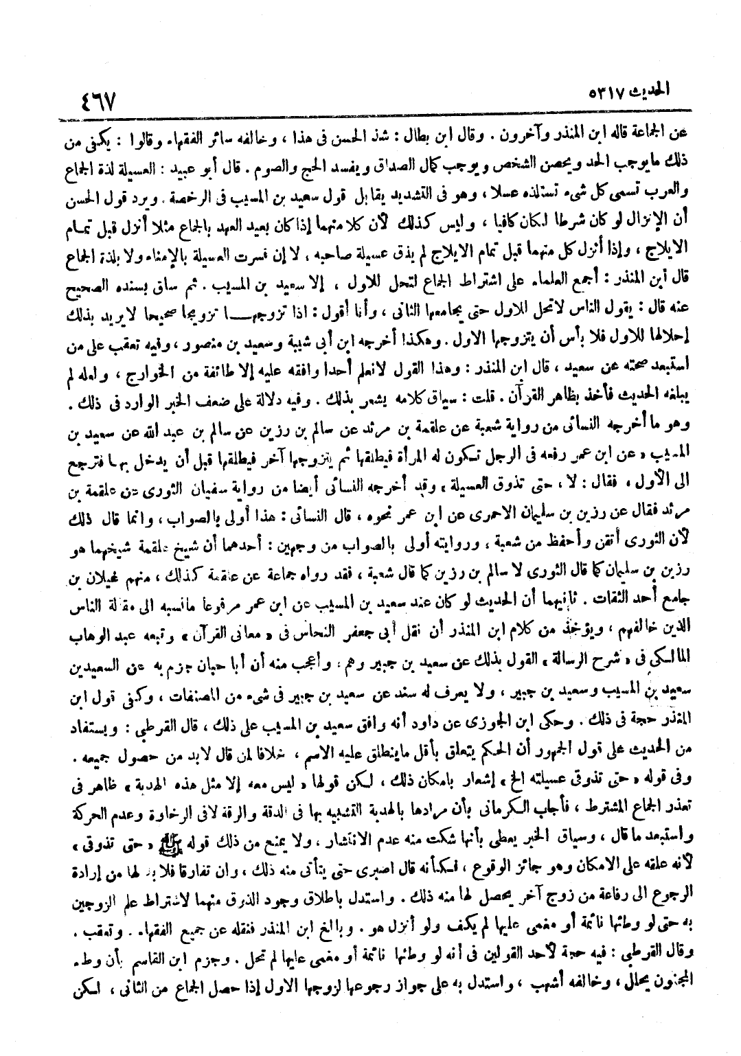 عَن الْجَمَاعَة قَالَه بن الْمُنْذر وَآخَرُونَ وَقَالَ بن بَطَّالٍ شَذَّ الْحَسَنُ فِي هَذَا وَخَالَفَهُ سَائِرُ الْفُقَهَاءِ وَقَالُوا يَكْفِي مِنْ ذَلِكَ مَا يُوجِبُ الْحَدَّ وَيُحْصِنُ الشَّخْصَ وَيُوجِبُ كَمَالَ الصَّدَاقِ وَيُفْسِدُ الْحَجَّ وَالصَّوْمِ قَالَ أَبُو عُبَيْدٍ الْعُسَيْلَةُ لَذَّةُ الْجِمَاعِ وَالْعَرَبُ تُسَمِّي كُلَّ شَيْءٍ تَسْتَلِذُّهُ عَسَلًا وَهُوَ فِي التَّشْدِيدِ يُقَابِلُ قَوْلَ سَعِيدِ بْنِ الْمُسَيَّبِ فِي الرُّخْصَةِ وَيَرُدُّ قَوْلَ الْحَسَنِ أَنَّ الْإِنْزَالَ لَوْ كَانَ شَرْطًا لَكَانَ كَافِيًا وَلَيْسَ كَذَلِكَ لِأَنَّ كُلًّا مِنْهُمَا إِذَا كَانَ بَعِيدَ الْعَهْدِ بِالْجِمَاعِ مَثَلًا أَنْزَلَ قَبْلَ تَمَامِ الْإِيلَاجِ وَإِذَا أَنْزَلَ كُلٌّ مِنْهُمَا قَبْلَ تَمَامِ الْإِيلَاجِ لَمْ يَذُقْ عُسَيْلَةَ صَاحِبِهِ لَا إِنْ فُسِّرَتِ الْعسيلَة بالامناء وَلَا بلذة الْجِمَاع قَالَ بن الْمُنْذِرِ أَجْمَعَ الْعُلَمَاءُ عَلَى اشْتِرَاطِ الْجِمَاعِ لِتَحِلَّ لِلْأَوَّلِ إِلَّا سَعِيدَ بْنَ الْمُسَيَّبِ ثُمَّ سَاقَ بِسَنَدِهِ الصَّحِيحِ عَنْهُ قَالَ يَقُولُ النَّاسُ لَا تَحِلُّ لِلْأَوَّلِ حَتَّى يُجَامِعَهَا الثَّانِي وَأَنَا أَقُولُ إِذَا تَزَوَّجَهَا تَزْوِيجًا صَحِيحًا لَا يُرِيدُ بِذَلِكَ إِحْلَالَهَا لِلْأَوَّلِ فَلَا بَأْسَ أَنْ يَتَزَوَّجَهَا الْأَوَّلُ وَهَكَذَا أخرجه بن أَبِي شَيْبَةَ وَسَعِيدُ بْنُ مَنْصُورٍ وَفِيهِ تَعَقُّبٌ عَلَى مَنِ اسْتَبْعَدَ صِحَّتَهُ عَنْ سَعِيدٍ قَالَ بن الْمُنْذِرِ وَهَذَا الْقَوْلُ لَا نَعْلَمُ أَحَدًا وَافَقَهُ عَلَيْهِ إِلَّا طَائِفَةً مِنَ الْخَوَارِجِ وَلَعَلَّهُ لَمْ يَبْلُغْهُ الْحَدِيثَ فَأَخَذَ بِظَاهِرِ الْقُرْآنِ قُلْتُ سِيَاقُ كَلَامِهِ يُشْعِرُ بِذَلِكَ وَفِيهِ دَلَالَةٌ عَلَى ضَعْفِ الْخَبَر الْوَارِد فِي ذَلِك وَهُوَ ماأخرجه النَّسَائِيُّ مِنْ رِوَايَةِ شُعْبَةَ عَنْ عَلْقَمَةَ بْنِ مَرْثَدٍ عَنْ سَالِمِ بْنِ رَزِينٍ عَنْ سَالِمِ بْنِ عَبْدِ اللَّهِ عَنْ سَعِيدِ بْنِ الْمُسَيَّبِ عَن بن عُمَرَ رَفَعَهُ فِي الرَّجُلِ تَكُونُ لَهُ الْمَرْأَةُ فَيُطَلِّقُهَا ثُمَّ يَتَزَوَّجُهَا آخَرُ فَيُطَلِّقُهَا قَبْلَ أَنْ يَدْخُلَ بِهَا فَتَرْجِعُ إِلَى الْأَوَّلِ فَقَالَ لَا حَتَّى تَذُوقَ الْعُسَيْلَةَ وَقَدْ أَخْرَجَهُ النَّسَائِيُّ أَيْضًا مِنْ رِوَايَةِ سُفْيَانَ الثَّوْرِيِّ عَنْ عَلْقَمَةَ بْنِ مَرْثَدٍ فَقَالَ عَنْ رَزِينِ بْنِ سُلَيْمَانَ الْأَحْمَرِيِّ عَن بن عُمَرَ نَحْوُهُ قَالَ النَّسَائِيُّ هَذَا أَوْلَى بِالصَّوَابِ وَإِنَّمَا قَالَ ذَلِكَ لِأَنَّ الثَّوْرِيَّ أَتْقَنُ وَأَحْفَظُ مِنْ شُعْبَةَ وَرِوَايَتُهُ أَوْلَى بِالصَّوَابِ مِنْ وَجْهَيْنِ أَحَدُهُمَا أَنَّ شَيْخَ عَلْقَمَةَ شَيْخُهُمَا هُوَ رَزِينُ بْنُ سُلَيْمَانَ كَمَا قَالَ الثَّوْرِيُّ لَا سَالِمُ بْنُ رَزِينٍ كَمَا قَالَ شُعْبَةُ فَقَدْ رَوَاهُ جَمَاعَةٌ عَنْ عَلْقَمَةَ كَذَلِكَ مِنْهُمْ غَيْلَانُ بْنُ جَامِعٍ أَحَدُ الثِّقَاتِ ثَانِيهُمَا أَنَّ الْحَدِيثَ لَوْ كَانَ عِنْد سعيد بن الْمسيب عَن بن عُمَرَ مَرْفُوعًا مَا نَسَبَهُ إِلَى مَقَالَةِ النَّاسِ الَّذين خالفهم وَيُؤْخَذ من كَلَام بن الْمُنْذِرِ أَنَّ نَقْلَ أَبِي جَعْفَرٍ النَّحَّاسِ فِي مَعَانِي الْقُرْآنِ وَتَبِعَهُ عَبْدُ الْوَهَّابِ الْمَالِكِيُّ فِي شَرْحِ الرِّسَالَةِ الْقَوْلَ بِذَلِكَ عَنْ سَعِيدِ بْنِ جُبَيْرٍ وَهْمٌ وَأَعْجَبُ مِنْهُ أَنَّ أَبَا حِبَّانَ جزم بِهِ عَن السعيدين سَعِيدِ بْنِ الْمُسَيَّبِ وَسَعِيدِ بْنِ جُبَيْرٍ وَلَا يُعْرَفُ لَهُ سَنَدٌ عَنْ سَعِيدِ بْنِ جُبَيْرٍ فِي شَيْء من المصنفات وَكفى قَول بن الْمُنْذر حجَّة فِي ذَل