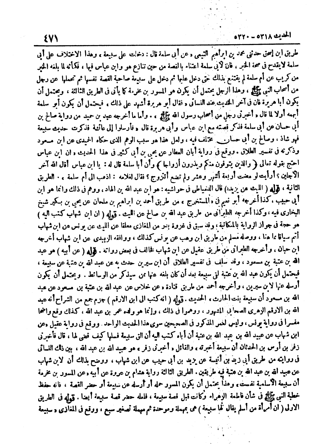 طَرِيق بن إِسْحَاقَ حَدَّثَنِي مُحَمَّدِ بْنِ إِبْرَاهِيمَ التَّيْمِيِّ عَنْ أَبِي سَلَمَةَ قَالَ دَخَلْتُ عَلَى سُبَيْعَةَ وَهَذَا الِاخْتِلَافُ عَلَى أَبِي سَلَمَةَ لَا يَقْدَحُ فِي صِحَّةِ الْخَبَرِ فَإِنَّ لِأَبِي سَلَمَةَ اعْتِنَاءً بِالْقِصَّةِ من حِين تنَازع هُوَ وبن عَبَّاسٍ فِيهَا فَكَأَنَّهُ لَمَّا بَلَغَهُ الْخَبَرُ مِنْ كُرَيْبٍ عَنْ أُمِّ سَلَمَةَ لَمْ يَقْتَنِعْ بِذَلِكَ حَتَّى دَخَلَ عَلَيْهَا ثُمَّ دَخَلَ عَلَى سُبَيْعَةَ صَاحِبَةِ الْقِصَّةِ نَفْسِهَا ثُمَّ تَحَمَّلَهَا عَنْ رَجُلٍ مِنْ أَصْحَابِ النَّبِيِّ صَلَّى اللَّهُ عَلَيْهِ وَسَلَّمَ وَهَذَا الرَّجُلُ يَحْتَمِلُ أَنْ يَكُونَ هُوَ الْمِسْوَرَ بْنَ مَخْرَمَةَ كَمَا يَأْتِي فِي الطَّرِيقِ الثَّالِثَةِ وَيَحْتَمِلُ أَنْ يَكُونَ أَبَا هُرَيْرَةَ فَإِنَّ فِي آخِرِ الْحَدِيثِ عِنْدَ النَّسَائِيِّ فَقَالَ أَبُو هُرَيْرَةَ أَشْهَدُ عَلَى ذَلِكَ فَيَحْتَمِلُ أَنْ يَكُونَ أَبُو سَلَمَةَ أَبْهَمَهُ أَوَّلًا لَمَّا قَالَ أَخْبَرَنِي رَجُلٍ مِنْ أَصْحَابِ رَسُولِ اللَّهِ صَلَّى اللَّهُ عَلَيْهِ وَسَلَّمَ وَأَمَّا مَا أَخْرَجَهُ عَبْدُ بْنُ حُمَيْدٍ مِنْ رِوَايَةِ صَالِحِ بْنِ أَبِي حَسَّانَ عَنْ أبي سَلمَة فَذكر قصَّته مَعَ بن عَبَّاسٍ وَأَبِي هُرَيْرَةَ قَالَ فَأَرْسَلُوا إِلَى عَائِشَةَ فَذَكَرَتْ حَدِيثَ سُبَيْعَةَ فَهُوَ شَاذٌّ وَصَالِحُ بْنُ أَبِي حَسَّانَ مُخْتَلَفٌ فِيهِ وَلَعَلَّ هَذَا هُوَ سَبَب الْوَهم الَّذِي حَكَاهُ الْحميدِي عَن بن مَسْعُودٍ وَذَكَرْتُهُ فِي تَفْسِيرِ الطَّلَاقِ وَوَقَعَ فِي رِوَايَةِ أَبَانٍ الْعَطَّارِ عَنْ يَحْيَى بْنِ أَبِي كثير فِي هَذَا الحَدِيث أَن بن عَبَّاسٍ احْتَجَّ بِقَوْلِهِ تَعَالَى وَالَّذِينَ يُتَوَفَّوْنَ مِنْكُمْ ويذرون ازواجا وَأَن أَبَا سَلمَة قَالَ لَهُ يَا بن عَبَّاسٍ أَقَالَ اللَّهُ آخِرَ الْأَجَلَيْنِ أَرَأَيْتَ لَوْ مَضَتْ أَرْبَعَةُ أَشْهُرٍ وَعَشْرٍ وَلَمْ تَضَعْ أَتَتَزَوَّجُ فَقَالَ لغلامه أذهب إِلَى أم سَلمَة الطَّرِيق الثَّانِيَةُ