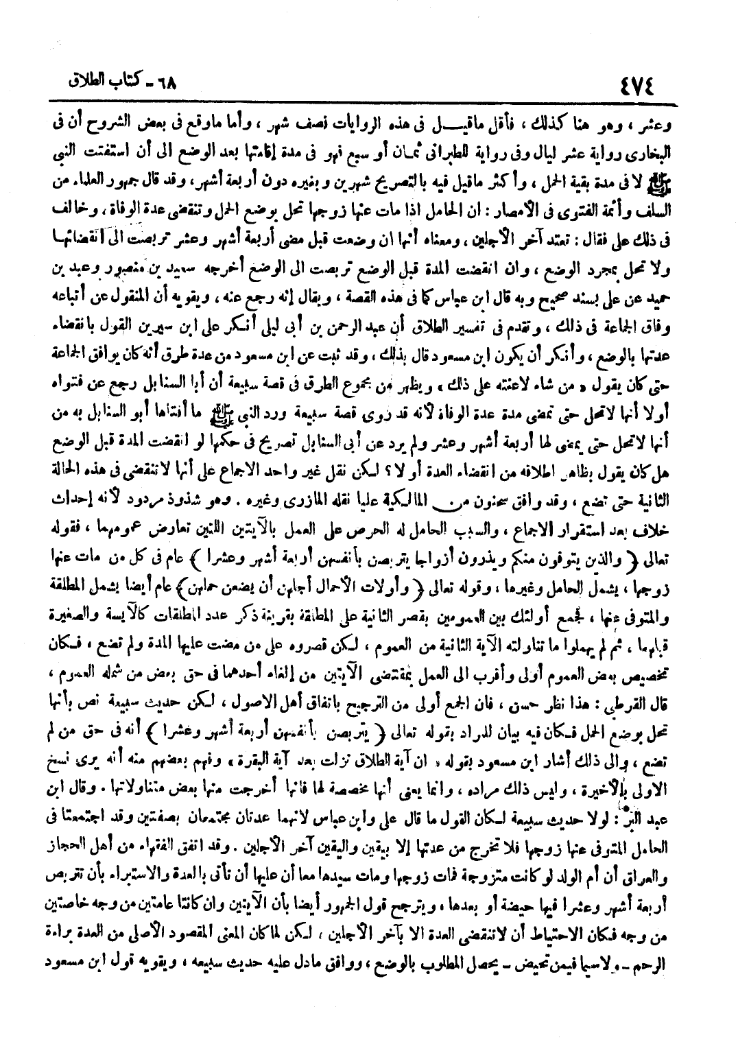 وَعشر وَهُوَ هُنَا كَذَلِكَ فَأَقَلُّ مَا قِيلَ فِي هَذِهِ الرِّوَايَاتِ نِصْفُ شَهْرٍ وَأَمَّا مَا وَقَعَ فِي بَعْضِ الشُّرُوحِ أَنَّ فِي الْبُخَارِيِّ رِوَايَةَ عَشْرِ لَيَالٍ وَفِي رِوَايَةٍ لِلطَّبَرَانِيِّ ثَمَانٍ أَوْ سَبْعٍ فَهُوَ فِي مُدَّةِ إِقَامَتِهَا بَعْدَ الْوَضْعِ إِلَى أَنِ اسْتَفْتَتِ النَّبِيِّ صَلَّى اللَّهُ عَلَيْهِ وَسَلَّمَ لَا فِي مُدَّةِ بَقِيَّةِ الْحَمْلِ وَأَكْثَرُ مَا قِيلَ فِيهِ بِالتَّصْرِيحِ شَهْرَيْنِ وَبِغَيْرِهِ دُونَ أَرْبَعَةِ أَشْهُرٍ وَقَدْ قَالَ جُمْهُورُ الْعُلَمَاءِ مِنَ السَّلَفِ وَأَئِمَّةِ الْفَتْوَى فِي الْأَمْصَارِ إِنَّ الْحَامِلَ إِذَا مَاتَ عَنْهَا زَوْجُهَا تَحِلُّ بِوَضْعِ الْحَمْلِ وَتَنْقَضِي عِدَّةُ الْوَفَاةِ وَخَالَفَ فِي ذَلِكَ عَلَيٌّ فَقَالَ تَعْتَد آخر الْأَجَليْنِ وَمَعْنَاهُ أَنَّهَا إِن وَضَعَتْ قَبْلَ مُضِيِّ أَرْبَعَةِ أَشْهُرٍ وَعَشْرٍ تَرَبَّصَتْ إِلَى انْقِضَائِهَا وَلَا تَحِلُّ بِمُجَرَّدِ الْوَضْعِ وَإِنِ انْقَضَتِ الْمُدَّةُ قَبْلَ الْوَضْعِ تَرَبَّصَتْ إِلَى الْوَضْعِ أَخْرَجَهُ سَعِيدُ بْنُ مِنْصورٍ وَعَبْدُ بْنُ حميد عَن عَليّ بِسَنَد صَحِيح وَبِه قَالَ بن عَبَّاسٍ كَمًّا فِي هَذِهِ الْقِصَّةِ وَيُقَالُ إِنَّهُ رَجَعَ عَنْهُ وَيُقَوِّيهِ أَنَّ الْمَنْقُولَ عَنْ أَتْبَاعِهِ وِفَاقُ الْجَمَاعَةِ فِي ذَلِكَ وَتَقَدَّمَ فِي تَفْسِيرِ الطَّلَاقِ أَنْ عَبْدَ الرَّحْمَنِ بْنَ أَبِي لَيْلَى أنكر على بن سَيْرَيْنِ الْقَوْلَ بِانْقِضَاءِ عِدَّتِهَا بِالْوَضْعِ وَأَنْكَرَ أَنْ يكون بن مَسْعُود قَالَ بذلك وَقد ثَبت عَن بن مَسْعُودٍ مِنْ عِدَّةِ طُرُقٍ أَنَّهُ كَانَ يُوَافِقُ الْجَمَاعَةَ حَتَّى كَانَ يَقُولُ مِنْ شَاءَ لَاعَنْتُهُ عَلَى ذَلِكَ وَيَظْهَرُ مِنْ مَجْمُوعِ الطُّرُقِ فِي قصَّة سبيعة أَن أَبَا السنابل رَجَعَ عَن فتواه أَو لَا أَنَّهَا لَا تَحِلُّ حَتَّى تَمْضِيَ مُدَّةُ عِدَّةِ الْوَفَاةِ لِأَنَّهُ قَدْ رَوَى قِصَّةَ سُبَيْعَةَ وَرَدَّ النَّبِيِّ صَلَّى اللَّهُ عَلَيْهِ وَسَلَّمَ مَا أَفْتَاهَا أَبُو السَّنَابِلِ بِهِ مِنْ أَنَّهَا لَا تَحِلُّ حَتَّى يَمْضِيَ لَهَا أَرْبَعَةُ أَشْهُرٍ وَعَشْرٌ وَلَمْ يَرِدْ عَنْ أَبِي السَّنَابِلِ تَصْرِيحٌ فِي حُكْمِهَا لَوِ انْقَضَتِ الْمُدَّةُ قَبْلَ الْوَضْعِ هَلْ كَانَ يَقُولُ بِظَاهِرِ إِطْلَاقِهِ مِنِ انْقِضَاءِ الْعُدَّةِ أَوْ لَا لَكِنْ نَقَلَ غَيْرُ وَاحِدٍ الْإِجْمَاعَ عَلَى أَنَّهَا لَا تَنْقَضِي فِي هَذِهِ الْحَالَةِ الثَّانِيَةِ حَتَّى تَضَعَ وَقَدْ وَافَقَ سَحْنُونُ مِنَ الْمَالِكِيَّةِ عَلِيًّا نَقَلَهُ الْمَازِرِيُّ وَغَيْرُهُ وَهُوَ شُذُوذٌ مَرْدُودٌ لِأَنَّهُ إِحْدَاثُ خِلَافٍ بَعْدِ اسْتِقْرَارِ الْإِجْمَاعِ وَالسَّبَبُ الْحَامِلُ لَهُ الْحِرْصُ عَلَى الْعَمَلِ بِالْآيَتَيْنِ اللَّتَيْنِ تَعَارَضَ عُمومُهُمَا فَقَوْلُهُ تَعَالَى وَالَّذِينَ يُتَوَفَّوْنَ مِنْكُمْ وَيَذَرُونَ أَزْوَاجًا يَتَرَبَّصْنَ بِأَنْفُسِهِنَّ أَرْبَعَةَ أَشْهُرٍ وَعَشْرًا عَامُّ فِي كُلِّ مِنْ مَاتَ عَنْهَا زَوْجُهَا يَشْمَل الْحَامِل وَغَيرهَا وَقَوْلُهُ تَعَالَى وَأولَات الْأَحْمَالِ أَجَلُهُنَّ أَنْ يَضَعْنَ حَملهنَّ عَامٌّ أَيْضًا يَشْمَلُ الْمُطْلَقَةَ وَالْمُتَوَفَّى عَنْهَا فَجَمَعَ أُولَئِكَ بَين العمومين بقصر الثَّانِيَة على الْمُطلقَة بِقَرِينَةِ ذِكْرِ عَدَدِ الْمُطَلَّقَاتِ كَالْآيِسَةِ وَالصَّغِيرَةِ قَبْلَهُمَا ثُمَّ لَمَّ يُهْمِلُوا مَا تَنَاوَلَتْهُ الْآيَةُ الثَّانِيَةُ مِنَ الْعُمُومِ لَكِنْ قَصَرُوهُ عَلَى مِنْ مَضَتْ عَلَيْهَا الْمُدَّةُ وَلَمْ تَضَعْ فَكَانَ تَخْصِيصُ بَعْضِ الْعُمُومِ أَوْلَى وَأَقْرَبَ إِلَى الْع