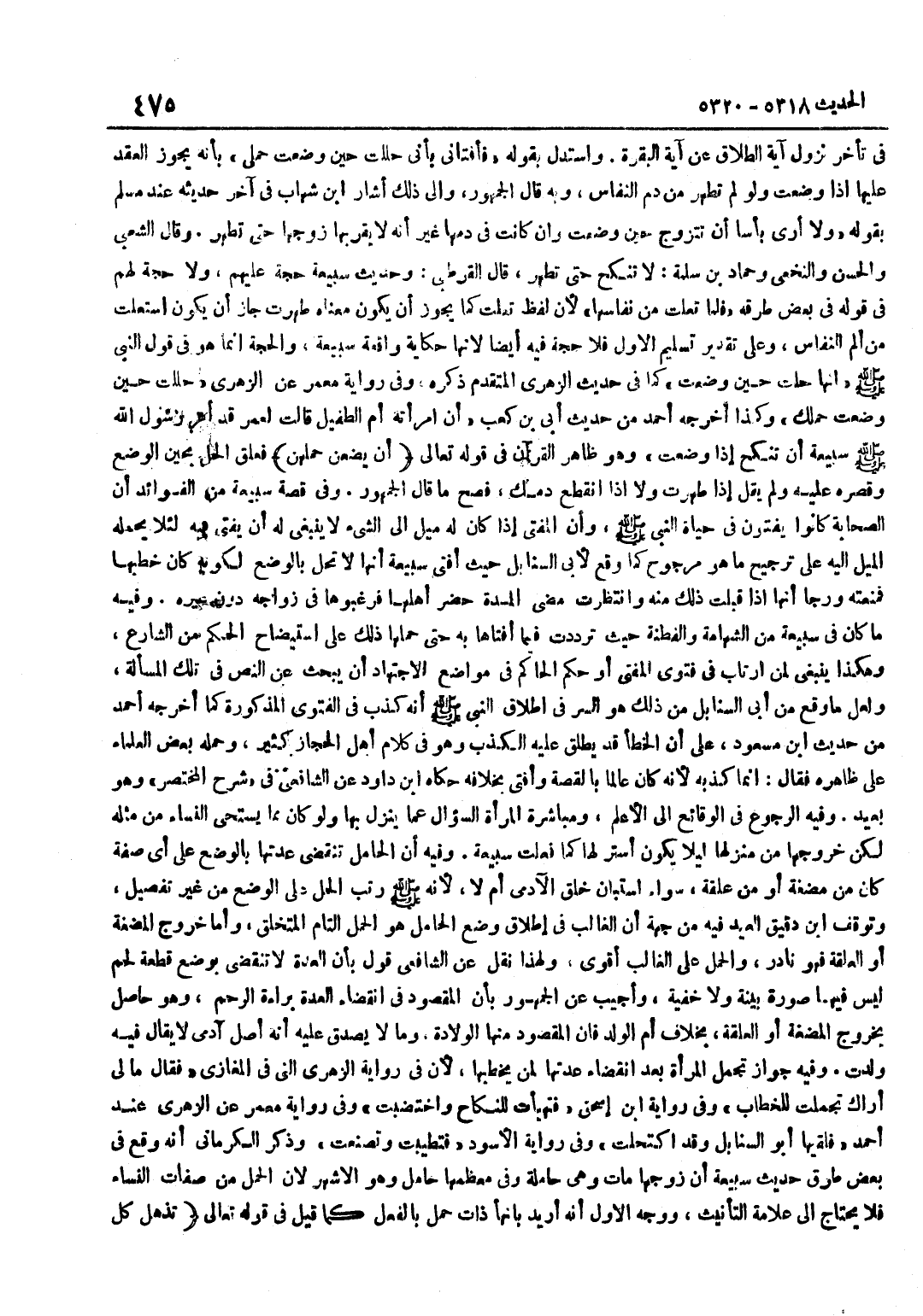 فِي تَأَخُّرِ نُزُولِ آيَةِ الطَّلَاقِ عَنْ آيَةِ الْبَقَرَة وَاسْتدلَّ بقوله فأفتاني بِأَنِّي حَلَلْتُ حِينَ وَضَعَتْ حَمْلِي بِأَنَّهُ يَجُوزُ الْعَقْدُ عَلَيْهَا إِذَا وَضَعَتْ وَلَوْ لَمْ تَطْهُرْ مِنْ دَمِ النِّفَاسِ وَبِهِ قَالَ الْجُمْهُورُ وَإِلَى ذَلِك أَشَارَ بن شِهَابٍ فِي آخِرِ حَدِيثِهِ عِنْدَ مُسْلِمٍ بِقَوْلِهِ وَلَا أَرَى بَأْسًا أَنْ تَتَزَوَّجَ حِينَ وَضَعَتْ وَإِنْ كَانَتْ فِي دَمِهَا غَيْرَ أَنَّهُ لَا يَقْرَبُهَا زَوْجُهَا حَتَّى تَطْهُرَ وَقَالَ الشَّعْبِيُّ وَالْحَسَنُ وَالنَّخَعِيُّ وَحَمَّادُ بْنُ سَلَمَةَ لَا تَنْكِحُ حَتَّى تَطْهُرَ قَالَ الْقُرْطُبِيُّ وَحَدِيثُ سُبَيْعَةَ حُجَّةٌ عَلَيْهِمْ وَلَا حُجَّةَ لَهُمْ فِي قَوْلِهِ فِي بَعْضِ طرقه فَلَمَّا تَعَلَّتْ مِنْ نِفَاسِهَا لِأَنَّ لَفْظَ تَعَلَّتْ كَمَا يَجُوزُ أَنْ يَكُونَ مَعْنَاهُ طَهُرَتْ جَازَ أَنْ يَكُونَ اسْتَعْلَتْ مِنْ أَلَمِ النِّفَاسِ وَعَلَى تَقْدِيرِ تَسْلِيمِ الْأَوَّلِ فَلَا حُجَّةَ فِيهِ أَيْضًا لِأَنَّهَا حِكَايَةُ وَاقِعَةِ سُبَيْعَةَ وَالْحَجَّةُ إِنَّمَا هُوَ فِي قَوْلِ النَّبِيِّ صَلَّى اللَّهُ عَلَيْهِ وَسَلَّمَ إِنَّهَا حَلَّتْ حِينَ وَضَعَتْ كَمَا فِي حَدِيثِ الزُّهْرِيِّ الْمُتَقَدّم ذكره وَفِي رِوَايَة معمر عَنِ الزُّهْرِيِّ حَلَلْتِ حِينَ وَضَعْتِ حَمْلَكِ وَكَذَا أَخْرَجَهُ أَحْمَدُ مِنْ حَدِيثِ أُبَيِّ بْنِ كَعْبٍ أَنَّ امْرَأَتَهُ أُمَّ الطَّفِيلِ قَالَتْ لِعُمَرَ قَدْ أَمْرِ رَسُولِ اللَّهِ صَلَّى اللَّهُ عَلَيْهِ وَسَلَّمَ سُبَيْعَةَ أَنْ تَنْكِحَ إِذَا وَضَعَتْ وَهُوَ ظَاهِرُ الْقُرْآنِ فِي قَوْلِهِ تَعَالَى أَنْ يَضَعْنَ حَمْلَهُنَّ فَعَلَّقَ الْحِلَّ بِحِينِ الْوَضْعِ وَقَصَرَهُ عَلَيْهِ وَلَمْ يَقُلْ إِذَا طَهُرْتِ وَلَا إِذَا انْقَطَعَ دَمُكِ فَصَحَّ مَا قَالَ الْجُمْهُوُر وَفِي قِصَّةِ سُبَيْعَةَ مِنَ الْفَوَائِدِ أَنَّ الصَّحَابَةَ كَانُوا يُفْتُونَ فِي حَيَاةِ النَّبِيِّ صَلَّى اللَّهُ عَلَيْهِ وَسَلَّمَ وَأَنَّ الْمُفْتِيَ إِذَا كَانَ لَهُ مَيْلٌ إِلَى الشَّيْءِ لَا يَنْبَغِي لَهُ أَنْ يُفْتِيَ فِيهِ لِئَلَّا يَحْمِلَهُ الْمَيْلُ إِلَيْهِ عَلَى تَرْجِيحِ مَا هُوَ مَرْجُوحٌ كَمَا وَقَعَ لِأَبِي السَّنَابِلِ حَيْثُ أَفْتَى سُبَيْعَةَ أَنَّهَا لَا تَحِلُّ بِالْوَضْعِ لِكَوْنِهِ كَانَ خَطَبَهَا فَمَنَعَتْهُ وَرَجَا أَنَّهَا إِذَا قَبِلَتْ ذَلِكَ مِنْهُ وَانْتَظَرَتْ مُضِيَّ الْمُدَّةِ حَضَرَ أَهْلُهَا فَرَغَّبُوهَا فِي زَوَاجِهِ دُونَ غَيْرِهِ وَفِيهِ مَا كَانَ فِي سُبَيْعَةَ مِنَ الشَّهَامَةِ وَالْفِطْنَةِ حَيْثُ تَرَدَّدَتْ فِيمَا أَفْتَاهَا بِهِ حَتَّى حَمَلَهَا ذَلِكَ عَلَى اسْتِيضَاحِ الْحَكَمِ مِنَ الشَّارِعِ وَهَكَذَا يَنْبَغِي لَمِنَ ارتاب فِي فَتْوَى الْمُفْتى أَوْ حُكْمِ الْحَاكِمِ فِي مَوَاضِعِ الِاجْتِهَادِ أَنْ يَبْحَثَ عَنِ النَّصِّ فِي تِلْكَ الْمَسْأَلَةِ وَلَعَلَّ مَا وَقَعَ مِنْ أَبِي السَّنَابِلِ مِنْ ذَلِكَ هُوَ السِّرُّ فِي إِطْلَاقِ النَّبِيِّ صَلَّى اللَّهُ عَلَيْهِ وَسَلَّمَ أَنَّهُ كَذَبَ فِي الْفَتْوَى الْمَذْكُورَةِ كَمَا أخرجه أَحْمد من حَدِيث بن مَسْعُودٍ عَلَى أَنْ الْخَطَأَ قَدْ يُطْلَقُ عَلَيْهِ الْكَذِبُ وَهُوَ فِي كَلَامِ أَهْلِ الْحِجَازِ كَثِيرٌ وَحَمَلَهُ بَعْضُ الْعُلَمَاءِ عَلَى ظَاهِرِهِ فَقَالَ إِنَّمَا كَذَّبَهُ لِأَنَّهُ كَانَ عَالِمًا بِالْقِصَّةِ وَأَفْتَى بِخِلَافِهِ حَكَاهُ بن دَاوُد عَن الشَّافِعِي فِي شرح الْمُخْتَصر وَهُوَ بَعِيدٌ وَفِيهِ الرُّجُوعُ فِي الْوَقَائِعِ إِلَى الْأَعْلَمِ وَمُبَاشَرَةُ الْمَرْأَةِ السُّؤَالَ عَمَّا يَنْزِلُ بِهَا وَلَوْ كَانَ مِمَّا يَسْتَحِي ال