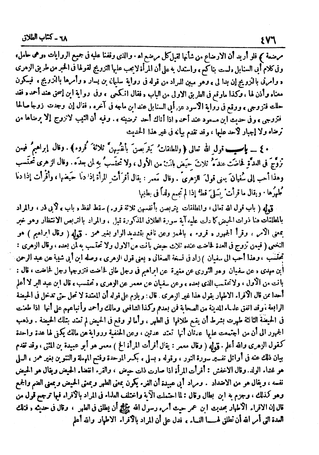 سَقَطَ لَفْظُ بَابٍ لِأَبِي ذَرٍّ وَالْمُرَادُ بِالْمُطَلَّقَاتِ هُنَا ذَوَاتُ الْحَيْضِ كَمَا دَلَّتْ عَلَيْهِ آيَةُ سُورَةِ الطَّلَاقِ الْمَذْكُورَةِ قَبْلُ وَالْمُرَادُ بِالتَّرَبُّصِ الِانْتِظَارُ وَهُوَ خَبَرٌ بِمَعْنَى الْأَمْرِ وَقَرَأَ الْجُمْهُورُ قُرُوءٍ بِالْهَمْزِ وَعَنْ نَافِعٍ بِتَشْدِيدِ الْوَاوِ بِغَيْرِ هَمْزٍ قَوْلُهُ وَقَالَ إِبْرَاهِيمُ هُوَ النَّخَعِيُّ فِيمَنْ تَزَوَّجَ فِي الْعِدَّةِ فَحَاضَتْ عِنْدَهُ ثَلَاثَ حِيَضٍ بَانَتْ من الأول وَلَا تحتسب بِهِ لمن بعده وَقَالَ الزُّهْرِيّ تحتسب وَهَذَا أحب إِلَى سُفْيَان زَادَ فِي نُسْخَةِ الصَّغَانِيِّ يَعْنِي قَوْلَ الزُّهْرِيِّ وَصله بن أَبِي شَيْبَةَ عَنْ عَبْدِ الرَّحْمَنِ بْنِ مَهْدِيٍّ عَنْ سُفْيَانَ وَهُوَ الثَّوْرِيُّ عَنْ مُغِيرَةَ عَنْ إِبْرَاهِيمَ فِي رَجُلٍ طَلَّقَ فَحَاضَتْ فَتَزَوَّجَهَا رَجُلٌ فَحَاضَتْ قَالَ بَانَتْ مِنَ الْأَوَّلِ وَلَا تَحْتَسِبُ الَّذِي بَعْدَهُ وَعَنْ سُفْيَانَ عَنْ مَعْمَرٍ عَنِ الزُّهْرِيّ تحتسب قَالَ بن عَبْدِ الْبَرِّ لَا أَعْلَمُ أَحَدًا مِمَّنْ قَالَ الْأَقْرَاءُ الْأَطْهَارُ يَقُولُ هَذَا غَيْرُ الزُّهْرِيِّ قَالَ وَيَلْزَمُ عَلَى قَوْلِهِ أَنَّ الْمُعْتَدَّةَ لَا تَحِلُّ حَتَّى تَدْخُلَ فِي الْحَيْضَةِ الرَّابِعَةِ وَقَدِ اتَّفَقَ عُلَمَاءُ الْمَدِينَةِ مِنَ الصَّحَابَةِ فَمَنْ بَعْدَهُمْ وَكَذَا الشَّافِعِيُّ وَمَالِكٌ وَأَحْمَدُ وَأَتْبَاعُهُمْ عَلَى أَنَّهَا إِذَا طَعَنَتْ فِي الْحَيْضَةِ الثَّالِثَةِ طَهُرَتْ بِشَرْطِ أَنْ يَقَعَ طَلَاقُهَا فِي الطُّهْرِ وَأَمَّا لَوْ وَقَعَ فِي الْحَيْضِ لَمْ تَعْتَدَّ بِتِلْكَ الْحَيْضَةِ وَذَهَبَ الْجُمْهُورُ إِلَى أَنَّ مَنِ اجْتَمَعَتْ عَلَيْهَا عِدَّتَانِ أَنَّهَا تَعْتَدُّ عِدَّتَيْنِ وَعَنِ الْحَنَفِيَّةِ وَرِوَايَةٌ عَنْ مَالِكٍ يَكْفِي لَهَا عِدَّةٌ وَاحِدَةٌ كَقَوْلِ الزُّهْرِيِّ وَاللَّهُ أَعْلَمُ قَوْلُهُ وَقَالَ مَعْمَرٌ يُقَالُ أَقْرَأَتِ الْمَرْأَةُ إِلَخْ مَعْمَرٌ هُوَ أَبُو عُبَيْدَةَ بْنُ الْمُثَنَّى وَقَدْ تَقَدَّمَ بَيَانُ ذَلِكَ عَنْهُ فِي أَوَائِلِ تَفْسِيرِ سُورَةِ النُّورِ وَقَوْلُهُ بِسَلًى بِكَسْرِ الْمُوَحَّدَةِ وَفَتْحِ الْمُهْمَلَةِ وَالتَّنْوِينِ بِغَيْرِ هَمْزٍ السَّلَى هُوَ غِشَاءُ الْوَلَدِ وَقَالَ الْأَخْفَشُ أَقْرَأَتِ الْمَرْأَةُ إِذَا صَارَتْ ذَاتَ حَيْضٍ وَالْقُرْءُ انْقِضَاءُ الْحَيْضِ وَيُقَالُ هُوَ الْحَيْضُ نَفْسُهُ وَيُقَالُ هُوَ مِنَ الْأَضْدَادِ وَمُرَادُ أَبِي عُبَيْدَةَ أَنَّ الْقُرْءَ يَكُونُ بِمَعْنَى الطُّهْرِ وَبِمَعْنَى الْحَيْضِ وَبِمَعْنَى الضَّمِّ وَالْجَمْعِ وَهُوَ كَذَلِك وَجزم بِهِ بن بَطَّالٍ وَقَالَ لَمَّا احْتَمَلَتِ الْآيَةُ وَاخْتَلَفَ الْعُلَمَاءُ فِي الْمُرَادِ بِالْأَقْرَاءِ فِيهَا تَرَجَّحَ قَوْلُ مَنْ قَالَ أَن الإقراء الاطهار بِحَدِيث بن عُمَرَ حَيْثُ أَمَّرَهُ رَسُولُ اللَّهِ صَلَّى اللَّهُ عَلَيْهِ وَسَلَّمَ أَنْ يُطَلِّقَ فِي الطُّهْرِ وَقَالَ فِي حَدِيثِهِ فَتِلْكَ الْعِدَّةُ الَّتِي أَمَرَ اللَّهُ أَنْ تُطَلَّقَ لَهَا النِّسَاءُ فَدَلَّ عَلَى أَنَّ الْمُرَادَ بِالْأَقْرَاءِ الْأَطْهَارُ وَاللَّهُ أَعْلَمُ