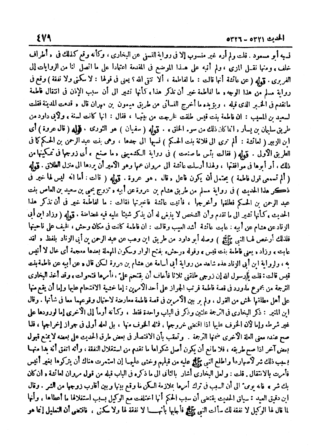 [5325] قَوْلُهُ سُفْيَانُ هُوَ الثَّوْرِيُّ قَوْلُهُ قَالَ عُرْوَةُ أَيِ بن الزُّبَيْرِ لِعَائِشَةَ أَلَمْ تَرَيْ إِلَى فُلَانَةَ بِنْتِ الْحَكَمِ نَسَبَهَا إِلَى جَدِّهَا وَهِيَ بِنْتُ عَبْدِ الرَّحْمَنِ بْنِ الْحَكَمِ كَمَا فِي الطَّرِيقِ الْأُولَى قَوْلُهُ فَقَالَتْ بِئْسَ مَا صَنَعَتْ فِي رِوَايَةِ الْكُشْمِيهَنِيِّ مَا صَنَعَ أَيْ زَوْجُهَا فِي تَمْكِينِهَا مِنْ ذَلِكَ أَوْ أَبُوهَا فِي مُوَافَقَتِهَا وَلِهَذَا أَرْسَلَتْ عَائِشَةَ إِلَى مَرْوَانَ عَمِّهَا وَهُوَ الْأَمِيرُ أَنْ يَرُدَّهَا إِلَى مَنْزِلِ الطَّلَاقِ قَوْلُهُ أَلَمْ تَسْمَعِي قَوْلَ فَاطِمَةَ يَحْتَمِلُ أَنْ يَكُونَ فَاعِلُ قَالَ هُوَ عُرْوَةُ قَوْلُهُ قَالَتْ أَمَا إِنَّهُ لَيْسَ لَهَا خَيْرٌ فِي ذِكْرِ هَذَا الْحَدِيثِ فِي رِوَايَةِ مُسْلِمٌ مِنْ طَرِيقِ هِشَامِ بْنِ عُرْوَةَ عَنْ أَبِيهِ تَزَوَّجَ يَحْيَى بْنُ سَعِيدِ بْنِ الْعَاصِ بِنْتَ عَبْدِ الرَّحْمَنِ بْنِ الْحَكَمِ فَطَلَّقَهَا وَأَخْرَجَهَا فَأَتَيْتُ عَائِشَةَ فَأَخْبَرْتُهَا فَقَالَتْ مَا لِفَاطِمَةَ خَيْرٌ فِي أَنْ تَذْكُرَ هَذَا الْحَدِيثَ كَأَنَّهَا تُشِيرُ إِلَى مَا تَقَدَّمَ وَأَنَّ الشَّخْصَ لَا يَنْبَغِي لَهُ أَنْ يَذْكُرَ شَيْئًا عَلَيْهِ فِيهِ غَضَاضَة قَوْله وَزَاد بن أَبِي الزِّنَادِ عَنْ هِشَامٍ عَنْ أَبِيهِ عَابَتْ عَائِشَةُ أَشَدَّ الْعَيْبِ وَقَالَتْ إِنَّ فَاطِمَةَ كَانَتْ فِي مَكَانٍ وَحْشٍ فَخِيفَ عَلَى نَاحِيَتِهَا فَلِذَلِكَ أَرْخَصَ لَهَا النَّبِيُّ صَلَّى اللَّهُ عَلَيْهِ وَسَلَّمَ وَصله أَبُو دَاوُد من طَرِيق بْنِ وَهْبٍ عَنْ عَبْدِ الرَّحْمَنِ بْنِ أَبِي الزِّنَادِ بِلَفْظِ لَقَدْ عَابَتْ وَزَادَ يَعْنِي فَاطِمَةَ بِنْتَ قَيْسٍ وَقَوْلُهُ وَحْشٌ بِفَتْحِ الْوَاوِ وَسُكُونِ الْمُهْمَلَةِ بَعْدَهَا مُعْجَمَةٌ أَيْ خَالٍ لَا أَنِيسَ بِهِ ولرواية بن أَبِي الزِّنَادِ هَذِهِ شَاهِدٌ مِنْ رِوَايَةِ أَبِي أُسَامَةَ عَنْ هِشَامِ بْنِ عُرْوَةَ لَكِنْ قَالَ عَنْ أَبِيهِ عَنْ فَاطِمَةَ بِنْتِ قَيْسٍ قَالَتْ قُلْتُ يَا رَسُولَ اللَّهِ إِنَّ زَوْجِي طَلَّقَنِي ثَلَاثًا فَأَخَافُ أَنْ يُقْتَحَمَ عَلَيَّ فَأَمَرَهَا فَتَحَوَّلَتْ وَقَدْ أَخَذَ الْبُخَارِيُّ التَّرْجَمَةَ مِنْ مَجْمُوعِ مَا وَرَدَ فِي قِصَّةِ فَاطِمَةَ فَرَتَّبَ الْجَوَازَ عَلَى أَحَدِ الْأَمْرَيْنِ إِمَّا خَشْيَةَ الِاقْتِحَامِ عَلَيْهَا وَإِمَّا أَنْ يَقَعَ مِنْهَا عَلَى أَهْلِ مُطَلِّقِهَا فُحْشٌ مِنَ الْقَوْلِ وَلَمْ يَرَ بَيْنَ الْأَمْرَيْنِ فِي قِصَّةِ فَاطِمَةَ مُعَارَضَةً لِاحْتِمَالِ وُقُوعِهِمَا مَعًا فِي شَأْنهَا وَقَالَ بن الْمُنِيرِ ذَكَرَ الْبُخَارِيُّ فِي التَّرْجَمَةِ عِلَّتَيْنِ وَذَكَرَ فِي الْبَابِ وَاحِدَةً فَقَطْ وَكَأَنَّهُ أَوْمَأَ إِلَى الْأُخْرَى أما لورودها على غير شَرط وَإِمَّا لِأَنَّ الْخَوْفَ عَلَيْهَا إِذَا اقْتَضَى خُرُوجَهَا فَمِثْلُهُ الْخَوْفُ مِنْهَا بَلْ لَعَلَّهُ أَوْلَى فِي جَوَازِ إِخْرَاجِهَا فَلَمَّا صَحَّ عِنْدَهُ مَعْنَى الْعِلَّةِ الْأُخْرَى ضَمَّنَهَا التَّرْجَمَةَ وَتُعُقِّبَ بِأَنَّ الِاقْتِصَارَ فِي بَعْضِ طُرُقِ الْحَدِيثِ عَلَى بَعْضِهِ لَا يَمْنَعُ قَبُولَ بَعْضٍ آخَرَ إِذَا صَحَّ طَرِيقُهُ فَلَا مَانِعَ أَنْ يَكُونَ أَصْلُ شَكْوَاهَا مَا تَقَدَّمَ مِنِ اسْتِقْلَالِ النَّفَقَةِ وَأَنَّهُ اتَّفَقَ أَنَّهُ بَدَا مِنْهَا بِسَبَبِ ذَلِكَ شَرٌّ لِأَصْهَارِهَا وَاطَّلَعَ النَّبِيُّ صَلَّى اللَّهُ عَلَيْهِ وَسَلَّمَ عَلَيْهِ مِنْ قِبَلِهِمْ وَخَشِيَ عَلَيْهَا إِنِ اسْتَمَرَّتْ هُنَاكَ أَنْ يَتْرُكُوهَا بِغَيْرِ أَنِيسٍ فَأُمِرَتْ بِالِانْتِقَالِ قُلْتُ وَلَعَلَّ الْبُخَارِيَّ أَشَارَ بِالثَ