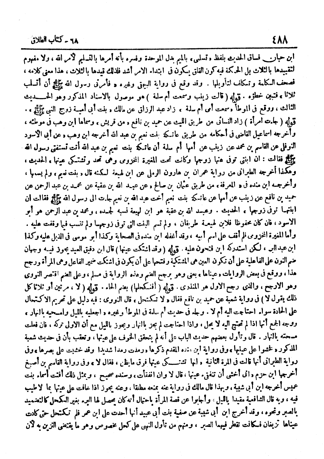 بن حِبَّانَ فَسَاقَ الْحَدِيثَ بِلَفْظِ تَسَلَّمِي بِالْمِيمِ بَدَلَ الْمُوَحَّدَةِ وَفَسَّرَهُ بِأَنَّهُ أَمَرَهَا بِالتَّسْلِيمِ لِأَمْرِ اللَّهِ وَلَا مَفْهُومَ لِتَقْيِيدِهَا بِالثَّلَاثِ بَلِ الْحِكْمَةُ فِيهِ كَوْنُ الْقَلَقِ يَكُونُ فِي ابْتِدَاءِ الْأَمْرِ أَشَدَّ فَلِذَلِكَ قَيَّدَهَا بِالثَّلَاثِ هَذَا مَعْنَى كَلَامِهِ فَصَحَّفَ الْكَلِمَةَ وَتَكَلَّفَ لِتَأْوِيلِهَا وَقَدْ وَقَعَ فِي رِوَايَةِ الْبَيْهَقِيِّ وَغَيْرِهِ فَأَمَرَنِي رَسُولُ اللَّهِ صَلَّى اللَّهُ عَلَيْهِ وَسَلَّمَ أَنْ أَتَسَلَّبَ ثَلَاثًا فَتَبَيَّنَ خَطَؤُهُ قَوْلُهُ قَالَتْ زَيْنَبُ وَسَمِعْتُ أُمَّ سَلَمَةَ هُوَ مَوْصُولٌ بِالْإِسْنَادِ الْمَذْكُورِ وَهُوَ الْحَدِيثُ الثَّالِثُ وَوَقَعَ فِي الْمُوَطَّأِ سَمِعْتُ أُمِّي أُمَّ سَلَمَةَ زَادَ عَبْدُ الرَّزَّاقِ عَنْ مَالِكٍ بِنْتَ أَبِي أُمَيَّةَ زَوْجَ النَّبِيِّ صَلَّى اللَّهُ عَلَيْهِ وَسَلَّمَ قَوْلُهُ جَاءَتِ امْرَأَةٌ زَادَ النَّسَائِيُّ مِنْ طَرِيقِ اللَّيْثِ عَنْ حُمَيْدِ بْنِ نَافِعٍ مِنْ قُرَيْشٍ وَسَمَّاهَا بن وَهْبٍ فِي مُوَطَّئِهِ وَأَخْرَجَهُ إِسْمَاعِيلُ الْقَاضِي فِي أَحْكَامِهِ مِنْ طَرِيقِ عَاتِكَةَ بِنْتِ نُعَيْمِ بْنِ عبد الله أخرجه بن وَهْبٍ عَنْ أَبِي الْأَسْوَدَ النَّوْفَلِي عَنِ الْقَاسِمِ بْنِ مُحَمَّدٍ عَنْ زَيْنَبَ عَنْ أُمِّهَا أُمِّ سَلَمَةَ أَنَّ عَاتِكَةَ بِنْتَ نُعَيْمِ بْنِ عَبْدِ اللَّهِ أَتَتْ تَسْتَفْتِي رَسُولِ اللَّهِ صَلَّى اللَّهُ عَلَيْهِ وَسَلَّمَ فَقَالَتْ إِنَّ ابْنَتِي تُوُفِّيَ عَنْهَا زَوْجُهَا وَكَانَتْ تَحْتَ الْمُغِيرَةِ الْمَخْزُومِيِّ وَهِيَ تُحِدُّ وَتَشْتَكِي عَيْنَهَا الْحَدِيثَ وَهَكَذَا أَخْرَجَهُ الطَّبَرَانِيُّ مِنْ رِوَايَة عمرَان بن هَارُون الرَّمْلِيّ عَن بن لَهِيعَةَ لَكِنَّهُ قَالَ بِنْتُ نُعَيْمٍ وَلَمْ يُسَمِّهَا وَأخرجه بن مَنْدَهْ فِي الْمَعْرِفَةِ مِنْ طَرِيقِ عُثْمَانَ بْنِ صَالِحٍ عَنْ عَبْدِ اللَّهِ بْنِ عُقْبَةَ عَنْ مُحَمَّدِ بْنِ عَبْدِ الرَّحْمَنِ عَنْ حُمَيْدِ بْنِ نَافِعٍ عَنْ زَيْنَبَ عَنْ أُمِّهَا عَنْ عَاتِكَةَ بِنْتِ نُعَيْمٍ أُخْتِ عَبْدِ اللَّهِ بْنِ نُعَيْمٍ جَاءَتْ إِلَى رَسُولِ اللَّهِ صَلَّى اللَّهُ عَلَيْهِ وَسَلَّمَ فَقَالَتْ إِنَّ ابْنَتَهَا تُوُفِّيَ زَوْجُهَا الْحَدِيثَ وَعبد الله بن عقبَة هُوَ بن لَهِيعَةَ نَسَبَهُ لِجَدِّهِ وَمُحَمَّدُ بْنُ عَبْدِ الرَّحْمَنِ هُوَ أَبُو الْأَسْوَدِ فَإِنْ كَانَ مَحْفُوظًا فَلِابْنِ لَهِيعَةَ طَرِيقَانِ وَلَمْ تُسَمَّ الْبِنْتُ الَّتِي تُوُفِّيَ زَوْجُهَا وَلَمْ تُنْسَبْ فِيمَا وَقَفْتُ عَلَيْهِ وَأَمَّا الْمُغِيرَةُ الْمَخْزُومِيُّ فَلَمْ أَقِفْ عَلَى اسْمِ أَبِيهِ وَقد أغفله بن مَنْدَهْ فِي الصَّحَابَةِ وَكَذَا أَبُو مُوسَى فِي الذيل عَلَيْهِ وَكَذَا بن عبد الْبر لَكِن استدركه بن فَتَحُونَ عَلَيْهِ قَوْلُهُ وَقَدِ اشْتَكَتْ عَيْنَهَا قَالَ بن دَقِيقِ الْعِيدِ يَجُوزُ فِيهِ وَجْهَانِ ضَمُّ النُّونِ عَلَى الْفَاعِلِيَّةِ عَلَى أَنْ تَكُونَ الْعَيْنُ هِيَ الْمُشْتَكِيَةُ وَفَتْحُهَا عَلَى أَنْ يَكُونَ فِي اشْتَكَتْ ضَمِيرُ الْفَاعِلِ وَهِيَ الْمَرْأَةُ وَرَجَّحَ هَذَا وَوَقَعَ فِي بَعْضِ الرِّوَايَاتِ عَيْنَاهَا يَعْنِي وَهُوَ يُرَجِّحُ الضَّمَّ وَهَذِهِ الرِّوَايَةُ فِي مُسْلِمٍ وَعَلَى الضَّمِّ اقْتَصَرَ النَّوَوِيُّ وَهُوَ الْأَرْجَحُ وَالَّذِي رَجَّحَ الْأَوَّلَ هُوَ الْمُنْذِرِيُّ قَوْلُهُ أَفَتَكْحُلُهَا بِضَمِّ الْحَاءِ قَوْلُهُ لَا مَرَّتَيْنِ أَوْ ثَلَاثًا كُلُّ ذَلِكَ يَقُولُ لَا فِي رِوَايَةِ شُعْبَةَ عَنْ حُمَيْدِ بْنِ نَافِعٍ فَقَالَ لَا تَكْتَحِلُ قَالَ النَّوَوِيُّ 