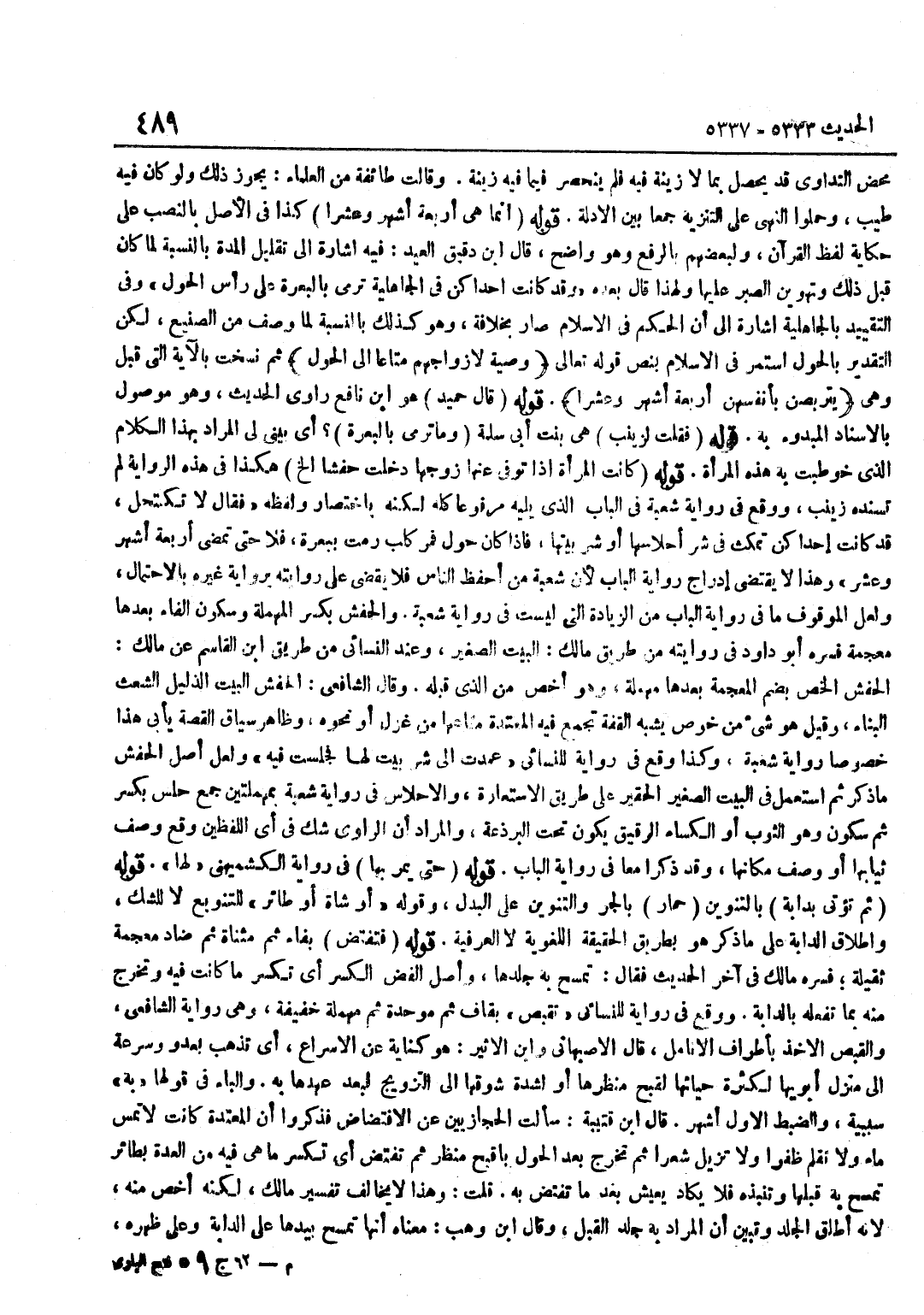 مَحْضَ التَّدَاوِي قَدْ يَحْصُلُ بِمَا لَا زِينَةَ فِيهِ فَلَمْ يَنْحَصِرْ فِيمَا فِيهِ زِينَةٌ وَقَالَتْ طَائِفَةٌ مِنَ الْعُلَمَاءِ يَجُوزُ ذَلِكَ وَلَوْ كَانَ فِيهِ طِيبٌ وَحَمَلُوا النَّهْيَ عَلَى التَّنْزِيهِ جَمْعًا بَيْنَ الْأَدِلَّةِ قَوْلُهُ إِنَّمَا هيَ أَرْبَعَةَ أَشْهُرٍ وَعَشْرًا كَذَا فِي الْأَصْلِ بِالنَّصْبِ عَلَى حِكَايَةِ لَفْظِ الْقُرْآنِ وَلِبَعْضِهِمْ بِالرَّفْعِ وَهُوَ وَاضِحٌ قَالَ بن دَقِيقِ الْعِيدِ فِيهِ إِشَارَةٌ إِلَى تَقْلِيلِ الْمُدَّةِ بِالنِّسْبَةِ لِمَا كَانَ قَبْلَ ذَلِكَ وَتَهْوِينُ الصَّبْرِ عَلَيْهَا وَلِهَذَا قَالَ بَعْدَهُ وَقَدْ كَانَتْ إِحْدَاكُنَّ فِي الْجَاهِلِيَّةِ تَرْمِي بِالْبَعْرَةِ عَلَى رَأْسِ الْحَوْلِ وَفِي التَّقْيِيدِ بِالْجَاهِلِيَّةِ إِشَارَةٌ إِلَى أَنَّ الْحُكْمَ فِي الْإِسْلَامِ صَارَ بِخِلَافِهِ وَهُوَ كَذَلِكَ بِالنِّسْبَةِ لِمَا وُصِفَ مِنَ الصَّنِيعُ لَكِنَّ التَّقْدِيرَ بِالْحَوْلِ اسْتَمَرَّ فِي الْإِسْلَامِ بِنَصِّ قَوْلِهِ تَعَالَى وَصِيَّةً لازواجهم مَتَاعا إِلَى الْحول ثُمَّ نُسِخَتْ بِالْآيَةِ الَّتِي قَبْلُ وَهِيَ يَتَرَبَّصْنَ بِأَنْفُسِهِنَّ أَرْبَعَة أشهر وَعشرا قَوْله قَالَ حميد هُوَ بن نَافِعٍ رَاوِي الْحَدِيثِ وَهُوَ مَوْصُولٌ بِالْإِسْنَادِ الْمَبْدُوءِ بِهِ قَوْلُهُ فَقُلْتُ لِزَيْنَبَ هِيَ بِنْتُ أَبِي سَلَمَةَ وَمَا تَرْمِي بِالْبَعْرَةِ أَيْ بَيِّنِي لِي الْمُرَادَ بِهَذَا الْكَلَامِ الَّذِي خُوطِبَتْ بِهِ هَذِهِ الْمَرْأَةُ قَوْلُهُ كَانَتِ الْمَرْأَةُ إِذَا تُوُفِّيَ عَنْهَا زَوْجُهَا دَخَلَتْ حِفْشًا إِلَخْ هَكَذَا فِي هَذِهِ الرِّوَايَةِ لَمْ تُسْنِدْهُ زَيْنَبُ وَوَقَعَ فِي رِوَايَةِ شُعْبَةَ فِي الْبَابِ الَّذِي يَلِيهِ مَرْفُوعًا كُلُّهُ لَكِنَّهُ بِاخْتِصَارٍ وَلَفْظُهُ فَقَالَ لَا تَكْتَحِلُ قَدْ كَانَتْ إِحْدَاكُنَّ تَمْكُثُ فِي شَرِّ أَحْلَاسِهَا أَوْ شَرِّ بَيْتِهَا فَإِذَا كَانَ حَوْلٌ فَمَرَّ كَلْبٌ رَمَتْ بِبَعْرَةٍ فَلَا حَتَّى تَمْضِيَ أَرْبَعَةُ أَشْهُرٍ وَعَشْرٌ وَهَذَا لَا يَقْتَضِي إِدْرَاجَ رِوَايَةِ الْبَابِ لِأَنَّ شُعْبَةَ مِنْ أَحْفَظِ النَّاسِ فَلَا يَقْضِي عَلَى رِوَايَتِهِ بِرِوَايَةِ غَيْرِهِ بِالِاحْتِمَالِ وَلَعَلَّ الْمَوْقُوفَ مَا فِي رِوَايَةِ الْبَابِ مِنَ الزِّيَادَةِ الَّتِي لَيْسَتْ فِي رِوَايَةِ شُعْبَةَ وَالْحِفْشُ بِكَسْرِ الْمُهْمَلَةِ وَسُكُونِ الْفَاءِ بَعْدَهَا مُعْجَمَةٌ فَسَّرَهُ أَبُو دَاوُدَ فِي رِوَايَتِهِ مِنْ طَرِيقِ مَالِكٍ الْبَيْتُ الصَّغِيرُ وَعند النَّسَائِيّ من طَرِيق بن الْقَاسِمِ عَنْ مَالِكٍ الْحِفْشُ الْخُصُّ بِضَمِّ الْمُعْجَمَةِ بَعْدَهَا مُهْمَلَةٌ وَهُوَ أَخَصُّ مِنَ الَّذِي قَبْلَهُ وَقَالَ الشَّافِعِيُّ الْحِفْشُ الْبَيْتُ الذَّلِيلُ الشَّعِثُ الْبِنَاءِ وَقِيلَ هُوَ شَيْءٌ مِنْ خُوصٍ يُشْبِهُ الْقُفَّةَ تَجْمَعُ فِيهِ الْمُعْتَدَّةُ مَتَاعَهَا مِنْ غَزْلٍ أَوْ نَحْوِهِ وَظَاهِرُ سِيَاقِ الْقِصَّةِ يَأْبَى هَذَا خُصُوصًا رِوَايَةَ شُعْبَةَ وَكَذَا وَقَعَ فِي رِوَايَةٍ لِلنَّسَّائِيَّ عَمَدَتْ إِلَى شَرِّ بَيْتٍ لَهَا فَجَلَسَتْ فِيهِ وَلَعَلَّ أَصْلَ الْحِفْشُ مَا ذَكَرَ ثُمَّ اسْتُعْمِلَ فِي الْبَيْتِ الصَّغِيرِ الْحَقِيرِ عَلَى طَرِيقِ الِاسْتِعَارَةِ وَالْأَحْلَاسُ فِي رِوَايَةِ شُعْبَةَ بِمُهْمَلَتَيْنِ جَمْعُ حِلْسٍ بِكَسْرٍ ثُمَّ سُكُونٍ وَهُوَ الثَّوْبُ أَوِ الْكِسَاءُ الرَّقِيقُ يَكُونُ تَحْتَ الْبَرْذعَةِ وَالْمُرَادُ أَنَّ الرَّاوِيَ شَكَّ فِي أَيِّ اللَّفْظَيْنِ وَقَعَ وَصْفُ ثِيَابِهَا أَوْ وَصْفُ مَكَانِهَا وَقَدْ ذُكِرَا مَعًا فِي رِوَايَةِ الْبَابِ قَوْلُهُ حَتَّى ي