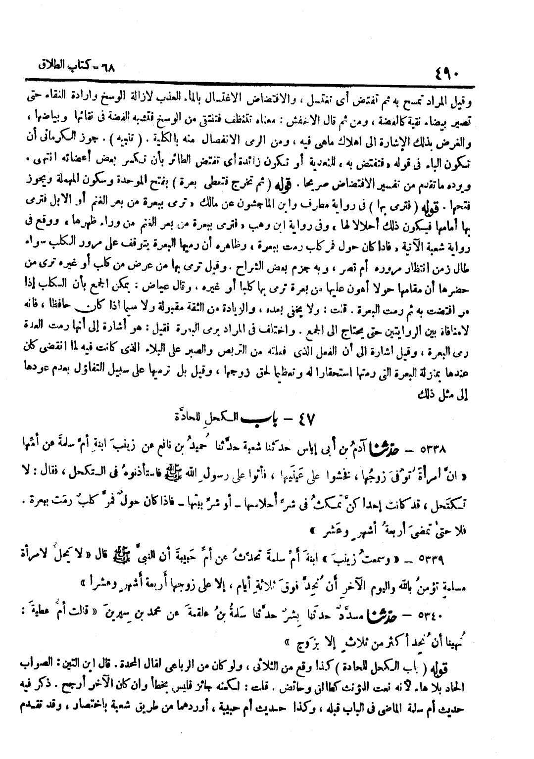 وَقِيلَ الْمُرَادُ تَمْسَحُ بِهِ ثُمَّ تَفْتَضُّ أَيْ تَغْتَسِلُ وَالِافْتِضَاضُ الِاغْتِسَالُ بِالْمَاءِ الْعَذْبِ لِإِزَالَةِ الْوَسَخِ وَإِرَادَةِ النَّقَاءِ حَتَّى تَصِيرَ بَيْضَاءَ نَقِيَّةً كَالْفِضَّةِ وَمن ثمَّ قَالَ الْأَخْفَش مَعْنَاهُ تنتظف فَتَنْتَقِي مِنَ الْوَسَخِ فَتُشْبِهُ الْفِضَّةَ فِي نَقَائِهَا وَبَيَاضِهَا وَالْغَرَضُ بِذَلِكَ الْإِشَارَةُ إِلَى إِهْلَاكِ مَا هيَ فِيهِ وَمِنَ الرَّمْيِ الِانْفِصَالُ مِنْهُ بِالْكُلِّيَّةِ تَنْبِيهٌ جَوَّزَ الْكِرْمَانِيُّ أَنْ تَكُونَ الْبَاءُ فِي قَوْلِهِ فَتَفْتَضُّ بِهِ لِلتَّعَدِّيَةِ أَوْ تَكُونَ زَائِدَةً أَيْ تَفْتَضُّ الطَّائِرَ بِأَنْ تَكْسِرُ بَعْضَ أَعْضَائِهِ انْتَهَى وَيَرُدُّهُ مَا تَقَدَّمَ مِنْ تَفْسِيرِ الِافْتِضَاضِ صَرِيحًا قَوْلُهُ ثُمَّ تَخْرُجُ فَتُعْطَى بَعْرَةً بِفَتْحِ الْمُوَحَّدَةِ وَسُكُونِ الْمُهْمَلَةِ وَيَجُوزُ فَتْحُهَا قَوْلُهُ فَتَرْمِي بهَا فِي رِوَايَة مطرف وبن الْمَاجِشُونِ عَنْ مَالِكٍ تَرْمِي بِبَعْرَةٍ مِنْ بَعْرِ الْغَنَمِ أَوِ الْإِبِلِ فَتَرْمِي بِهَا أَمَامَهَا فَيَكُونُ ذَلِك احلالا لَهَا وَفِي رِوَايَة بن وَهْبٍ فَتَرْمِي بِبَعْرَةٍ مِنْ بَعْرِ الْغَنَمِ مِنْ وَرَاءِ ظَهْرِهَا وَوَقَعَ فِي رِوَايَةِ شُعْبَةَ الْآتِيَةِ فَإِذَا كَانَ حَوْلٌ فَمَرَّ كَلْبٌ رَمَتْ بِبَعْرَةٍ وَظَاهِرُهُ أَنَّ رَمْيَهَا الْبَعْرَةَ يَتَوَقَّفُ عَلَى مُرُورِ الْكَلْبِ سَوَاءٌ طَالَ زَمَنُ انْتِظَارِ مُرُورِهِ أَمْ قَصُرَ وَبِهِ جَزَمَ بَعْضُ الشُّرَّاحِ وَقِيلَ تَرْمِي بِهَا مَنْ عَرَضَ مِنْ كَلْبٍ أَوْ غَيْرِهِ تُرِي مَنْ حَضَرَهَا أَنَّ مُقَامَهَا حَوْلًا أَهْوَنُ عَلَيْهَا مِنْ بَعْرَةٍ تَرْمِي بِهَا كَلْبًا أَوْ غَيْرَهُ وَقَالَ عِيَاضٌ يُمْكِنُ الْجَمْعُ بِأَنَّ الْكَلْبَ إِذَا مَرَّ افْتُضَّتْ بِهِ ثُمَّ رَمَتِ الْبَعْرَةَ قُلْتُ وَلَا يَخْفَى بُعْدُهُ وَالزِّيَادَةُ مِنَ الثِّقَةِ مَقْبُولَةٌ وَلَا سِيَّمَا إِذَا كَانَ حَافِظًا فَإِنَّهُ لَا مُنَافَاةَ بَيْنَ الرِّوَايَتَيْنِ حَتَّى يَحْتَاجَ إِلَى الْجَمْعِ وَاخْتُلَفَ فِي الْمُرَادِ بِرَمْيِ الْبَعْرَةِ فَقِيلَ هُوَ إِشَارَةٌ إِلَى أَنَّهَا رَمَتِ الْعِدَّةَ رَمْيَ الْبَعْرَةِ وَقِيلَ إِشَارَةٌ إِلَى أَنَّ الْفِعْلَ الَّذِي فَعَلَتْهُ مِنَ التَّرَبُّصِ وَالصَّبْرِ عَلَى الْبَلَاءِ الَّذِي كَانَتْ فِيهِ لِمَا انْقَضَى كَانَ عِنْدَهَا بِمَنْزِلَةِ الْبَعْرَةِ الَّتِي رَمَتْهَا اسْتِحْقَارًا لَهُ وَتَعْظِيمًا لِحَقِّ زَوْجِهَا وَقِيلَ بَلْ تَرْمِيهَا عَلَى سَبِيلِ التَّفَاؤُلِ بِعَدَمِ عودهَا إِلَى مثل ذَلِك