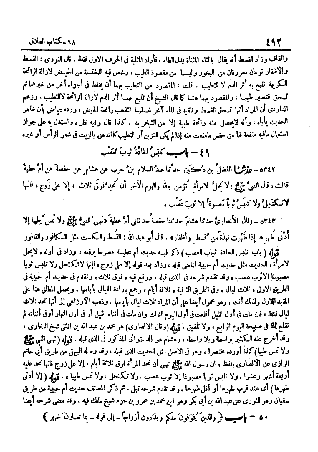 [5342] قَوْلِهِ إِلَّا عَلَى زَوْجٍ فَإِنَّهَا لَا تَكْتَحِلُ وَلَا تَلْبَسُ ثَوْبًا مَصْبُوغًا إِلَّا ثَوْبَ عَصْبٍ وَقَدْ تَقَدَّمَ شَرْحُهُ فِي الَّذِي قَبْلَهُ وَوَقَعَ فِيهِ فَوْقَ ثَلَاثٍ وَتَقَدَّمَ فِي حَدِيثِ أُمِّ حَبِيبَةَ فِي الطَّرِيقِ الْأُولَى ثَلَاثَ لَيَالٍ وَفِي الطَّرِيقِ الثَّانِيَةِ ثَلَاثَةَ أَيَّامٍ وَجُمِعَ بِإِرَادَةِ اللَّيَالِي بِأَيَّامِهَا وَيُحْمَلُ الْمُطْلَقُ هُنَا عَلَى الْمُقَيَّدِ الْأَوَّلِ وَلِذَلِكَ أَنَّثَ وَهُوَ مَحْمُولٌ أَيْضًا عَلَى أَنَّ الْمُرَادَ ثَلَاثُ لَيَالٍ بِأَيَّامِهَا وَذَهَبَ الْأَوْزَاعِيُّ إِلَى أَنَّهَا تَحُدُّ ثَلَاثَ لَيَالٍ فَقَطْ فَإِنْ مَاتَ فِي أَوَّلِ اللَّيْلِ أَقْلَعَتْ فِي أَوَّلِ الْيَوْمِ الثَّالِثِ وَإِنْ مَاتَ فِي أَثْنَاءِ اللَّيْلِ أَوْ فِي أَوَّلِ النَّهَارِ أَوْ فِي أَثْنَائِهِ لَمْ تُقْلِعْ إِلَّا فِي صَبِيحَةِ الْيَوْمِ الرَّابِعِ وَلَا تَلْفِيقَ قَوْلُهُ وَقَالَ الْأَنْصَارِيُّ هُوَ مُحَمَّدُ بْنُ عَبْدِ اللَّهِ بْنِ الْمُثَنَّى شَيْخُ الْبُخَارِيِّ وَقَدْ أَخْرَجَ عَنْهُ الْكَثِيرَ بِوَاسِطَةٍ وَبِلَا وَاسِطَةٍ وَهِشَامٌ هُوَ الدَّسْتُوَائِيُّ الْمَذْكُورُ فِي الَّذِي قَبْلَهُ قَوْلُهُ نَهَى النَّبِيُّ صَلَّى اللَّهُ عَلَيْهِ وَسَلَّمَ وَلَا تَمَسُّ طِيبًا كَذَا أَوْرَدَهُ مُخْتَصَرًا وَهُوَ فِي الْأَصْلِ مِثْلُ الْحَدِيثِ الَّذِي قَبْلَهُ وَقَدْ وَصَلَهُ الْبَيْهَقِيُّ مِنْ طَرِيقِ أَبِي حَاتِمٍ الرَّازِيِّ عَنْ الْأَنْصَارِيِّ بِلَفْظِ أَنَّ رَسُولَ اللَّهِ صَلَّى اللَّهُ عَلَيْهِ وَسَلَّمَ نَهَى أَنْ تُحِدَّ الْمَرْأَةُ فَوْقَ ثَلَاثَةِ أَيَّامٍ إِلَّا عَلَى زَوْجٍ فَإِنَّهَا تُحِدُّ عَلَيْهِ أَرْبَعَةَ أَشْهُرٍ وَعَشْرًا وَلَا تَلْبَسُ ثَوْبًا مَصْبُوغًا إِلَّا ثَوْبَ عَصْبٍ وَلَا تَكْتَحِلُ وَلَا تَمَسُّ طِيبًا قَوْلُهُ إِلَّا أَدْنَى طُهْرِهَا أَيْ عِنْدَ قُرْبِ طُهْرِهَا أَوْ أَقَلَّ طُهْرِهَا وَقَدْ تَقَدَّمَ شَرْحُهُ قَبْلُ ثُمَّ ذَكَرَ الْمُصَنِّفُ حَدِيثَ أُمِّ حَبِيبَةَ مِنْ طَرِيقِ سُفْيَانَ وَهُوَ الثَّوْرِيِّ عَنْ عَبْدِ اللَّهِ بْنِ أَبِي بَكْرِ وَهُوَ بن مُحَمَّدِ بْنِ عَمْرِو بْنِ حَزْمٍ شَيْخُ مَالِكٍ فِيهِ وَقد مضى شَرحه أَيْضا
