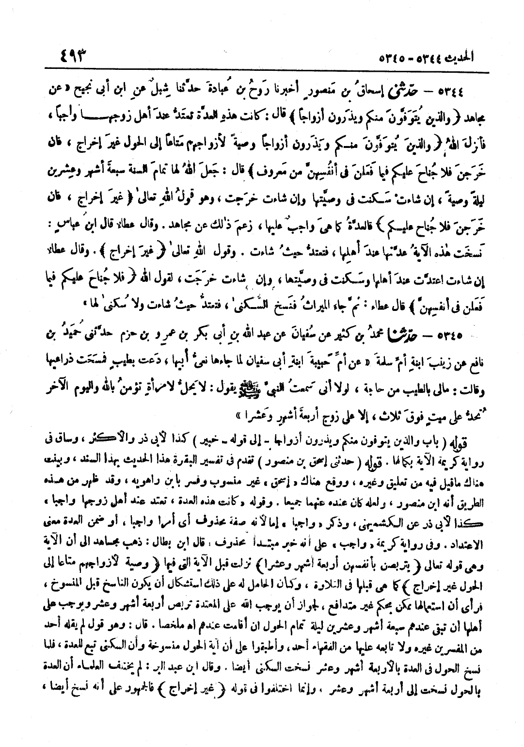 [5344] قَوْلُهُ حَدَّثَنِي إِسْحَاقُ بْنُ مَنْصُورٍ تَقَدَّمَ فِي تَفْسِيرِ الْبَقَرَةِ هَذَا الْحَدِيثُ بِهَذَا السَّنَدِ وَبَيَّنْتُ هُنَاكَ مَا قِيلَ فِيهِ مِنْ تَعْلِيقٍ وَغَيْرِهِ وَوَقَعَ هُنَاكَ إِسْحَاقُ غَيْرَ مَنْسُوبٍ وَفُسِّرَ بِابْنِ رَاهْوَيْهِ وَقَدْ ظَهَرَ مِنْ هَذِه الطَّرِيق أَنه بن مَنْصُورٍ وَلَعَلَّهُ كَانَ عِنْدَهُ عَنْهُمَا جَمِيعًا وَقَوْلُهُ كَانَتْ هَذِهِ الْعِدَّةُ تَعْتَدُّ عِنْدَ أَهْلِ زَوْجِهَا وَاجِبًا كَذَا لِأَبِي ذَرٍّ عَنِ الْكُشْمِيهَنِيِّ وَذَكَرَ وَاجِبًا إِمَّا لِأَنَّهُ صِفَةُ مَحْذُوفٍ أَيْ أَمْرًا وَاجِبًا أَوْ ضَمَّنَ الْعِدَّةَ مَعْنَى الِاعْتِدَادِ وَفِي رِوَايَةِ كَرِيمَةَ وَاجِبٌ عَلَى أَنَّهُ خَبَرُ مُبْتَدَأٍ مَحْذُوف قَالَ بن بَطَّالٍ ذَهَبَ مُجَاهِدٌ إِلَى أَنَّ الْآيَةَ وَهِيَ قَوْلُهُ تَعَالَى يَتَرَبَّصْنَ بِأَنْفُسِهِنَّ أَرْبَعَةَ أَشْهُرٍ وَعَشْرًا نَزَلَتْ قَبْلَ الْآيَةِ الَّتِي فِيهَا وَصِيَّةً لِأَزْوَاجِهِمْ مَتَاعًا إِلَى الْحَوْلِ غَيْرَ إِخْرَاجٍ كَمَا هيَ قَبْلَهَا فِي التِّلَاوَةِ وَكَأَنَّ الْحَامِلَ لَهُ عَلَى ذَلِكَ اسْتِشْكَالُ أَنْ يَكُونَ النَّاسِخُ قَبْلَ الْمَنْسُوخِ فَرَأَى أَنَّ اسْتِعْمَالَهَا مُمْكِنٌ بِحُكْمٍ غَيْرِ مُتَدَافِعٍ لِجَوَازِ أَنْ يُوجِبَ اللَّهُ عَلَى الْمُعْتَدَّةِ تَرَبُّصَ أَرْبَعَةِ أَشْهُرٍ وَعَشْرٍ وَيُوجِبُ عَلَى أَهْلِهَا أَنْ تَبْقَى عِنْدَهُمْ سَبْعَةَ أَشْهُرٍ وَعِشْرِينَ لَيْلَةً تَمَامَ الْحَوْلِ إِنْ أَقَامَتْ عِنْدَهُمُ اه مُلَخَّصًا قَالَ وَهُوَ قَوْلٌ لَمْ يَقْلُهُ أَحَدٌ مِنَ الْمُفَسِّرِينَ غَيْرُهُ وَلَا تَابَعَهُ عَلَيْهَا مِنَ الْفُقَهَاءِ أَحَدٌ وَأَطْبَقُوا عَلَى أَنَّ آيَةَ الْحَوْلِ مَنْسُوخَةٌ وَأَنَّ السُّكْنَى تَبَعٌ لِلْعِدَّةِ فَلَمَّا نُسِخَ الْحَوْلُ فِي الْعِدَّةِ بِالْأَرْبَعَةِ أَشْهُرٍ وَعَشْرٍ نُسِخَتِ السُّكْنَى أَيْضا وَقَالَ بن عَبْدِ الْبَرِّ لَمْ يَخْتَلِفِ الْعُلَمَاءُ أَنَّ الْعِدَّةَ بِالْحَوْلِ نُسِخَتْ إِلَى أَرْبَعَةِ أَشْهُرٍ وَعَشْرٍ وَإِنَّمَا اخْتلفُوا فِي قَوْله غير إِخْرَاج فالجمهور على أَنه نسخ أَيْضا