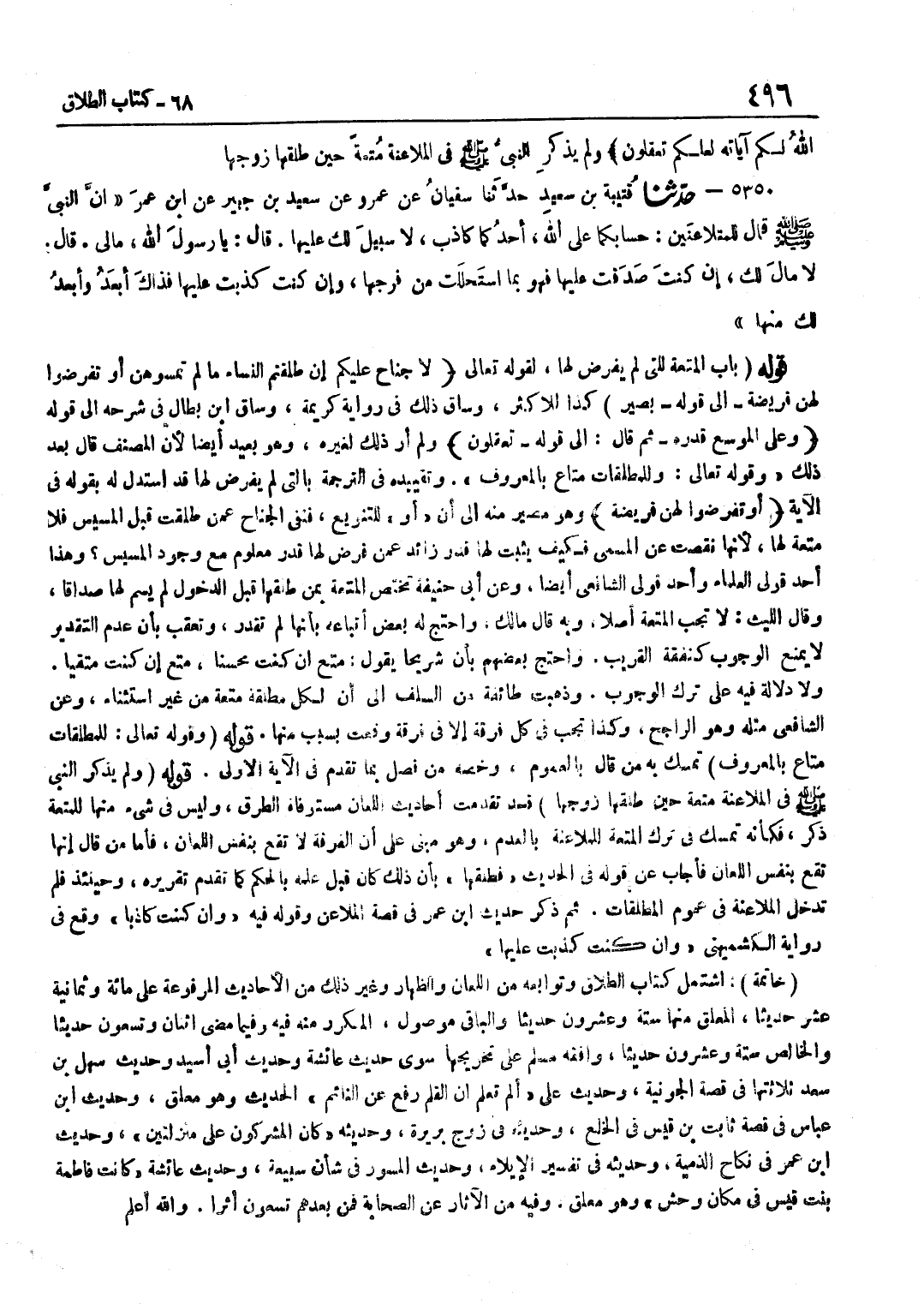 لَهَا لِقَوْلِهِ تَعَالَى لَا جُنَاحَ عَلَيْكُمْ إِنْ طَلَّقْتُمُ النِّسَاءَ مَا لَمْ تَمَسُّوهُنَّ أَوْ تَفْرِضُوا لَهُنَّ فَرِيضَة إِلَى قَوْله بَصِير كَذَا لِلْأَكْثَرِ وَسَاقَ ذَلِكَ فِي رِوَايَةِ كَرِيمَةَ وسَاق بن بطال فِي شَرحه إِلَى قَوْله وعَلى الموسع قدره ثمَّ قَالَ إِلَى قَوْله تعقلون وَلَمْ أَرَ ذَلِكَ لِغَيْرِهِ وَهُوَ بَعِيدٌ أَيْضًا لِأَنَّ الْمُصَنِّفَ قَالَ بَعْدَ ذَلِكَ وَقَوْلُهُ تَعَالَى وللمطلقات مَتَاع بِالْمَعْرُوفِ وَتَقْيِيدُهُ فِي التَّرْجَمَةِ بِالَّتِي لَمْ يُفْرَضْ لَهَا قَدِ اسْتَدَلَّ لَهُ بِقَوْلِهِ فِي الْآيَةِ أَوْ تفرضوا لَهُنَّ فَرِيضَة وَهُوَ مَصِيرٌ مِنْهُ إِلَى أَنَّ أَوْ لِلتَّنْوِيعِ فَنَفَى الْجُنَاحَ عَمَّنْ طَلُقَتْ قَبْلَ الْمَسِيسِ فَلَا مُتْعَةَ لَهَا لِأَنَّهَا نَقَصَتْ عَنِ الْمُسَمَّى فَكَيْفَ يَثْبُتُ لَهَا قَدْرٌ زَائِدٌ عَمَّنْ فُرِضَ لَهَا قَدْرٌ مَعْلُومٌ مَعَ وُجُودِ الْمَسِيسِ وَهَذَا أَحَدُ قَوْلَيِ الْعُلَمَاءِ وَأَحَدُ قَوْلَيِ الشَّافِعِيِّ أَيْضًا وَعَنْ أَبِي حَنِيفَةَ تَخْتَصُّ الْمُتْعَةُ بِمِنْ طَلَّقَهَا قَبْلَ الدُّخُولِ لَمْ يُسَمِّ لَهَا صَدَاقًا وَقَالَ اللَّيْثُ لَا تَجِبُ الْمُتْعَةُ أَصْلًا وَبِهِ قَالَ مَالِكٌ وَاحْتَجَّ لَهُ بَعْضُ أَتْبَاعِهِ بِأَنَّهَا لَمْ تُقَدَّرْ وَتُعُقِّبَ بِأَنَّ عَدَمَ التَّقْدِيرِ لَا يَمْنَعُ الْوُجُوبَ كَنَفَقَةِ الْقَرِيبِ وَاحْتَجَّ بَعْضُهُمْ بِأَنَّ شُرَيْحًا يَقُولُ مَتِّعْ إِنْ كُنْتَ مُحْسِنًا مَتِّعْ إِنْ كُنْتَ مُتَّقِيًا وَلَا دَلَالَةَ فِيهِ عَلَى تَرْكِ الْوُجُوبِ وَذَهَبَتْ طَائِفَةٌ مِنَ السَّلَفِ إِلَى أَنَّ لِكُلِّ مُطلقَة مُتْعَة من غير اسْتِثْنَاءٍ وَعَنِ الشَّافِعِيِّ مِثْلُهُ وَهُوَ الرَّاجِحُ وَكَذَا تَجِبُ فِي كُلِّ فُرْقَةٍ إِلَّا فِي فُرْقَةٍ وَقعت بِسَبَب مِنْهَا قَوْله وَقَوله تَعَالَى للمطلقات مَتَاع بِالْمَعْرُوفِ تَمَسَّكَ بِهِ مَنْ قَالَ بِالْعُمُومِ وَخَصَّهُ مَنْ فَصَلَ بِمَا تَقَدَّمَ فِي الْآيَةِ الْأُولَى قَوْلُهُ وَلَمْ يَذْكُرِ النَّبِيَّ صَلَّى اللَّهُ عَلَيْهِ وَسَلَّمَ فِي الْمُلَاعَنَةِ مُتْعَةً حِينَ طَلَّقَهَا زَوْجُهَا قَدْ تَقَدَّمَتْ أَحَادِيثُ اللِّعَانِ مُسْتَوْفَاةَ الطُّرُقِ وَلَيْسَ فِي شَيْءٍ مِنْهَا لِلْمُتْعَةِ ذِكْرٌ فَكَأَنَّهُ تَمَسَّكَ فِي تَرْكِ الْمُتْعَةِ لِلْمُلَاعَنَةِ بِالْعَدَمِ وَهُوَ مَبْنِيٌّ عَلَى أَنَّ الْفُرْقَةَ لَا تَقَعُ بِنَفْسِ اللِّعَانِ فَأَمَّا مَنْ قَالَ إِنَّهَا تَقَعُ بِنَفْسِ اللِّعَانِ فَأَجَابَ عَنْ قَوْلِهِ فِي الْحَدِيثِ فَطَلَّقَهَا بِأَنَّ ذَلِكَ كَانَ قَبْلَ عِلْمِهِ بِالْحُكْمِ كَمَا تَقَدَّمَ تَقْرِيرُهُ وَحِينَئِذٍ فَلَمْ تَدْخُلِ الْمُلَاعَنَةُ فِي عُمُومِ الْمُطَلَّقَاتِ ثمَّ ذكر حَدِيث بن عُمَرَ فِي قِصَّةِ الْمُلَاعَنِ وَقَوْلَهُ فِيهِ وَإِنْ كُنْتَ كَاذِبًا وَقَعَ فِي رِوَايَةِ الْكُشْمِيهَنِيِّ وَإِنْ كُنْتَ كَذَبْتَ عَلَيْهَا خَاتِمَةٌ اشْتَمَلَ كِتَابُ الطَّلَاقِ وَتَوَابِعِهِ مِنَ اللِّعَانِ وَالظِّهَارِ وَغَيْرِ ذَلِكَ مِنَ الْأَحَادِيثِ الْمَرْفُوعَةِ عَلَى مِائَةٍ وَثَمَانِيَةَ عَشَرَ حَدِيثًا الْمُعَلَّقُ مِنْهَا سِتَّةٌ وَعِشْرُونَ حَدِيثًا وَالْبَاقِي مَوْصُولٌ الْمُكَرَّرُ مِنْهُ فِيهِ وَفِيمَا مَضَى اثْنَانِ وَتِسْعُونَ حَدِيثًا وَالْخَالِصُ سِتَّةٌ وَعِشْرُونَ حَدِيثًا وَافَقَهُ مُسْلِمٌ عَلَى تَخْرِيجِهَا سِوَى حَدِيثِ عَائِشَةَ وَحَدِيثِ أَبِي أُسَيْدٍ وَحَدِيثِ سَهْلِ بْنِ سَعْدٍ ثَلَاثَتُهَا فِي قِصَّةِ الْجَوْنِيَّةِ وَحَدِيثِ عَلِيٌّ أَلَمْ تَعْلَمْ أَنَّ الْقَلَمَ رُفِعَ عَنْ النَّائِمِ الْحَدِيثَ وَهُوَ مُعَلَّ