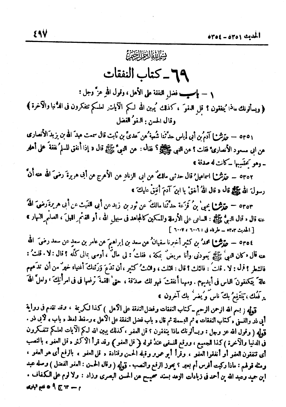 كَذَا لِكَرِيمَةَ وَقَدْ تَقَدَّمَ فِي رِوَايَةِ أَبِي ذَرٍّ وَالنَّسَفِيِّ كِتَابُ النَّفَقَاتِ ثُمَّ الْبَسْمَلَةُ ثُمَّ قَالَ بَابُ فَضْلِ النَّفَقَةِ عَلَى الْأَهْلِ وَسَقَطَ لَفْظُ بَابٍ لِأَبِي ذَرٍّ قَوْلُهُ وَقَوْلُ اللَّهِ عَزَّ وَجَلَّ وَيَسْأَلُونَكَ مَاذَا يُنْفِقُونَ قُلِ الْعَفْوَ كَذَلِكَ يُبَيِّنُ اللَّهُ لَكُمُ الْآيَاتِ لَعَلَّكُمْ تَتَفَكَّرُونَ فِي الدُّنْيَا وَالْآخِرَةِ كَذَا لِلْجَمِيعِ وَوَقَعَ لِلنَّسَفِيِّ عِنْدَ قَوْلِهِ قُلِ الْعَفْوَ وَقَدْ قَرَأَ الْأَكْثَرُ قُلِ الْعَفْوَ بِالنَّصْبِ أَيْ تُنْفِقُونَ الْعَفْوَ أَوْ أَنْفِقُوا الْعَفْوَ وَقَرَأَ أَبُو عَمْرٍو وَقَبْلَهُ الْحَسَنُ وَقَتَادَةَ قُلِ الْعَفْوُ بِالرَّفْعِ أَيْ هُوَ الْعَفْوُ وَمِثْلُهُ قَوْلُهُمْ مَاذَا رَكِبْتَ أَفَرَسٌ أَمْ بَعِيرٌ يَجُوزُ الرَّفْعُ وَالنَّصْبُ قَوْلُهُ وَقَالَ الْحَسَنُ الْعَفْوُ الْفَضْلُ وَصَلَهُ عَبْدُ بْنُ حُمَيْدٍ وَعَبْدُ اللَّهِ بْنُ أَحْمَدَ فِي زِيَادَاتِ الزُّهْدِ بِسَنَدٍ صَحِيحٍ عَنِ الْحَسَنِ الْبَصْرِيِّ وَزَادَ وَلَا لَوْمَ عَلَى الْكَفَافِ