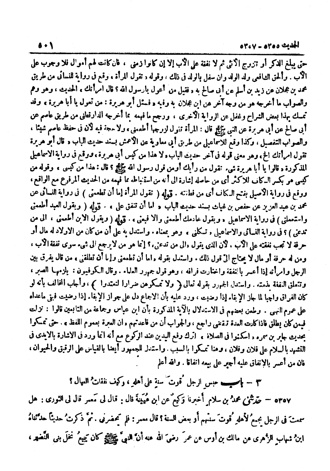 حَتَّى يَبْلُغَ الذَّكَرُ أَوْ تَتَزَوَّجَ الْأُنْثَى ثُمَّ لَا نَفَقَةَ عَلَى الْأَبِ إِلَّا إِنْ كَانُوا زَمْنَى فَإِنْ كَانَتْ لَهُمْ أَمْوَالٌ فَلَا وُجُوبَ عَلَى الْأَبِ وَأَلْحَقَ الشَّافِعِيُّ وَلَدَ الْوَلَدِ وَإِنْ سَفَلَ بِالْوَلَدِ فِي ذَلِكَ وَقَوْلُهُ تَقُولُ الْمَرْأَةُ وَقع فِي رِوَايَةِ النَّسَائِيِّ مِنْ طَرِيقِ مُحَمَّدِ بْنِ عَجْلَانَ عَنْ زَيْدٍ بْنِ أَسْلَمَ عَنْ أَبِي صَالِحٍ بِهِ فَقِيلَ مَنْ أَعُولُ يَا رَسُولَ اللَّهِ قَالَ امْرَأَتَكَ الْحَدِيثَ وَهُوَ وَهْمٌ وَالصَّوَابُ مَا أَخْرَجَهُ هُوَ من وَجه آخر عَن بن عَجْلَانَ بِهِ وَفِيهِ فَسُئِلَ أَبُو هُرَيْرَةُ مَنْ تَعُولُ يَا أَبَا هُرَيْرَةَ وَقَدْ تَمَسَّكَ بِهَذَا بَعْضُ الشُّرَّاحِ وَغَفَلَ عَنِ الرِّوَايَةِ الْأُخْرَى وَرَجَّحَ مَا فَهِمَهُ بِمَا أَخْرَجَهُ الدَّارَقُطْنِيُّ مِنْ طَرِيقِ عَاصِمٌ عَنْ أَبِي صَالِحٍ عَنْ أَبِي هُرَيْرَةَ عَنْ النَّبِيِّ صَلَّى اللَّهُ عَلَيْهِ وَسَلَّمَ قَالَ الْمَرْأَةُ تَقُولُ لِزَوْجِهَا أَطْعِمْنِي وَلَا حُجَّةَ فِيهِ لِأَنَّ فِي حِفْظِ عَاصِمٍ شَيْئًا وَالصَّوَابُ التَّفْصِيلُ وَكَذَا وَقَعَ لِلْإِسْمَاعِيلِيِّ مِنْ طَرِيقِ أَبِي مُعَاوِيَةَ عَنِ الْأَعْمَشِ بِسَنَدِ حَدِيثِ الْبَابِ قَالَ أَبُو هُرَيْرَةَ تَقُولُ امْرَأَتُكَ إِلَخْ وَهُوَ مَعْنَى قَوْلِهِ فِي آخِرِ حَدِيثِ الْبَابِ لَا هَذَا مِنْ كيس أبي هُرَيْرَة وَوَقع فِي رِوَايَةِ الْإِسْمَاعِيلِيِّ الْمَذْكُورَةِ قَالُوا يَا أَبَا هُرَيْرَةَ شَيْءٌ تَقُولُ مِنْ رَأْيكِ أَوْ مِنْ قَوْلُ رَسُولَ اللَّهِ صَلَّى اللَّهُ عَلَيْهِ وَسَلَّمَ قَالَ هَذَا مِنْ كِيسِي وَقَوْلُهُ مِنْ كِيسِي هُوَ بِكَسْرِ الْكَافِ لِلْأَكْثَرِ أَيْ مِنْ حَاصِلِهِ إِشَارَةٌ إِلَى أَنَّهُ مِنَ اسْتِنْبَاطِهِ مِمَّا فَهِمَهُ مِنَ الْحَدِيثِ الْمَرْفُوعِ مَعَ الْوَاقِعِ وَوَقَعَ فِي رِوَايَةِ الْأَصِيلِيِّ بِفَتْحِ الْكَافِ أَيْ مِنْ فِطْنَتِهِ قَوْلُهُ تَقُولُ الْمَرْأَةُ إِمَّا أَنْ تُطْعِمَنِي فِي رِوَايَةِ النَّسَائِيِّ عَنْ مُحَمَّدِ بْنِ عَبْدِ الْعَزِيزِ عَنْ حَفْصِ بْنِ غِيَاثٍ بِسَنَدِ حَدِيثِ الْبَابِ إِمَّا أَنْ تُنْفِقَ عَلَيَّ قَوْلُهُ وَيَقُولُ الْعَبْدُ اطعمني واستعملني فِي رِوَايَة الْإِسْمَاعِيلِيّ وَبقول خَادِمُكَ أَطْعِمْنِي وَإِلَّا فَبِعْنِي قَوْلُهُ وَيَقُولُ الِابْنُ أَطْعِمْنِي إِلَى مَنْ تَدَعُنِي فِي رِوَايَةِ النَّسَائِيِّ وَالْإِسْمَاعِيلِيِّ تَكِلُنِي وَهُوَ بِمَعْنَاهُ وَاسْتُدِلَّ بِهِ عَلَى أَنَّ مَنْ كَانَ مِنَ الْأَوْلَادِ لَهُ مَالٌ أَوْ حِرْفَةٌ لَا تَجِبُ نَفَقَتُهُ عَلَى الْأَبِ لِأَنَّ الَّذِي يَقُولُ إِلَى مِنْ تَدَعُنِي إِنَّمَا هُوَ مَنْ لَا يَرْجِعُ إِلَى شَيْءٍ سِوَى نَفَقَةِ الْأَبِ وَمَنْ لَهُ حِرْفَةٌ أَوْ مَالٌ لَا يَحْتَاجُ إِلَى قَوْلِ ذَلِكَ وَاسْتَدَلَّ بِقَوْلِهِ إِمَّا أَنْ تُطْعِمَنِي وَإِمَّا أَنْ تُطَلِّقَنِي مَنْ قَالَ يُفَرَّقُ بَيْنَ الرَّجُلِ وَامْرَأَتِهِ إِذَا أَعْسَرَ بِالنَّفَقَةِ وَاخْتَارَتْ فِرَاقَهُ وَهُوَ قَوْلُ جُمْهُورِ الْعُلَمَاءِ وَقَالَ الْكُوفِيُّونَ يَلْزَمُهَا الصَّبْرُ وَتَتَعَلَّقُ النَّفَقَةُ بِذِمَّتِهِ وَاسْتَدَلَّ الْجُمْهُورُ بِقَوْلِهِ تَعَالَى وَلَا تُمْسِكُوهُنَّ ضِرَارًا لتعتدوا وَأَجَابَ الْمُخَالِفُ بِأَنَّهُ لَوْ كَانَ الْفِرَاقُ وَاجِبًا لَمَا جَازَ الْإِبْقَاءُ إِذَا رَضِيَتْ وَرُدَّ عَلَيْهِ بِأَنَّ الْإِجْمَاعَ دَلَّ عَلَى جَوَازِ الْإِبْقَاءِ إِذَا رَضِيَتْ فَبَقِيَ مَا عَدَاهُ عَلَى عُمُومِ النَّهْيِ وَطَعَنَ بَعْضُهُمْ فِي الِاسْتِدْلَالِ بِالْآيَةِ الْمَذْكُورَةِ بِأَنَّ بن عَبَّاسٍ وَجَمَاعَةً م