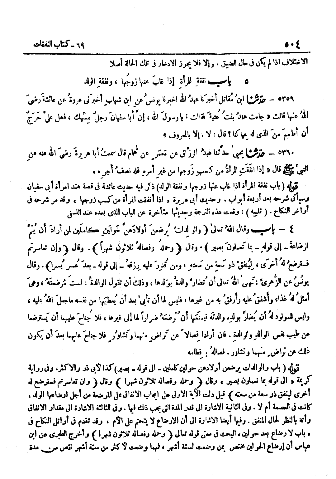 ذَكَرَ فِيهِ حَدِيثَ عَائِشَةَ فِي قِصَّةِ هِنْدٍ امْرَأَةِ أَبِي سُفْيَانَ وَسَيَأْتِي شَرْحُهُ بَعْدَ أَرْبَعَةِ أَبْوَابٍ وَحَدِيثَ أَبِي هُرَيْرَةَ إِذَا أَنْفَقَتِ الْمَرْأَةُ مِنْ كَسْبِ زَوْجِهَا وَقَدْ مَرَّ شَرْحُهُ فِي أَوَاخِرِ النِّكَاحِ تَنْبِيهٌ وَقَعَتْ هَذِهِ التَّرْجَمَةُ وَحَدِيثُهَا مُتَأَخِّرَةً عَنِ الْبَابِ الَّذِي بعده عِنْد النَّسَفِيّ قَوْلُهُ بَابُ وَالْوَالِدَاتُ يُرْضِعْنَ أَوْلَادَهُنَّ حَوْلَيْنِ كَامِلَيْنِ إِلَى قَوْلِهِ بَصِيرٌ كَذَا لِأَبِي ذَرٍّ وَالْأَكْثَرِ وَفِي رِوَايَةِ كَرِيمَةَ إِلَى قَوْلِهِ بِمَا تَعْمَلُونَ بَصِير وَقَالَ وَحمله وفصاله ثَلَاثُونَ شهرا وَقَالَ وَإِنْ تَعَاسَرْتُمْ فَسَتُرْضِعُ لَهُ أُخْرَى لِيُنْفِقْ ذُو سَعَة من سعته قِيلَ دَلَّتِ الْآيَةُ الْأُولَى عَلَى إِيجَابِ الْإِنْفَاقِ على الْمُرضعَة من أجل ارضاعها الْوَلَدَ كَانَتْ فِي الْعِصْمَةِ أَمْ لَا وَفِي الثَّانِيَةِ الْإِشَارَةُ إِلَى قَدْرِ الْمُدَّةِ الَّتِي يَجِبُ ذَلِكَ فِيهَا وَفِي الثَّالِثَةِ الْإِشَارَةُ إِلَى مِقْدَارِ الْإِنْفَاقِ وَأَنَّهُ بِالنَّظَرِ لِحَالِ الْمُنْفِقِ وَفِيهَا أَيْضًا الْإِشَارَةُ إِلَى أَنَّ الْإِرْضَاعَ لَا يَتَحَتَّمُ عَلَى الْأُمِّ وَقَدْ تَقَدَّمَ فِي أَوَائِلِ النِّكَاحِ فِي بَابِ لَا رَضَاعَ بَعْدَ حَوْلَيْنِ الْبَحْثُ فِي مَعْنَى قَوْلِهِ تَعَالَى وَحَمْلُهُ وَفِصَالُهُ ثَلَاثُونَ شَهْرًا وَأخرج الطَّبَرِيّ عَن بن عَبَّاسٍ أَنَّ إِرْضَاعَ الْحَوْلَيْنِ مُخْتَصٌّ بِمَنْ وَضَعَتْ لِسِتَّةِ أَشْهُرٍ فَمَهْمَا وَضَعَتْ لِأَكْثَرَ مِنْ سِتَّةِ أَشْهُرٍ نَقَصَ مِنْ مُدَّةِ