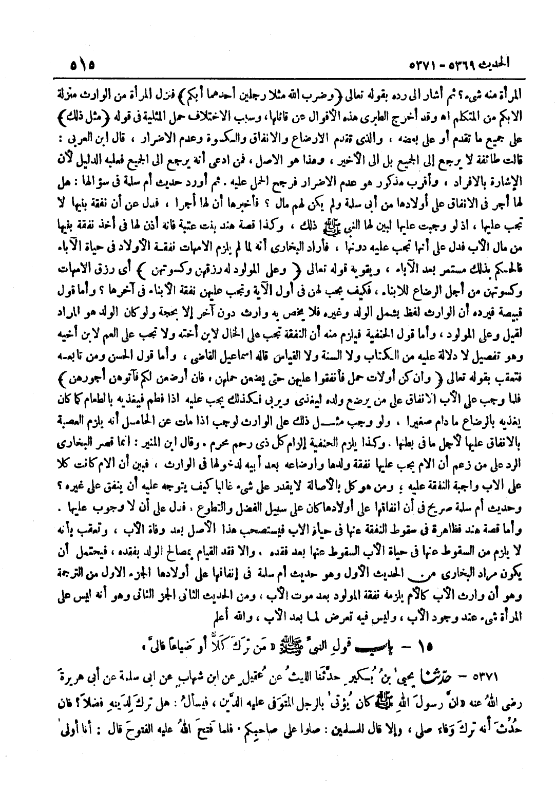 الْمَرْأَةِ مِنْهُ شَيْءٌ وَضَرَبَ اللَّهُ مَثَلًا رَجُلَيْنِ أَحدهمَا ابكم الْآيَةَ كَذَا لِأَبِي ذَرٍّ وَلِغَيْرِهِ بَعْدَ قَوْلِهِ ابكم إِلَى قَوْله صِرَاط مُسْتَقِيم قَالَ بن بَطَّالٍ مَا مُلَخَّصُهُ اخْتَلَفَ السَّلَفُ فِي الْمُرَادِ بقوله وعَلى الْوَارِث مثل ذَلِك فَقَالَ بن عَبَّاسٍ عَلَيْهِ أَنْ لَا يُضَارَّ وَبِهِ قَالَ الشَّعْبِيُّ وَمُجَاهِدٌ وَالْجُمْهُورُ قَالُوا وَلَا غُرْمَ عَلَى أَحَدٍ مِنَ الْوَرَثَةِ وَلَا يَلْزَمُهُ نَفَقَةُ وَلَدِ الْمَوْرُوثِ وَقَالَ آخَرُونَ عَلَى مَنْ يَرِثُ الْأَبَ مِثْلُ مَا كَانَ عَلَى الْأَبِ مِنْ أَجْرِ الرَّضَاعِ إِذَا كَانَ الْوَلَدُ لَا مَالَ لَهُ ثُمَّ اخْتَلَفُوا فِي الْمُرَادِ بِالْوَارِثِ فَقَالَ الْحَسَنُ وَالنَّخَعِيُّ هُوَ كُلُّ مَنْ يَرِثُ الْأَبَ مِنَ الرِّجَالِ وَالنِّسَاءِ وَهُوَ قَوْلُ أَحْمَدَ وَإِسْحَاقَ وَقَالَ أَبُو حَنِيفَةَ وَأَصْحَابُهُ هُوَ مَنْ كَانَ ذَا رَحِمٍ مَحْرَمٍ لِلْمَوْلُودِ دُونَ غَيْرِهِ وَقَالَ قَبِيصَةُ بْنُ ذُؤَيْبٍ هُوَ الْمَوْلُودُ نَفْسُهُ وَقَالَ زَيْدُ بْنُ ثَابِتٍ إِذَا خَلَّفَ أُمًّا وَعَمًّا فَعَلَى كُلٍّ مِنْهُمَا إِرْضَاعُ الْوَلَدِ بِقَدْرِ مَا يَرِثُ وَبِه قَالَ الثَّوْريّ قَالَ بن بَطَّالٍ وَإِلَى هَذَا الْقَوْلِ أَشَارَ الْبُخَارِيُّ بِقَوْلِهِ وَعَلَى وَهَلْ عَلَى الْمَرْأَةِ مِنْهُ شَيْءٌ ثُمَّ أَشَارَ إِلَى رَدِّهِ بِقَوْلِهِ تَعَالَى وَضَرَبَ اللَّهُ مثلا رجلَيْنِ أَحدهمَا ابكم فَنزل الْمَرْأَة من الْوَارِث منزلَة الا بكم مِنَ الْمُتَكَلِّمِ اه وَقَدْ أَخْرَجَ الطَّبَرِيُّ هَذِهِ الْأَقْوَالَ عَنْ قَائِلِهَا وَسَبَبُ الِاخْتِلَافِ حَمْلُ الْمِثْلِيَّةِ فِي قَوْله مثل ذَلِك عَلَى جَمِيعِ مَا تَقَدَّمَ أَوْ عَلَى بَعْضِهِ وَالَّذِي تَقَدَّمَ الْإِرْضَاعُ وَالْإِنْفَاقُ وَالْكِسْوَةُ وَعَدَمُ الْإِضْرَارِ قَالَ بن الْعَرَبِيِّ قَالَتْ طَائِفَةٌ لَا يَرْجِعُ إِلَى الْجَمِيعِ بَلْ إِلَى الْأَخِيرِ وَهَذَا هُوَ الْأَصْلُ فَمَنِ ادَّعَى أَنَّهُ يَرْجِعُ إِلَى الْجَمِيعِ فِعْلَيْهِ الدَّلِيلُ لِأَنَّ الْإِشَارَةَ بِالْإِفْرَادِ وَأَقْرَبُ مَذْكُورٍ هُوَ عَدَمُ الاضرار فرجح الْحَمْلُ عَلَيْهِ ثُمَّ أَوْرَدَ حَدِيثَ أُمِّ سَلَمَةَ فِي سُؤَالِهَا هَلْ لَهَا أَجْرٌ فِي الْإِنْفَاقِ عَلَى أَوْلَادِهَا مِنْ أَبِي سَلَمَةَ وَلَمْ يَكُنْ لَهُمْ مَالٌ فَأَخْبَرَهَا أَنَّ لَهَا أَجْرًا فَدَلَّ عَن أَنَّ نَفَقَةَ بَنِيهَا لَا تَجِبُ عَلَيْهَا إِذْ لَوْ وَجَبَتْ عَلَيْهَا لَبَيَّنَ لَهَا النَّبِيُّ صَلَّى اللَّهُ عَلَيْهِ وَسَلَّمَ ذَلِكَ وَكَذَا قِصَّةُ هِنْدٍ بِنْتِ عُتْبَةَ فَإِنَّهُ أَذِنَ لَهَا فِي أَخْذِ نَفَقَةِ بَنِيهَا مِنْ مَالِ الْأَبِ فَدَلَّ عَلَى أَنَّهَا تَجِبُ عَلَيْهِ دُونَهَا فَأَرَادَ الْبُخَارِيُّ أَنَّهُ لَمَّا لَمْ يَلْزَمِ الْأُمَّهَاتُ نَفَقَةَ الْأَوْلَادِ فِي حَيَاةِ الْآبَاءِ فَالْحُكْمُ بِذَلِكَ مُسْتَمِرٌّ بَعْدَ الْآبَاءِ وَيُقَوِّيهِ قَوْلُهُ تَعَالَى وَعَلَى الْمَوْلُودِ لَهُ رِزْقُهُنَّ وكسوتهن أَيْ رِزْقُ الْأُمَّهَاتِ وَكِسْوَتُهُنَّ مِنْ أَجْلِ الرَّضَاعِ للابناء فَكيف فَيجب لَهُنَّ فِي أول الْآيَة وَتجب عَلَيْهِنَّ نَفَقَةُ الْأَبْنَاءِ فِي آخِرِهَا وَأَمَّا قَوْلُ قَبِيصَةَ فَيَرُدُّهُ أَنَّ الْوَارِثَ لَفْظٌ يَشْمَلُ الْوَلَدَ وَغَيْرَهُ فَلَا يُخَصُّ بِهِ وَارِثٌ دُونَ آخَرَ إِلَّا بِحُجَّةٍ وَلَوْ كَانَ الْوَلَدُ هُوَ الْمُرَادَ لَقِيلَ وَعَلَى الْمَوْلُودِ وَأَمَّا قَوْلُ الْحَنَفِيَّةِ فَيَلْزَمُ مِنْهُ أَنَّ النَّفَقَةَ تَجِبُ عَلَى الْخَالِ لِابْنِ أُخْتِهِ وَلَا تَجِبُ عَلَى الْعَمِّ لِابْنِ أَخِيهِ وَهُوَ تَفْصِيل