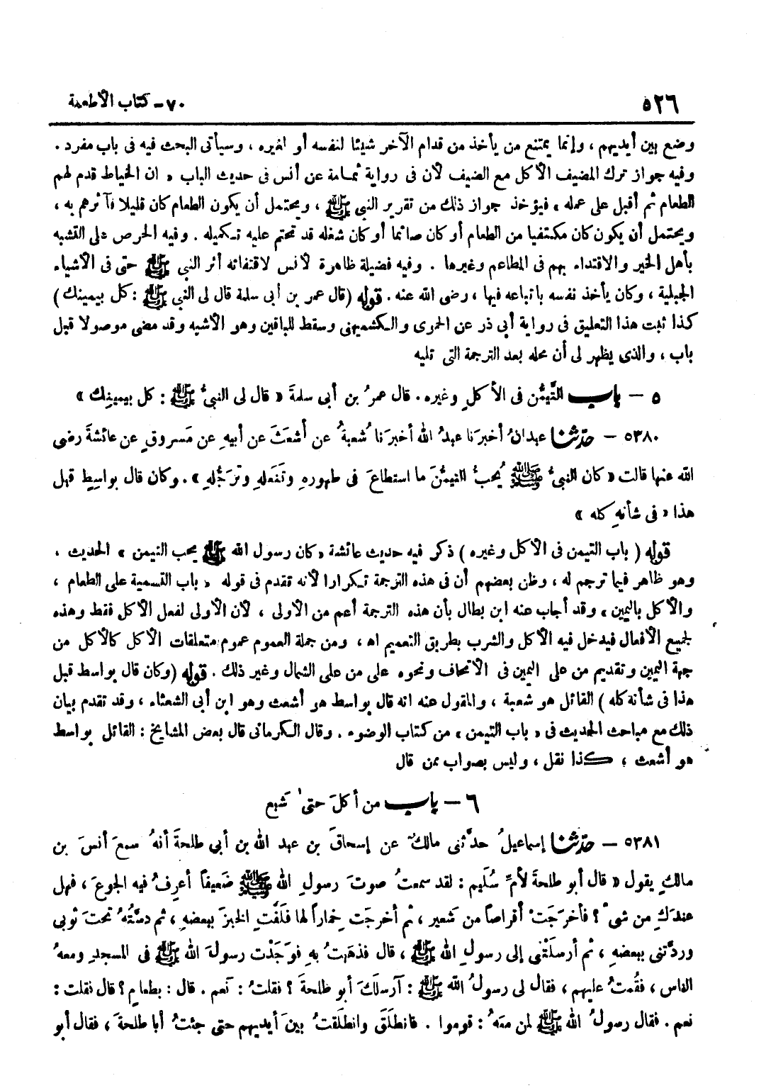 ذَكَرَ فِيهِ حَدِيثِ عَائِشَةَ كَانَ رَسُولُ اللَّهِ صَلَّى اللَّهُ عَلَيْهِ وَسَلَّمَ يُحِبُّ التَّيَمُّنَ الْحَدِيثَ وَهُوَ ظَاهِرٌ فِيمَا تَرْجَمَ لَهُ وَظَنَّ بَعْضُهُمْ أَنَّ فِي هَذِهِ التَّرْجَمَةِ تَكْرَارًا لِأَنَّهُ تَقَدَّمَ فِي قَوْلِهِ بَابُ التَّسْمِيَةِ عَلَى الطَّعَامِ وَالْأَكْلِ بِالْيَمِينِ وَقَدْ أجَاب عَنهُ بن بَطَّالٍ بِأَنَّ هَذِهِ التَّرْجَمَةَ أَعَمُّ مِنَ الْأُولَى لِأَنَّ الْأُولَى لِفِعْلِ الْأَكْلِ فَقَطْ وَهَذِهِ لِجَمِيعِ الْأَفْعَالِ فَيَدْخُلُ فِيهِ الْأَكْلُ وَالشُّرْبُ بِطَرِيقِ التَّعْمِيمِ اه وَمِنْ جُمْلَةِ الْعُمُومِ عُمُومُ مُتَعَلِّقَاتِ الْأَكْلِ كَالْأَكْلِ مِنْ جِهَةِ الْيَمِينِ وَتَقْدِيمِ مَنْ عَلَى الْيَمِينِ فِي الْإِتْحَافِ وَنَحْوِهِ عَلَى مَنْ عَلَى الشِّمَالِ وَغَيْرِ ذَلِكَ