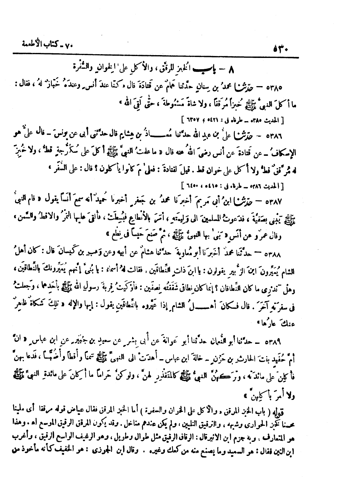أَمَّا الْخُبْزُ الْمُرَقَّقُ فَقَالَ عِيَاضٌ قَوْلُهُ مُرَقَّقًا أَيْ مُلَيَّنًا مُحَسَّنًا كَخُبْزِ الْحَوَارِيِّ وَشَبَهِهِ وَالتَّرْقِيقُ التَّلْيِينُ وَلَمْ يَكُنْ عِنْدَهُمْ مَنَاخِلُ وَقَدْ يَكُونُ الْمُرَقَّقُ الرَّقِيقَ الْمُوَسَّعَ اه وَهَذَا هُوَ الْمُتَعَارف وَبِه جزم بن الْأَثِيرِ قَالَ الرِّقَاقُ الرَّقِيقُ مِثْلُ طِوَالٍ وَطَوِيلٍ وَهُوَ الرَّغِيف الْوَاسِع الرَّقِيق وَأغْرب بن التِّينِ فَقَالَ هُوَ السَّمِيدُ وَمَا يُصْنَعُ مِنْهُ من كعك وَغَيره وَقَالَ بن الْجَوْزِيِّ هُوَ الْخَفِيفُ كَأَنَّهُ مَأْخُوذٌ مِنَ