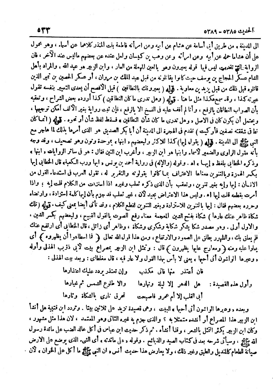 إِلَى الْمَدِينَةِ مِنْ طَرِيقِ أَبِي أُسَامَةَ عَنْ هِشَامٍ عَنْ أَبِيهِ وَعَنِ امْرَأَتِهِ فَاطِمَةَ بِنْتِ الْمُنْذِرِ كِلَاهُمَا عَنْ أَسْمَاءَ وَهُوَ مَحْمُولٌ عَلَى أَنَّ هِشَامًا حَمَلَهُ عَنْ أَبِيهِ وَعَنِ امْرَأَتِهِ وَعَنْ وَهْبِ بْنِ كَيْسَانَ وَلَعَلَّ عِنْدَهُ عَنْ بَعْضِهِمْ مَا لَيْسَ عِنْدَ الْآخَرِ فَإِنَّ الرِّوَايَةَ الَّتِي تَقَدَّمَتْ لَيْسَ فِيهَا قَوْلُهُ يُعَيِّرُونَ وَهُوَ بِالْعينِ الْمُهْملَة من الْعَار وبن الزُّبَيْرِ هُوَ عَبْدُ اللَّهِ وَالْمُرَادُ بِأَهْلِ الشَّامِ عَسْكَرُ الْحَجَّاجِ بْنِ يُوسُفَ حَيْثُ كَانُوا يُقَاتِلُونَهُ مِنْ قِبَلِ عَبْدِ الْمَلِكِ بْنِ مَرْوَانَ أَوْ عَسْكَرُ الْحُصَيْنِ بْنِ نُمَيْرٍ الَّذِينَ قَاتَلُوهُ قَبْلَ ذَلِكَ مِنْ قِبَلِ يَزِيدَ بْنِ مُعَاوِيَةَ قَوْلُهُ يُعَيِّرُونَكَ بِالنِّطَاقَيْنِ قِيلَ الْأَفْصَحُ أَنْ يُعَدَّى التَّعْيِيرُ بِنَفْسِهِ تَقُولُ عَيَّرْتُهُ كَذَا وَقَدْ سُمِعَ هَكَذَا مِثْلُ مَا هُنَا قَوْلُهُ وَهَلْ تَدْرِي مَا كَانَ النِّطَاقَيْنِ كَذَا أَوْرَدَهُ بَعْضُ الشُّرَّاحِ وَتَعَقَّبَهُ بِأَنَّ الصَّوَابَ النِّطَاقَانِ بِالرَّفْعِ وَأَنَا لَمْ أَقِفْ عَلَيْهِ فِي النُّسَخِ إِلَّا بِالرَّفْعِ فَإِنْ ثَبَتَ رِوَايَةً بِغَيْرِ الْأَلِفِ أَمْكَنَ تَوْجِيهُهَا وَيُحْتَمَلُ أَنْ يَكُونَ كَانَ فِي الْأَصْلِ وَهَلْ تَدْرِي مَا كَانَ شَأْنُ النِّطَاقَيْنِ فَسَقَطَ لَفْظُ شَأْنٍ أَوْ نَحْوُهُ قَوْلُهُ إِنَّمَا كَانَ نِطَاقِي شَقَقْتُهُ نِصْفَيْنِ فَأَوْكَيْتُ تَقَدَّمَ فِي الْهِجْرَةِ إِلَى الْمَدِينَةِ أَنَّ أَبَا بَكْرٍ الصِّدِّيقَ هُوَ الَّذِي أَمَرَهَا بِذَلِكَ لَمَّا هَاجَرَ مَعَ النَّبِيُّ صَلَّى اللَّهُ عَلَيْهِ وَسَلَّمَ إِلَى الْمَدِينَةِ قَوْلُهُ يَقُولُ إِيهًا كَذَا لِلْأَكْثَرِ وَلِبَعْضِهِمْ ابْنُهَا بِمُوَحَّدَةٍ وَنُونٍ وَهُوَ تَصْحِيفٌ وَقَدْ وُجِّهَ بِأَنَّهُ مَقُولُ الرَّاوِي وَالضَّمِيرُ لِأَسْمَاءَ وَابْنهَا هُوَ بن الزبير وَأغْرب بن التِّينِ فَقَالَ هُوَ فِي سَائِرِ الرِّوَايَاتِ ابْنُهَا وَذَكَرَهُ الْخَطَّابِيُّ بِلَفْظِ إِيهًا اه وَقَوْلُهُ وَالْإِلَهُ فِي رِوَايَةِ أَحْمَدَ بْنِ يُونُسَ إِيهًا وَرَبِّ الْكَعْبَةِ قَالَ الْخَطَّابِيُّ إِيهًا بِكَسْرِ الْهَمْزَةِ وَبِالتَّنْوِينِ مَعْنَاهَا الِاعْتِرَافُ بِمَا كَانُوا يَقُولُونَهُ وَالتَّقْرِيرُ لَهُ تَقُولُ الْعَرَبُ فِي اسْتِدْعَاءِ الْقَوْلِ مِنَ الْإِنْسَانِ إِيهًا وَإِيهْ بِغَيْرِ تَنْوِينٍ وَتُعُقِّبَ بِأَنَّ الَّذِي ذَكَرَهُ ثَعْلَبٌ وَغَيْرُهُ إِذَا اسْتَزَدْتَ مِنَ الْكَلَامِ قُلْتَ إِيهْ وَإِذَا أَمَرْتَ بِقَطْعِهِ قُلْتَ إِيهًا اه وَلَيْسَ هَذَا الِاعْتِرَاضُ بِجَيِّدٍ لِأَنَّ غَيْرَ ثَعْلَبٍ قَدْ جَزَمَ بِأَنَّ إِيهًا كَلِمَةُ اسْتِزَادَةٍ وَارْتَضَاهُ وَحَرَّرَهُ بَعْضُهُمْ فَقَالَ إِيهًا بِالتَّنْوِينِ لِلِاسْتِزَادَةِ وَبِغَيْرِ التَّنْوِينِ لِقَطْعِ الْكَلَامِ وَقَدْ تَأْتِي أَيْضًا بِمَعْنَى كَيْفَ قَوْلُهُ تِلْكَ شَكَاةٌ ظَاهِرٌ عَنْكَ عَارُهَا شَكَاةٌ بِفَتْحِ الشِّينِ الْمُعْجَمَةِ مَعْنَاهُ رَفْعُ الصَّوْتِ بِالْقَوْلِ الْقَبِيحِ وَلِبَعْضِهِمْ بِكَسْرِ الشِّينِ وَالْأَوَّلُ أَوْلَى وَهُوَ مَصْدَرُ شَكَا يَشْكُو شِكَايَةً وَشَكْوَى وَشَكَاةً وَظَاهِرٌ أَيْ زَائِلٌ قَالَ الْخَطَّابِيُّ أَيِ ارْتَفَعَ عَنْكَ فَلَمْ يَعْلَقْ بِكَ وَالظُّهُورُ يُطْلَقُ على الصمود وَالِارْتِفَاعِ وَمِنْ هَذَا قَوْلُ اللَّهِ تَعَالَى فَمَا اسطاعوا أَن يظهروه أَي يعلوا عَلَيْهِ وَمِنْه ومعارج عَلَيْهَا يظهرون قَالَ وتمثل بن الزُّبَيْرِ بِمِصْرَاعِ بَيْتٍ لِأَبِي ذُؤَيْبٍ الْهُذَلِيِّ و