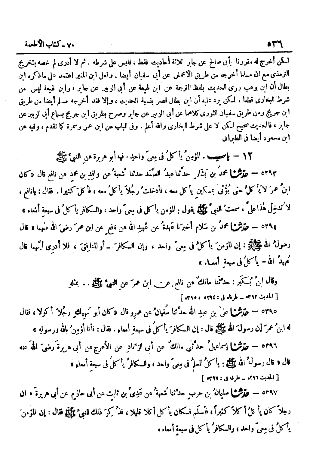 لَكِنْ أَخْرَجَ لَهُ مَقْرُونًا بِأَبِي صَالِحٍ عَنْ جَابِرٍ ثَلَاثَةَ أَحَادِيثَ فَقَطْ فَلَيْسَ عَلَى شَرْطِهِ ثُمَّ لَا أَدْرِي لِمَ خَصَّهُ بِتَخْرِيجِ التِّرْمِذِيِّ مَعَ أَنَّ مُسْلِمًا أَخْرَجَهُ مِنْ طَرِيقِ الْأَعْمَشِ عَن أبي سُفْيَان أَيْضا وَلَعَلَّ بن الْمُنِير اعْتمد على مَا ذكره بن بطال أَن بن وهب روى الحَدِيث بِلَفْظ التَّرْجَمَة عَن بن لَهِيعَة عَن أبي الزبير عَن جَابر وبن لَهِيعَةَ لَيْسَ مِنْ شَرْطِ الْبُخَارِيِّ قَطْعًا لَكِنْ يرد عَلَيْهِ أَن بن بَطَّالٍ قَصَّرَ بِنَسَبِهِ الْحَدِيثِ وَإِلَّا فَقَدْ أَخْرَجَهُ مُسلم أَيْضا من طَرِيق بن جُرَيْجٍ وَمِنْ طَرِيقِ سُفْيَانَ الثَّوْرِيِّ كِلَاهُمَا عَنْ أبي الزبير عَن جَابر وَصرح بطرِيق بن جُرَيْجٍ بِسَمَاعِ أَبِي الزُّبَيْرِ عَنْ جَابِرٍ فَالْحَدِيثُ صَحِيحٌ لَكِنْ لَا عَلَى شَرْطِ الْبُخَارِيِّ وَاللَّهُ أعلم وَفِي الْبَاب عَن بن عمر وَسمرَة كَمَا تقدم وَفِيه عَن بن مَسْعُود أَيْضا فِي الطَّبَرَانِيّ