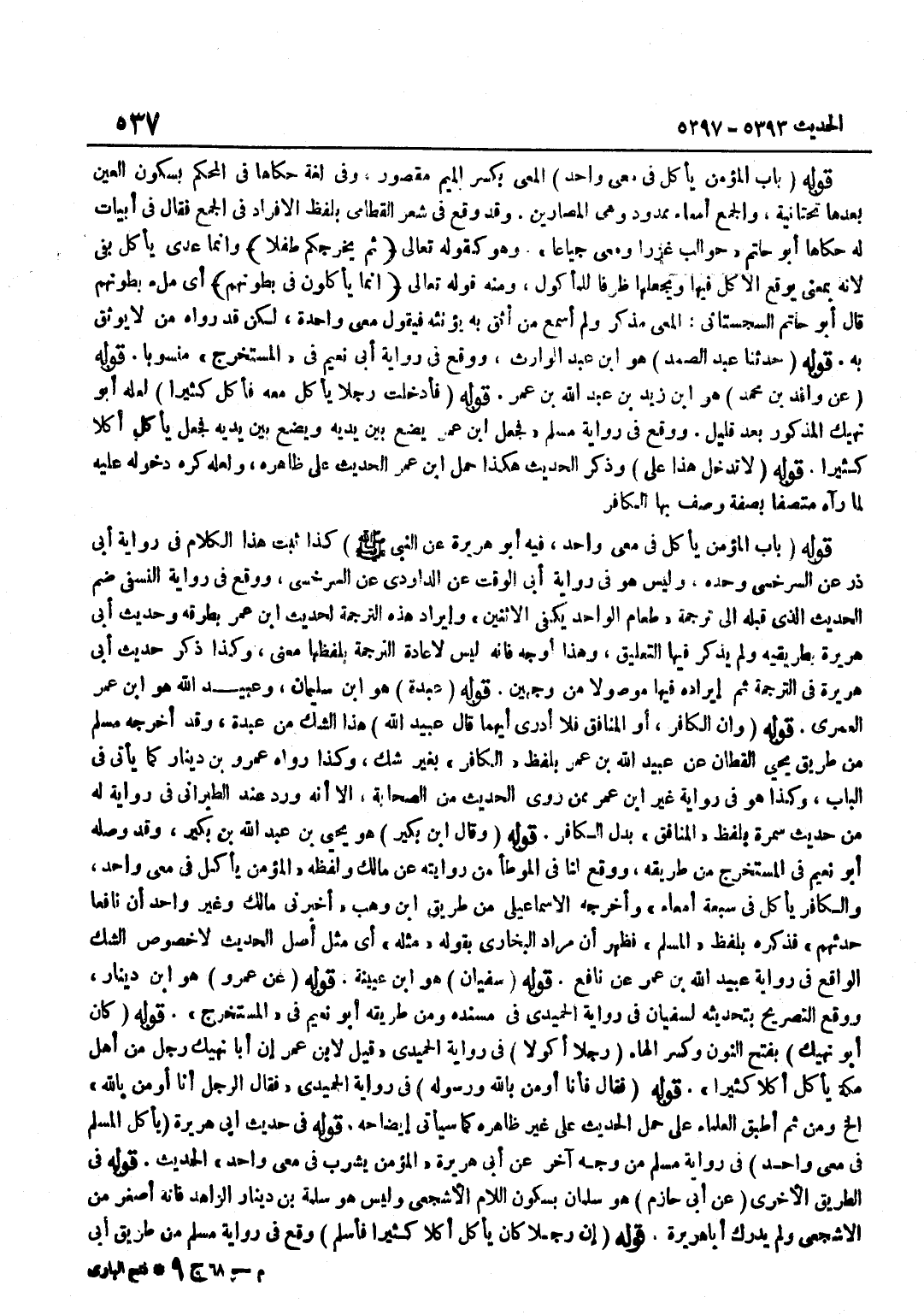 [5393] قَوْلُهُ حَدَّثَنَا عَبْدُ الصَّمد هُوَ بن عَبْدِ الْوَارِثِ وَوَقَعَ فِي رِوَايَةِ أَبِي نُعَيْمٍ فِي الْمُسْتَخْرَجِ مَنْسُوبًا قَوْلُهُ عَنْ وَاقِدِ بْنِ مُحَمَّد هُوَ بْنَ زَيْدِ بْنِ عَبْدِ اللَّهِ بْنِ عُمَرَ قَوْلُهُ فَأَدْخَلْتُ رَجُلًا يَأْكُلُ مَعَهُ فَأَكَلَ كَثِيرًا لَعَلَّهُ أَبُو نَهِيكٍ الْمَذْكُورُ بَعْدَ قَلِيلٍ وَوَقَعَ فِي رِوَايَة مُسلم فَجعل بن عُمَرَ يَضَعُ بَيْنَ يَدَيْهِ وَيَضَعُ بَيْنَ يَدَيْهِ فَجَعَلَ يَأْكُلُ أَكْلًا كَثِيرًا قَوْلُهُ لَا تُدْخِلُ هَذَا عَليّ وَذكر الحَدِيث هَكَذَا حمل بن عُمَرَ الْحَدِيثَ عَلَى ظَاهِرِهِ وَلَعَلَّهُ كَرِهَ دُخُولَهُ عَلَيْهِ لِمَا رَآهُ مُتَّصِفًا بِصِفَةٍ وُصِفَ بِهَا الْكَافِرُ قَوْلُهُ بَابُ الْمُؤْمِنِ يَأْكُلُ فِي مِعًى وَاحِد فِيهِ أَبُو هُرَيْرَةَ عَنْ النَّبِيِّ صَلَّى اللَّهُ عَلَيْهِ وَسَلَّمَ كَذَا ثَبَتَ هَذَا الْكَلَامُ فِي رِوَايَةِ أَبِي ذَرٍّ عَنِ السَّرَخْسِيِّ وَحْدَهُ وَلَيْسَ هُوَ فِي رِوَايَةِ أَبِي الْوَقْتِ عَنِ الدَّاوُدِيِّ عَنِ السَّرَخْسِيِّ وَوَقَعَ فِي رِوَايَةِ النَّسَفِيِّ ضَمُّ الْحَدِيثِ الَّذِي قَبْلَهُ إِلَى تَرْجَمَةِ طَعَامُ الْوَاحِدِ يَكْفِي الِاثْنَيْنِ وَإِيرَادُ هَذِهِ التَّرْجَمَةِ لِحَدِيثِ بن عُمَرَ بِطُرُقِهِ وَحَدِيثِ أَبِي هُرَيْرَةَ بِطَرِيقَيْهِ وَلَمْ يَذْكُرْ فِيهَا التَّعْلِيقَ وَهَذَا أَوْجَهُ فَإِنَّهُ لَيْسَ لِإِعَادَةِ التَّرْجَمَةِ بِلَفْظِهَا مَعْنًى وَكَذَا ذَكَرَ حَدِيثَ أَبِي هُرَيْرَةَ فِي التَّرْجَمَةِ ثُمَّ إِيرَادَهُ فِيهَا مَوْصُولا من وَجْهَيْن