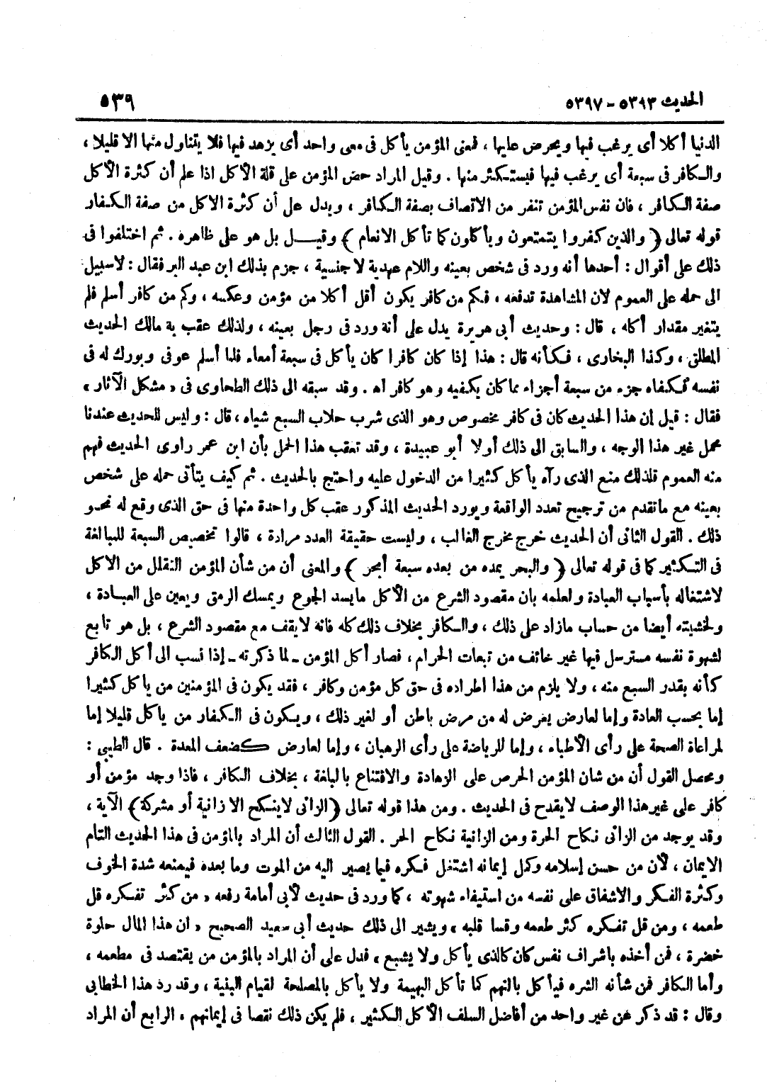 الدُّنْيَا أَكْلًا أَيْ يَرْغَبُ فِيهَا وَيَحْرِصُ عَلَيْهَا فَمَعْنَى الْمُؤْمِنُ يَأْكُلُ فِي مِعًى وَاحِدٍ أَيْ يَزْهَدُ فِيهَا فَلَا يَتَنَاوَلُ مِنْهَا إِلَّا قَلِيلًا وَالْكَافِرُ فِي سَبْعَةٍ أَيْ يَرْغَبُ فِيهَا فَيَسْتَكْثِرُ مِنْهَا وَقِيلَ الْمُرَادُ حَضُّ الْمُؤْمِنِ عَلَى قِلَّةِ الْأَكْلِ إِذَا عُلِمَ أَنَّ كَثْرَةَ الْأَكْلِ صِفَةُ الْكَافِرِ فَإِنَّ نَفْسَ الْمُؤْمِنِ تَنْفِرُ مِنَ الِاتِّصَافِ بِصِفَةِ الْكَافِرِ وَيَدُلُّ عَلَى أَنَّ كَثْرَةَ الْأَكْلِ مِنْ صِفَةِ الْكُفَّارِ قَوْلُهُ تَعَالَى وَالَّذِينَ كَفَرُوا يتمتعون ويأكلون كَمَا تَأْكُل الْأَنْعَام وَقِيلَ بَلْ هُوَ عَلَى ظَاهِرِهِ ثُمَّ اخْتَلَفُوا فِي ذَلِكَ عَلَى أَقْوَالٍ أَحَدُهَا أَنَّهُ وَرَدَ فِي شَخْصٍ بِعَيْنِهِ وَاللَّامُ عَهْدِيَّةٌ لَا جِنْسِيَّةٌ جزم بذلك بن عَبْدِ الْبَرِّ فَقَالَ لَا سَبِيلَ إِلَى حَمْلِهِ عَلَى الْعُمُومِ لِأَنَّ الْمُشَاهَدَةَ تَدْفَعُهُ فَكَمْ مِنْ كَافِرٍ يَكُونُ أَقَلَّ أَكْلًا مِنْ مُؤْمِنٍ وَعَكْسُهُ وَكَمْ مِنْ كَافِرٍ أَسْلَمَ فَلَمْ يَتَغَيَّرْ مِقْدَارُ أَكْلِهِ قَالَ وَحَدِيثُ أَبِي هُرَيْرَةَ يَدُلُّ عَلَى أَنَّهُ وَرَدَ فِي رَجُلٍ بِعَيْنِهِ وَلِذَلِكَ عَقَّبَ بِهِ مَالِكٌ الْحَدِيثَ الْمُطْلَقَ وَكَذَا الْبُخَارِيُّ فَكَأَنَّهُ قَالَ هَذَا إِذَا كَانَ كَافِرًا كَانَ يَأْكُلُ فِي سَبْعَةِ أَمْعَاءٍ فَلَمَّا أَسْلَمَ عُوفِيَ وَبُورِكَ لَهُ فِي نَفْسِهِ فَكَفَاهُ جُزْءٌ مِنْ سَبْعَةِ أَجْزَاءٍ مِمَّا كَانَ يَكْفِيهِ وَهُوَ كَافِرٌ اه وَقَدْ سَبَقَهُ إِلَى ذَلِكَ الطَّحَاوِيُّ فِي مُشْكِلِ الْآثَارِ فَقَالَ قِيلَ إِنَّ هَذَا الْحَدِيثَ كَانَ فِي كَافِرٍ مَخْصُوصٍ وَهُوَ الَّذِي شَرِبَ حِلَابَ السَّبْعِ شِيَاهٍ قَالَ وَلَيْسَ لِلْحَدِيثِ عِنْدَنَا مَحْمَلٌ غَيْرُ هَذَا الْوَجْهِ وَالسَّابِقُ إِلَى ذَلِكَ أَوَّلًا أَبُو عُبَيْدَةَ وَقَدْ تُعُقِّبَ هَذَا الْحَمْلُ بِأَنَّ بن عُمَرَ رَاوِيَ الْحَدِيثِ فَهِمَ مِنْهُ الْعُمُومَ فَلِذَلِكَ مَنَعَ الَّذِي رَآهُ يَأْكُلُ كَثِيرًا مِنَ الدُّخُولِ عَلَيْهِ وَاحْتَجَّ بِالْحَدِيثِ ثُمَّ كَيْفَ يَتَأَتَّى حَمْلُهُ عَلَى شَخْصٍ بِعَيْنِهِ مَعَ مَا تَقَدَّمَ مِنْ تَرْجِيح تعدد الْوَاقِعَةِ وَيُورِدُ الْحَدِيثَ الْمَذْكُورَ عَقِبَ كُلِّ وَاحِدَةٍ مِنْهَا فِي حَقِّ الَّذِي وَقَعَ لَهُ نَحْوُ ذَلِكَ الْقَوْلُ الثَّانِي أَنَّ الْحَدِيثَ خَرَجَ مَخْرَجَ الْغَالِبِ وَلَيْسَتْ حَقِيقَةُ الْعَدَدِ مُرَادَةً قَالُوا تَخْصِيصُ السَّبْعَة للْمُبَالَغَة فِي التكثير كَمَا فِي قَوْلُهُ تَعَالَى وَالْبَحْرُ يَمُدُّهُ مِنْ بَعْدِهِ سَبْعَةُ أبحر وَالْمَعْنَى أَنَّ مِنْ شَأْنِ الْمُؤْمِنِ التَّقَلُّلَ مِنَ الْأَكْلِ لِاشْتِغَالِهِ بِأَسْبَابِ الْعِبَادَةِ وَلِعِلْمِهِ بِأَنَّ مَقْصُودَ الشَّرْعِ مِنَ الْأَكْلِ مَا يَسُدُّ الْجُوعَ وَيُمْسِكُ الرَّمَقَ وَيُعِينُ عَلَى الْعِبَادَةِ وَلِخَشْيَتِهِ أَيْضًا مِنْ حِسَابِ مَا زَادَ عَلَى ذَلِكَ وَالْكَافِرُ بِخِلَافِ ذَلِكَ كُلِّهِ فَإِنَّهُ لَا يَقِفُ مَعَ مَقْصُودِ الشَّرْعِ بَلْ هُوَ تَابِعٌ لِشَهْوَةِ نَفْسِهِ مُسْتَرْسِلٌ فِيهَا غَيْرُ خَائِفٍ مِنْ تَبَعَاتِ الْحَرَامِ فَصَارَ أَكْلُ الْمُؤْمِنِ لِمَا ذَكَرْتُهُ إِذَا نُسِبَ إِلَى أَكْلِ الْكَافِرِ كَأَنَّهُ بِقَدْرِ السُّبْعِ مِنْهُ وَلَا يَلْزَمُ مِنْ هَذَا اطِّرَادُهُ فِي حَقِّ كُلِّ مُؤْمِنٍ وَكَافِرٍ فَقَدْ يَكُونُ فِي الْمُؤْمِنِينَ مَنْ يَأْكُلُ كَثِيرًا إِمَّا بِحَسَبِ الْعَادَةِ وَإِمَّا لِعَارِضٍ يَعْرِضُ لَهُ مِنْ مَرَضٍ بَاطِنٍ أَوْ لِغَيْرِ ذَلِكَ وَيَكُونُ فِي الْكُفَّارِ مَنْ يَأْكُلُ قَ