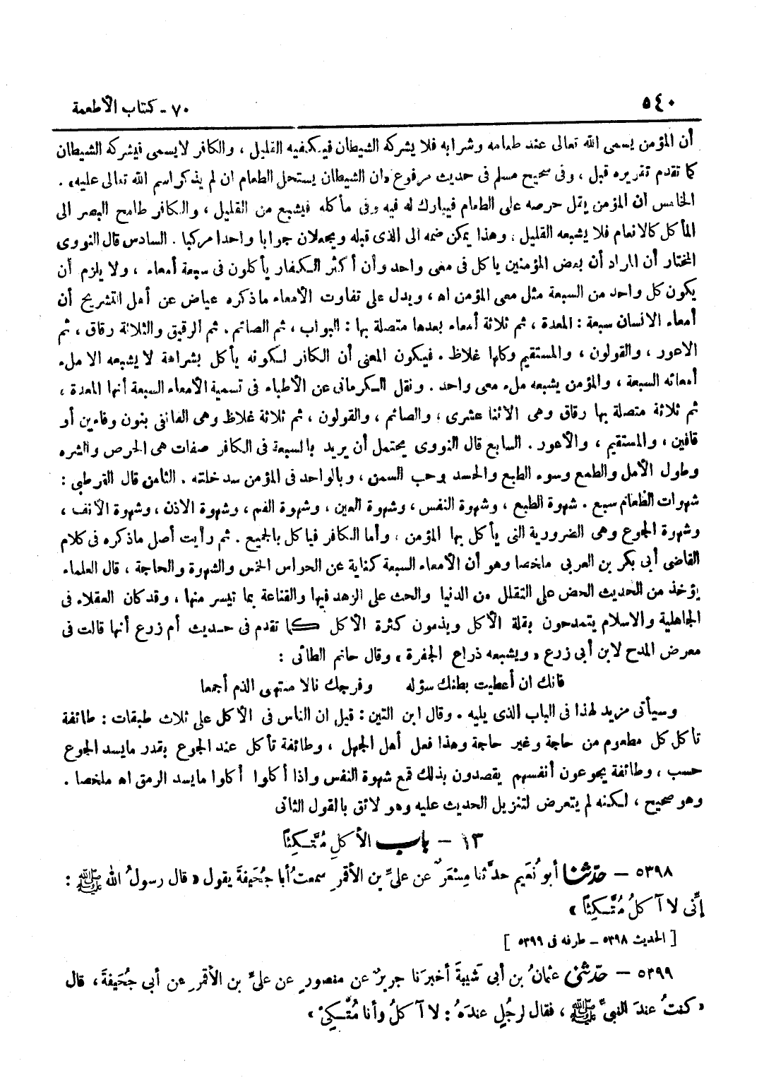 أَنَّ الْمُؤْمِنَ يُسَمِّي اللَّهَ تَعَالَى عِنْدَ طَعَامِهِ وَشَرَابِهِ فَلَا يُشْرِكُهُ الشَّيْطَانُ فَيَكْفِيهِ الْقَلِيلُ وَالْكَافِرُ لَا يُسَمِّي فَيُشْرِكُهُ الشَّيْطَانُ كَمَا تَقَدَّمَ تَقْرِيرُهُ قَبْلُ وَفِي صَحِيحِ مُسْلِمٍ فِي حَدِيثٍ مَرْفُوعٍ إِنَّ الشَّيْطَانَ يَسْتَحِلُّ الطَّعَامَ إِنْ لَمْ يُذْكَرِ اسْمُ اللَّهِ تَعَالَى عَلَيْهِ الْخَامِسُ أَنَّ الْمُؤْمِنَ يَقِلُّ حِرْصُهُ عَلَى الطَّعَامِ فَيُبَارَكُ لَهُ فِيهِ وَفِي مَأْكَلِهِ فَيَشْبَعُ مِنَ الْقَلِيلِ وَالْكَافِرُ طَامِحُ الْبَصَرِ إِلَى الْمَأْكَلِ كَالْأَنْعَامِ فَلَا يَشْبَعُهُ الْقَلِيلُ وَهَذَا يُمْكِنُ ضَمُّهُ إِلَى الَّذِي قَبْلَهُ وَيُجْعَلَانِ جَوَابًا وَاحِدًا مَرْكَبًا السَّادِسُ قَالَ النَّوَوِيُّ الْمُخْتَارُ أَنَّ الْمُرَادَ أَنَّ بَعْضَ الْمُؤْمِنِينَ يَأْكُلُ فِي مِعًى وَاحِدٍ وَأَنَّ أَكْثَرَ الْكُفَّارِ يَأْكُلُونَ فِي سَبْعَةِ أَمْعَاءٍ وَلَا يَلْزَمُ أَنْ يَكُونَ كُلُّ وَاحِدٍ مِنَ السَّبْعَةِ مِثْلَ مِعَى الْمُؤْمِنِ اه وَيَدُلُّ عَلَى تَفَاوُتِ الْأَمْعَاءِ مَا ذَكَرَهُ عِيَاضٌ عَنْ أَهْلِ التَّشْرِيحِ أَنَّ أَمْعَاءَ الْإِنْسَانِ سَبْعَةٌ الْمَعِدَةُ ثُمَّ ثَلَاثَةُ أَمْعَاءٍ بَعْدَهَا مُتَّصِلَةٌ بِهَا الْبَوَّابُ ثُمَّ الصَّائِمُ ثُمَّ الرَّقِيقُ وَالثَّلَاثَةُ رِقَاقٌ ثُمَّ الْأَعْوَرُ وَالْقَوْلُونُ وَالْمُسْتَقِيمُ وَكُلُّهَا غِلَاظٌ فَيَكُونُ الْمَعْنَى أَنَّ الْكَافِرَ لِكَوْنِهِ يَأْكُلُ بِشَرَاهَةٍ لَا يُشْبِعُهُ إِلَّا مِلْءُ أَمْعَائِهِ السَّبْعَةِ وَالْمُؤْمِنُ يُشْبِعُهُ مِلْءُ مِعًى وَاحِدٍ وَنَقَلَ الْكِرْمَانِيُّ عَنِ الْأَطِبَّاءِ فِي تَسْمِيَةِ الْأَمْعَاءِ السَّبْعَةِ أَنَّهَا الْمَعِدَةُ ثُمَّ ثَلَاثَةٌ مُتَّصِلَةٌ بِهَا رِقَاقٌ وَهِيَ الِاثْنَا عَشْرِيُّ وَالصَّائِمُ وَالْقَوْلُونُ ثُمَّ ثَلَاثَةٌ غِلَاظٌ وَهِيَ الْفَانَفِيُّ بِنُونٍ وَفَاءَيْنِ أَوْ قَافَيْنِ وَالْمُسْتَقِيمُ وَالْأَعْوَرُ السَّابِعُ قَالَ النَّوَوِيُّ يَحْتَمِلُ أَنْ يُرِيدَ بِالسَّبْعَةِ فِي الْكَافِرِ صِفَاتٍ هِيَ الْحِرْصُ وَالشَّرَهُ وَطُولُ الْأَمَلِ وَالطَّمَعُ وَسُوءُ الطَّبْعِ وَالْحَسَدُ وَحُبُّ السِّمَنِ وَبِالْوَاحِدِ فِي الْمُؤْمِنِ سَدَّ خَلَّتِهِ الثَّامِنُ قَالَ الْقُرْطُبِيُّ شَهَوَاتُ الطَّعَامِ سَبْعٌ شَهْوَةُ الطَّبْعِ وَشَهْوَةُ النَّفْسِ وَشَهْوَةُ الْعَيْنِ وَشَهْوَةُ الْفَمِ وَشَهْوَةُ الْأُذُنِ وَشَهْوَةُ الْأَنْفِ وَشَهْوَةُ الْجُوعِ وَهِيَ الضَّرُورِيَّةُ الَّتِي يَأْكُلُ بِهَا الْمُؤْمِنُ وَأَمَّا الْكَافِرُ فَيَأْكُلُ بِالْجَمِيعِ ثُمَّ رَأَيْتُ أَصْلَ مَا ذَكَرَهُ فِي كَلَامِ الْقَاضِي أَبِي بَكْرِ بْنِ الْعَرَبِيِّ مُلَخَّصًا وَهُوَ أَنَّ الْأَمْعَاءَ السَّبْعَةَ كِنَايَةٌ عَنِ الْحَوَاسِّ الْخَمْسِ وَالشَّهْوَةِ وَالْحَاجَةِ قَالَ الْعُلَمَاءُ يُؤْخَذُ مِنَ الْحَدِيثِ الْحَضُّ عَلَى التَّقَلُّلِ مِنَ الدُّنْيَا وَالْحَثُّ عَلَى الزُّهْدِ فِيهَا وَالْقَنَاعَةُ بِمَا تَيَسَّرَ مِنْهَا وَقَدْ كَانَ الْعُقَلَاءُ فِي الْجَاهِلِيَّةِ وَالْإِسْلَامِ يَتَمَدَّحُونَ بِقِلَّةِ الْأَكْلِ وَيَذُمُّونَ كَثْرَةَ الْأَكْلِ كَمَا تَقَدَّمَ فِي حَدِيثِ أُمِّ زَرْعٍ أَنَّهَا قَالَتْ فِي مَعْرِضِ الْمَدْحِ لِابْنِ أَبِي زَرْعٍ وَيُشْبِعُهُ ذِرَاعُ الْجَفْرَةِ وَقَالَ حَاتِمٌ الطَّائِيُّ فَإِنَّكَ إِنْ أَعْطَيْتَ بَطْنَكَ سُؤْلَهُ وَفَرْجَكَ نَالَا مُنْتَهَى الذَّمِّ أَجْمَعَا وَسَيَأْتِي مَزِيدٌ لِهَذَا فِي الْبَابِ الَّذِي يَلِيهِ وَقَالَ بن التِّينِ قِيلَ إِنَّ النَّاسَ فِي الْأَكْلِ عَلَى ثَلَاثِ طَبَقَاتٍ طَائِفَ