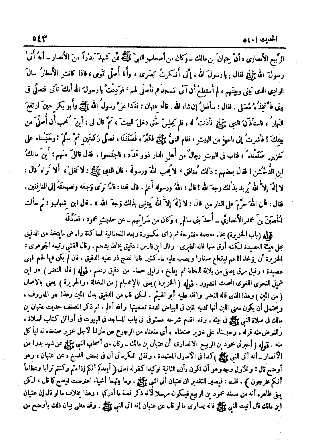 [5401] قَوْلُهُ وَحَبَسْنَاهُ عَلَى خَزِيرٍ صَنَعْنَاهُ أَيْ مَنَعْنَاهُ مِنَ الرُّجُوعِ عَنْ مَنْزِلِنَا لِأَجْلِ خَزِيرٍ صَنَعْنَاهُ لَهُ لِيَأْكُلَ مِنْهُ قَوْلُهُ أَخْبَرَنِي مَحْمُودِ بْنِ الرَّبِيعِ الْأَنْصَارِيِّ أَنَّ عِتْبَانَ بْنَ مَالِكٍ وَكَانَ مِنْ أَصْحَابِ النَّبِيِّ صَلَّى اللَّهُ عَلَيْهِ وَسَلَّمَ مِمَّنْ شَهِدَ بَدْرًا مِنَ الْأَنْصَارِ أَنَّهُ أَتَى النَّبِيَّ صَلَّى اللَّهُ عَلَيْهِ وَسَلَّمَ كَذَا فِي الْأُصُولِ الْمُعْتَمَدَةِ وَنَقَلَ الْكِرْمَانِيُّ أَنَّ فِي بَعْضِ النُّسَخِ عَنْ عِتْبَانَ وَهُوَ أَوْضَحُ قَالَ وَلِلْأَوَّلِ وَجْهٌ وَهُوَ أَنْ تَكُونَ أَنَّ الثَّانِيَةُ تَوْكِيدًا كَقَوْلِهِ تَعَالَى أَيَعِدُكُمْ أَنَّكُمْ إِذَا مِتُّمْ وكنتم تُرَابا وعظاما إِنَّكُم مخرجون قُلْتُ فَيَصِيرُ التَّقْدِيرُ أَنَّ عِتْبَانَ أَتَى النَّبِيَّ صَلَّى اللَّهُ عَلَيْهِ وَسَلَّمَ وَمَا بَيْنَهُمَا أَشْيَاءُ اعْتَرَضَتْ فَيَصِحُّ كَمَا قَالَ لَكِنْ يَبْقَى ظَاهِرُهُ أَنَّهُ مِنْ مُسْنَدِ مَحْمُودِ بْنِ الرَّبِيعِ فَيَكُونُ مُرْسَلًا لِأَنَّهُ ذَكَرَ قِصَّةً مَا أَدْرَكَهَا وَهَذَا بِخِلَافِ مَا لَوْ قَالَ إِنَّ عِتْبَانَ بْنَ مَالِكٍ قَالَ أَتَيْتُ النَّبِيَّ صَلَّى اللَّهُ عَلَيْهِ وَسَلَّمَ فَإِنَّهُ يُسَاوِي مَا لَوْ قَالَ عَنْ عِتْبَانَ أَنَّهُ أَتَى النَّبِيَّ صَلَّى اللَّهُ عَلَيْهِ وَسَلَّمَ وَقَدْ مَضَى بَيَانُ ذَلِكَ بِأَوْضَحَ مِنْ
