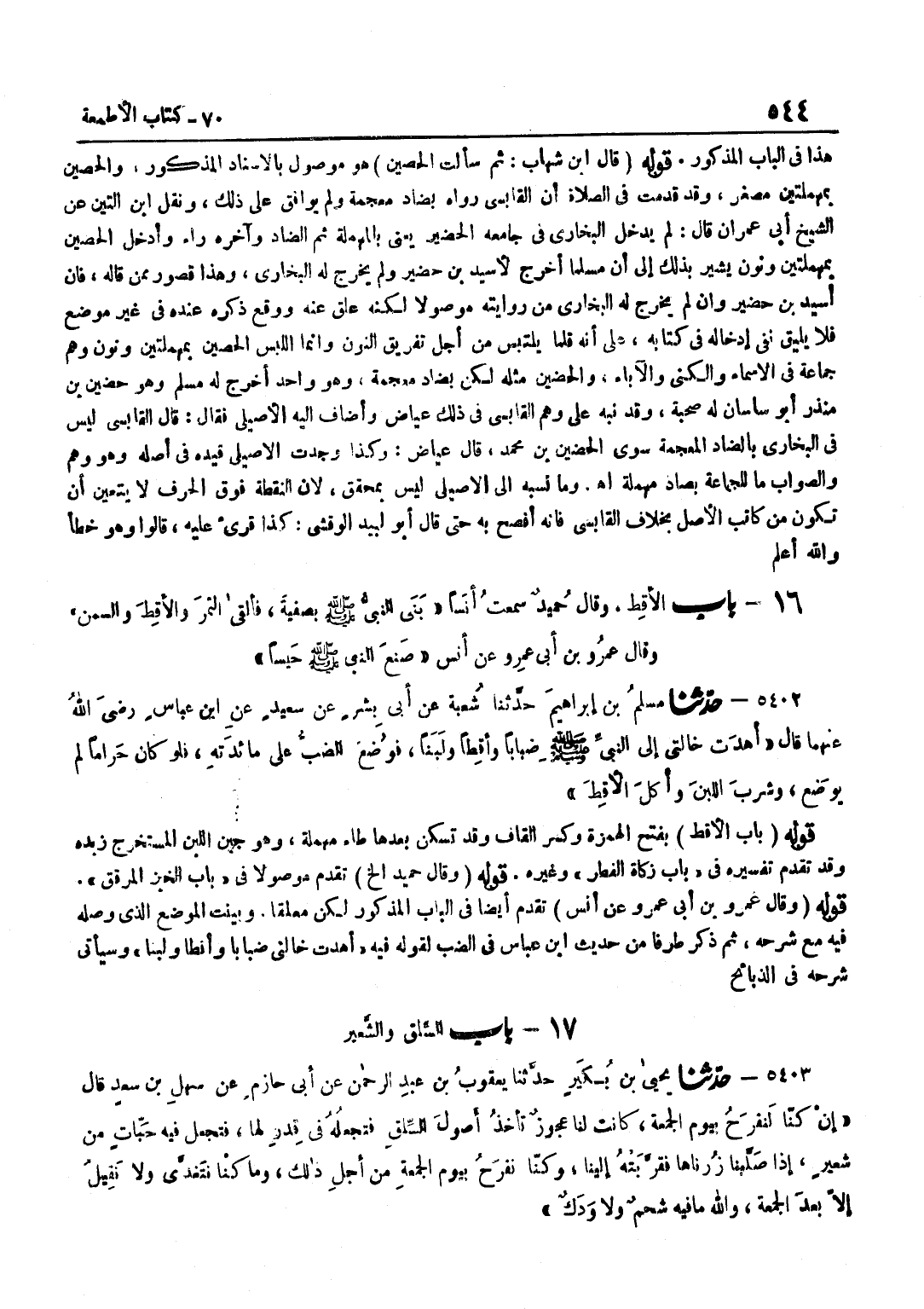 هَذَا فِي الْبَاب الْمَذْكُور قَوْله قَالَ بن شِهَابٍ ثُمَّ سَأَلْتُ الْحُصَيْنَ هُوَ مَوْصُولٌ بِالْإِسْنَادِ الْمَذْكُورِ وَالْحُصَيْنُ بِمُهْمَلَتَيْنِ مُصَغَّرٌ وَقَدْ قَدَّمْتُ فِي الصَّلَاةِ أَنَّ الْقَابِسِيَّ رَوَاهُ بِضَادٍ مُعْجَمَةٍ وَلَمْ يُوَافق على ذَلِك وَنقل بن التِّينِ عَنِ الشَّيْخِ أَبِي عِمْرَانَ قَالَ لَمْ يُدْخِلِ الْبُخَارِيُّ فِي جَامِعِهِ الْحُضَيْرَ يَعْنِي بِالْمُهْمَلَةِ ثُمَّ الضَّادِ وَآخِرَهُ رَاءٌ وَأَدْخَلَ الْحُصَيْنَ بِمُهْمَلَتَيْنِ وَنُونٍ يُشِيرُ بِذَلِكَ إِلَى أَنَّ مُسْلِمًا أَخْرَجَ لِأُسَيْدِ بْنِ حُضَيْرٍ وَلَمْ يُخْرِجْ لَهُ الْبُخَارِيُّ وَهَذَا قُصُورٌ مِمَّنْ قَالَهُ فَإِنَّ أُسَيْدَ بْنَ حُضَيْرٍ وَإِنْ لَمْ يُخْرِجْ لَهُ الْبُخَارِيُّ مِنْ رِوَايَتِهِ مَوْصُولًا لَكِنَّهُ عَلَّقَ عَنْهُ وَوَقَعَ ذِكْرَهُ عِنْدَهُ فِي غَيْرِ مَوْضِعٍ فَلَا يَلِيقُ نَفْيُ إِدْخَالِهِ فِي كِتَابِهِ عَلَى أَنَّهُ قَلَّمَا يُلْتَبَسُ مِنْ أَجْلِ تَفْرِيقِ النُّونِ وَإِنَّمَا اللَّبْسُ الْحُصَيْنُ بِمُهْمَلَتَيْنِ وَنُونٍ وَهْمُ جَمَاعَةٍ فِي الْأَسْمَاءِ وَالْكُنَى وَالْآبَاءِ وَالْحُضَيْنُ مِثْلُهُ لَكِنْ بِضَادٍ مُعْجَمَةٍ وَهُوَ وَاحِدٌ أَخْرَجَ لَهُ مُسْلِمٌ وَهُوَ حُضَيْنُ بْنُ مُنْذِرٍ أَبُو سَاسَانَ لَهُ صُحْبَةٌ وَقَدْ نَبَّهَ عَلَى وَهْمِ الْقَابِسِيِّ فِي ذَلِكَ عِيَاضٌ وَأَضَافَ إِلَيْهِ الْأَصِيلِيُّ فَقَالَ قَالَ الْقَابِسِيُّ لَيْسَ فِي الْبُخَارِيِّ بِالضَّادِ الْمُعْجَمَةِ سِوَى الْحُضَيْنِ بْنِ مُحَمَّدٍ قَالَ عِيَاضٌ وَكَذَا وَجَدْتُ الْأَصِيلِيَّ قَيَّدَهُ فِي أَصْلِهِ وَهُوَ وَهْمٌ وَالصَّوَابُ مَا لِلْجَمَاعَةِ بِصَادٍ مُهْمَلَةٍ اه وَمَا نَسَبَهُ إِلَى الْأَصِيلِيِّ لَيْسَ بِمُحَقَّقٍ لِأَنَّ النُّقْطَةَ فَوْقَ الْحَرْفِ لَا يَتَعَيَّنُ أَنْ تَكُونَ مِنْ كَاتِبِ الْأَصْلِ بِخِلَافِ الْقَابِسِيِّ فَإِنَّهُ أَفْصَحَ بِهِ حَتَّى قَالَ أَبُو لَبِيدٍ الْوَقْشِيُّ كَذَا قُرِئَ عَلَيْهِ قَالُوا وَهُوَ خَطَأٌ وَالله أعلم