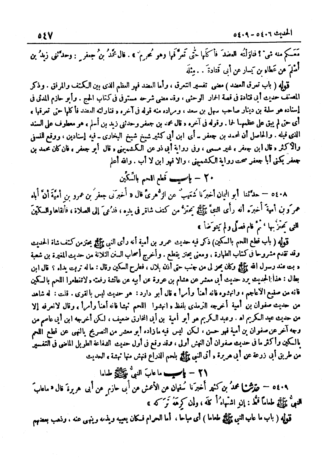 ذَكَرَ فِيهِ حَدِيث عَمْرو بن أُميَّة أَنَّهُ رَأَى النَّبِيَّ صَلَّى اللَّهُ عَلَيْهِ وَسَلَّمَ يَحْتَزُّ مِنْ كَتِفِ شَاةٍ الْحَدِيثَ وَقَدْ تَقَدَّمَ مَشْرُوحًا فِي كِتَابِ الطَّهَارَةِ وَمَعْنَى يَحْتَزُّ يَقْطَعُ وأَخْرَجَ أَصْحَابُ السُّنَنِ الثَّلَاثَةُ مِنْ حَدِيثِ الْمُغِيرَةِ بْنِ شُعْبَةَ بِتُّ عِنْدَ رَسُولِ اللَّهِ صَلَّى اللَّهُ عَلَيْهِ وَسَلَّمَ وَكَانَ يَحُزُّ لِي مِنْ جَنْبٍ حَتَّى أَذَّنَ بِلَالٌ فَطَرَحَ السِّكِّينَ وَقَالَ مَا لَهُ تَرِبَتْ يَدَاهُ قَالَ بن بَطَّالٍ هَذَا الْحَدِيثُ يَرُدَّ حَدِيثَ أَبِي مَعْشَرٍ عَنْ هِشَامِ بْنِ عُرْوَةَ عَنْ أَبِيهِ عَنْ عَائِشَةَ رَفَعَتْهُ لَا تَقْطَعُوا اللَّحْمَ بِالسِّكِّينِ فَإِنَّهُ مِنْ صَنِيعِ الْأَعَاجِمِ وَانْهَشُوهُ فَإِنَّهُ أَهْنَأُ وَأَمْرَأُ قَالَ أَبُو دَاوُد هُوَ حَدِيثٌ لَيْسَ بِالْقَوِيِ قُلْتُ لَهُ شَاهِدٌ مِنْ حَدِيثِ صَفْوَانَ بْنِ أُمَيَّةَ أَخْرَجَهُ التِّرْمِذِيُّ بِلَفْظِ انْهَشُوا اللَّحْمَ نَهْشًا فَإِنَّهُ أَهْنَأُ وَأَمْرَأُ وَقَالَ لَا نَعْرِفُهُ إِلَّا مِنْ حَدِيثِ عَبْدِ الْكَرِيمِ اه وَعَبْدُ الْكَرِيمِ هُوَ أَبُو أُمَيَّةَ بْنِ أبي الْمخَارِق ضَعِيف لَكِن أخرجه بن أَبِي عَاصِمٍ مِنْ وَجْهٍ آخَرَ عَنْ صَفْوَانَ بْنِ أُمَيَّةَ فَهُوَ حَسَنٌ لَكِنْ لَيْسَ فِيهِ مَا زَادَهُ أَبُو مَعْشَرٍ مِنَ التَّصْرِيحِ بِالنَّهْيِ عَنْ قَطْعِ اللَّحْمِ بِالسِّكِّينِ وَأَكْثَرُ مَا فِي حَدِيثِ صَفْوَانَ أَنَّ النَّهْشَ أَوْلَى وَقَدْ وَقَعَ فِي أَوَّلِ حَدِيثِ الشَّفَاعَةِ الطَّوِيلِ الْمَاضِي فِي التَّفْسِيرِ مِنْ طَرِيقِ أَبِي زُرْعَةَ عَنْ أَبِي هُرَيْرَةَ أَتَى النَّبِيَّ صَلَّى اللَّهُ عَلَيْهِ وَسَلَّمَ بِلَحْم الذِّرَاع فنهش مِنْهَا نهشة الحَدِيث قَوْلُهُ بَابُ مَا عَابَ النَّبِيُّ صَلَّى اللَّهُ عَلَيْهِ وَسَلَّمَ طَعَامًا أَيْ مُبَاحًا أَمَّا الْحَرَامُ فَكَانَ يَعِيبُهُ وَيَذُمُّهُ وَيَنْهَى عَنْهُ وَذَهَبَ بَعْضُهُمْ