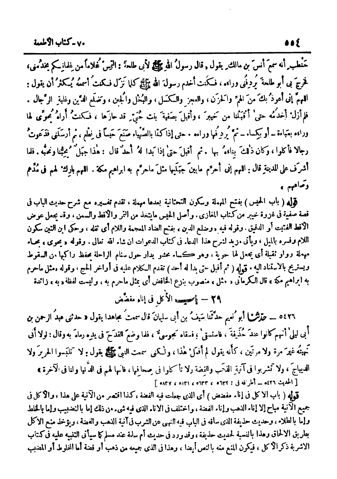 أَيِ الَّذِي جُعِلَتْ فِيهِ الْفِضَّةُ كَذَا اقْتَصَرَ مِنَ الْآنِيَّةِ عَلَى هَذَا وَالْأَكْلُ فِي جَمِيعِ الْآنِيَّةِ مُبَاحٌ إِلَّا إِنَاءَ الذَّهَبِ وَإِنَاءَ الْفِضَّةِ وَاخْتُلِفَ فِي الْإِنَاءِ الَّذِي فِيهِ شَيْءٌ مِنْ ذَلِكَ إِمَّا بِالتَّضْبِيبِ وَإِمَّا بِالْخَلْطِ وَإِمَّا بِالطِّلَاءِ وَحَدِيثُ حُذَيْفَةَ الَّذِي سَاقَهُ فِي الْبَابِ فِيهِ النَّهْيُ عَنِ الشُّرْبِ فِي آنِيَّةِ الذَّهَبِ وَالْفِضَّةِ وَيُؤْخَذُ مَنْعُ الْأَكْلِ بِطَرِيقِ الْإِلْحَاقِ وَهَذَا بِالنِّسْبَةِ لِحَدِيثِ حُذَيْفَةَ وَقَدْ وَرَدَ فِي حَدِيثِ أُمِّ سَلَمَةَ عِنْدَ مُسْلِمٍ كَمَا سَيَأْتِي التَّنْبِيهُ عَلَيْهِ فِي كِتَابِ الْأَشْرِبَةِ ذِكْرُ الْأَكْلِ فَيَكُونُ الْمَنْعُ مِنْهُ بِالنَّصِّ أَيْضًا وَهَذَا فِي الَّذِي جَمِيعُهُ مِنْ ذَهَبٍ أَوْ فِضَّةٍ أَمَّا الْمَخْلُوطُ أَوِ الْمُضَبَّبُ