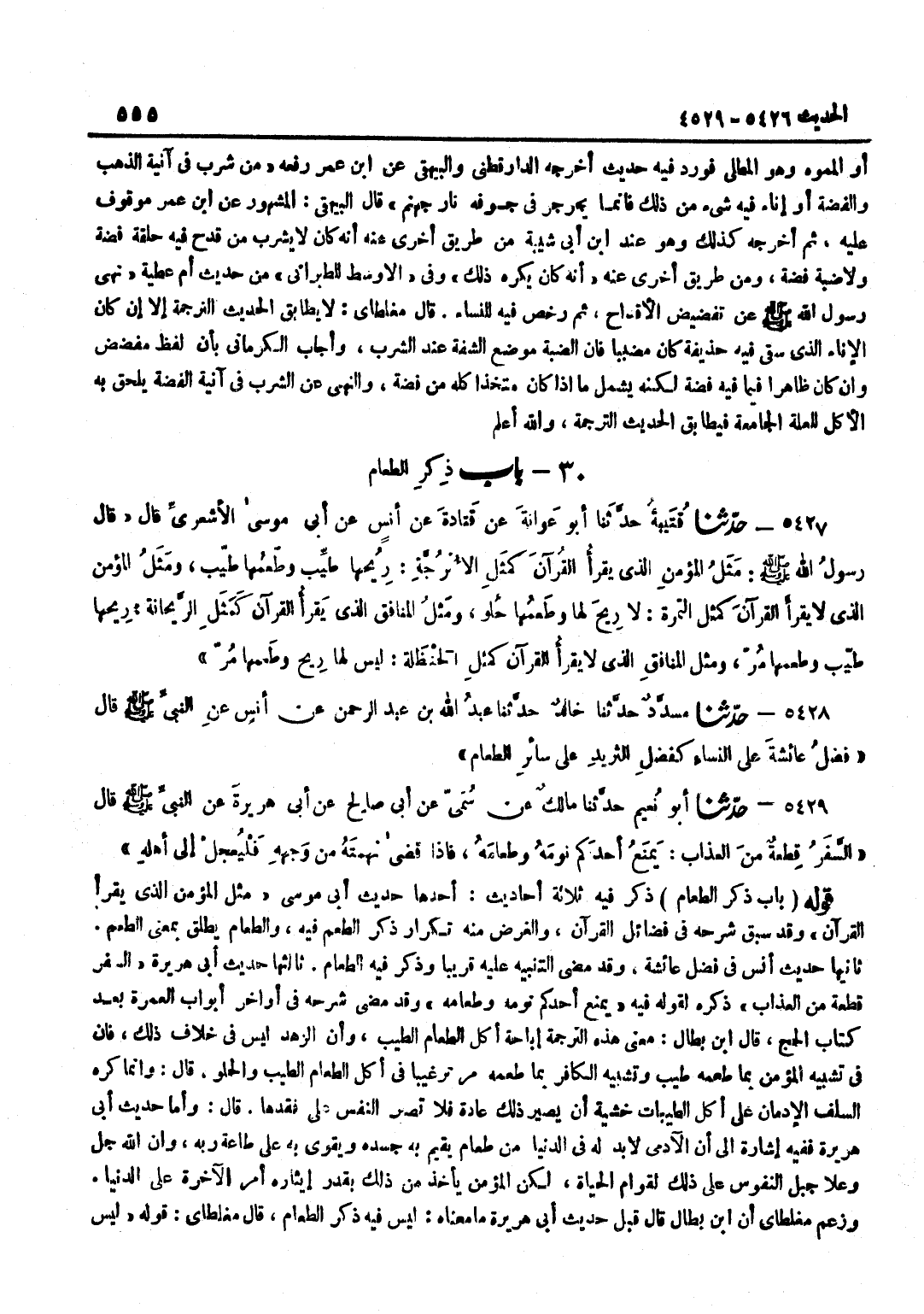 ذَكَرَ فِيهِ ثَلَاثَةَ أَحَادِيثَ أَحَدُهَا حَدِيثُ أَبِي مُوسَى مَثَلُ الْمُؤْمِنِ الَّذِي يَقْرَأُ الْقُرْآنَ وَقَدْ سَبَقَ شَرْحُهُ فِي فَضَائِلِ الْقُرْآنِ وَالْغَرَضُ مِنْهُ تَكْرَارُ ذِكْرِ الطَّعْمِ فِيهِ وَالطَّعَامُ يُطْلَقُ بِمَعْنَى الطَّعْمِ ثَانِيهَا حَدِيثُ أَنَسٍ فِي فَضْلِ عَائِشَةَ وَقَدْ مَضَى التَّنْبِيهُ عَلَيْهِ قَرِيبًا وَذُكِرَ فِيهِ الطَّعَامُ ثَالِثُهَا حَدِيثُ أَبِي هُرَيْرَةَ السَّفَرُ قِطْعَةٌ مِنَ الْعَذَابِ ذَكَرَهُ لِقَوْلِهِ فِيهِ يَمْنَعُ أَحَدَكُمْ نَوْمَهُ وَطَعَامَهُ وَقَدْ مَضَى شَرْحُهُ فِي أَوَاخِرِ أَبْوَابِ الْعُمْرَةِ بَعْدَ كتاب الْحَج قَالَ بن بَطَّالٍ مَعْنَى هَذِهِ التَّرْجَمَةِ إِبَاحَةُ أَكْلِ الطَّعَامِ الطَّيِّبِ وَأَنَّ الزُّهْدَ لَيْسَ فِي خِلَافِ ذَلِكَ فَإِن فِي تَشْبِيهَ الْمُؤْمِنِ بِمَا طَعْمُهُ طَيِّبٌ وَتَشْبِيهَ الْكَافِرِ بِمَا طَعْمُهُ مُرٌّ تَرْغِيبًا فِي أَكْلِ الطَّعَامِ الطَّيِّبِ وَالْحُلْوِ قَالَ وَإِنَّمَا كَرِهَ السَّلَفُ الْإِدْمَانَ عَلَى أَكْلِ الطَّيِّبَاتِ خَشْيَةَ أَنْ يَصِيرَ ذَلِكَ عَادَةً فَلَا تَصْبِرُ النَّفْسُ عَلَى فَقْدِهَا قَالَ وَأَمَّا حَدِيثُ أَبِي هُرَيْرَةَ فَفِيهِ إِشَارَةٌ إِلَى أَنَّ الْآدَمِيَّ لَا بُدَّ لَهُ فِي الدُّنْيَا مِنْ طَعَامٍ يُقِيمُ بِهِ جَسَدَهُ وَيَقْوَى بِهِ عَلَى طَاعَةِ رَبِّهِ وَأَنَّ اللَّهَ جَلَّ وَعَلَا جَبَلَ النُّفُوسَ عَلَى ذَلِكَ لِقَوَامِ الْحَيَاةِ لَكِنَّ الْمُؤْمِنَ يَأْخُذُ مِنْ ذَلِكَ بِقَدْرِ إِيثَارِهِ أَمْرَ الْآخِرَة على الدُّنْيَا وَزعم مغلطاي أَن بن بَطَّالٍ قَالَ قَبْلَ حَدِيثِ أَبِي هُرَيْرَةَ مَا مَعْنَاهُ لَيْسَ فِيهِ ذِكْرُ الطَّعَامِ قَالَ مُغَلْطَايْ قَوْله لَيْسَ
