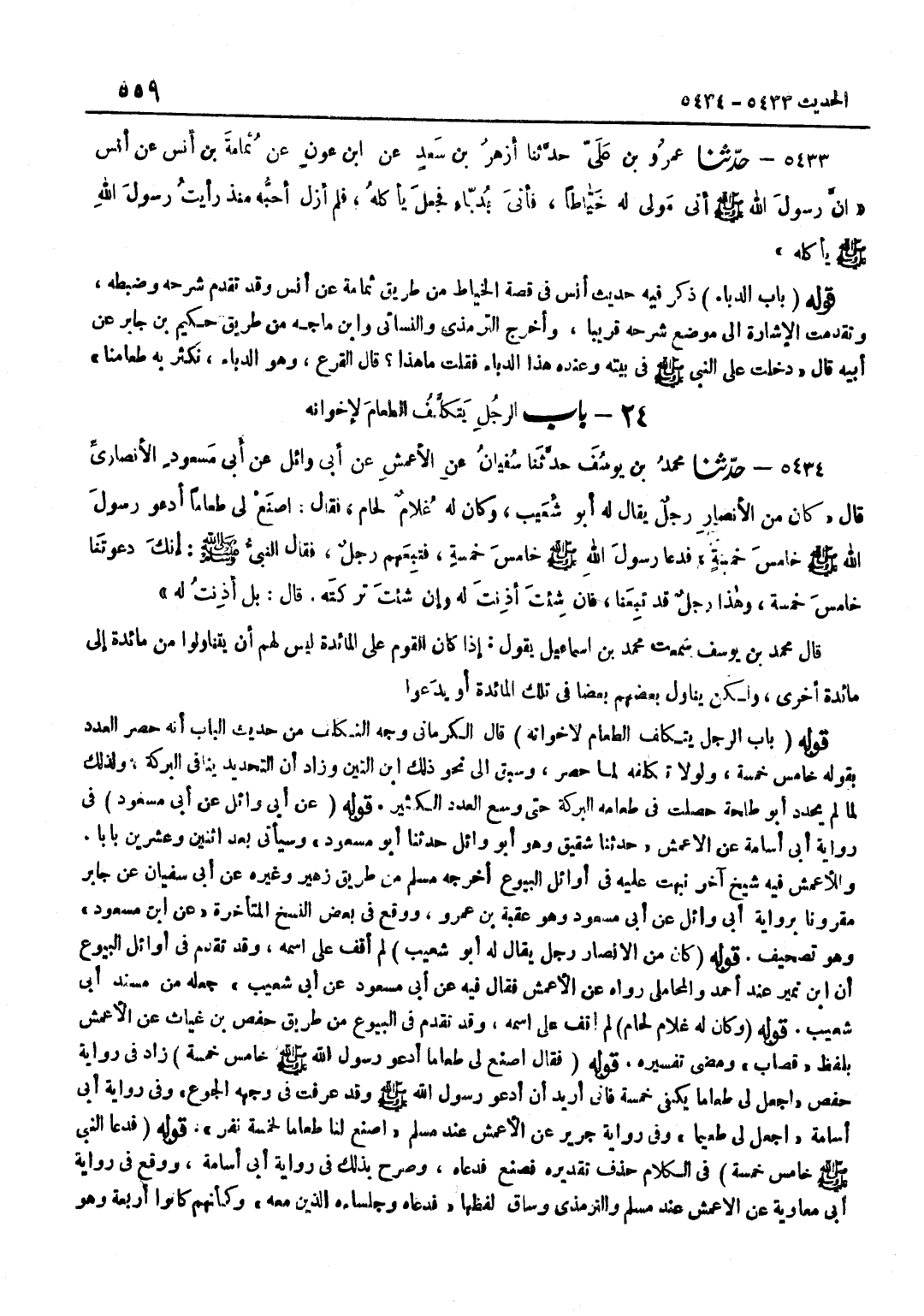 [5434] قَوْلُهُ عَنْ أَبِي وَائِلٍ عَنْ أَبِي مَسْعُودٍ فِي رِوَايَةِ أَبِي أُسَامَةَ عَنِ الْأَعْمَشِ حَدَّثَنَا شَقِيقٌ وَهُوَ أَبُو وَائِلٍ حَدَّثَنَا أَبُو مَسْعُودٍ وَسَيَأْتِي بَعْدَ اثْنَيْنِ وَعِشْرِينَ بَابًا وَلِلْأَعْمَشِ فِيهِ شَيْخٌ آخَرُ نَبَّهْتُ عَلَيْهِ فِي أَوَائِلِ الْبُيُوعِ أَخْرَجَهُ مُسْلِمٌ مِنْ طَرِيقِ زُهَيْرٍ وَغَيْرِهِ عَنْ أَبِي سُفْيَانَ عَنْ جَابِرٍ مَقْرُونًا بِرِوَايَةِ أَبِي وَائِلٍ عَنْ أَبِي مَسْعُودٍ وَهُوَ عُقْبَةُ بْنُ عَمْرٍو وَوَقَعَ فِي بعض النّسخ الْمُتَأَخِّرَة عَن بن مَسْعُودٍ وَهُوَ تَصْحِيفٌ قَوْلُهُ كَانَ مِنَ الْأَنْصَارِ رَجُلٌ يُقَالُ لَهُ أَبُو شُعَيْبٍ لَمْ أَقِفْ عَلَى اسْمِهِ وَقَدْ تَقَدَّمَ فِي أَوَائِلِ الْبُيُوعِ أَن بن نُمَيْرٍ عِنْدَ أَحْمَدَ وَالْمَحَامِلِيِّ رَوَاهُ عَنِ الْأَعْمَشِ فَقَالَ فِيهِ عَنْ أَبِي مَسْعُودٍ عَنْ أَبِي شُعَيْبٍ جَعَلَهُ مِنْ مُسْنَدِ أَبِي شُعَيْبٍ قَوْلُهُ وَكَانَ لَهُ غُلَامٌ لَحَّامٌ لَمْ أَقِفْ عَلَى اسْمِهِ وَقَدْ تَقَدَّمَ فِي الْبُيُوعِ مِنْ طَرِيقِ حَفْصِ بْنِ غِيَاثٍ عَنِ الْأَعْمَشِ بِلَفْظِ قَصَّابٌ وَمَضَى تَفْسِيرُهُ قَوْلُهُ فَقَالَ اصْنَعْ لِي طَعَامًا أَدْعُوَ رَسُولَ اللَّهِ صَلَّى اللَّهُ عَلَيْهِ وَسَلَّمَ خَامِسَ خَمْسَةٍ زَادَ فِي رِوَايَةِ حَفْصٍ اجْعَلْ لِي طَعَامًا يَكْفِي خَمْسَةً فَإِنِّي أُرِيدَ أَنْ أَدْعُوَ رَسُولُ اللَّهَ صَلَّى اللَّهُ عَلَيْهِ وَسَلَّمَ وَقَدْ عَرَفْتُ فِي وَجْهِهِ الْجُوعَ وَفِي رِوَايَةِ أَبِي أُسَامَةَ اجْعَلْ لِي طُعَيِّمًا وَفِي رِوَايَةِ جَرِيرٍ عَنِ الْأَعْمَشِ عِنْدَ مُسْلِمٍ اصْنَعْ لَنَا طَعَامًا لِخَمْسَةِ نَفَرٍ قَوْلُهُ فَدَعَا النَّبِيُّ صَلَّى اللَّهُ عَلَيْهِ وَسَلَّمَ خَامِسَ خَمْسَةٍ فِي الْكَلَامِ حَذْفٌ تَقْدِيرُهُ فَصَنَعَ فَدَعَاهُ وَصَرَّحَ بِذَلِكَ فِي رِوَايَةِ أَبِي أُسَامَةَ وَوَقَعَ فِي رِوَايَةِ أَبي مُعَاوِيَةَ عَنِ الْأَعْمَشِ عِنْدَ مُسْلِمٍ وَالتِّرْمِذِيِّ وَسَاقَ لَفْظَهَا فَدَعَاهُ وَجُلَسَاءَهُ الَّذِينَ مَعَهُ وَكَأَنَّهُمْ كَانُوا أَرْبَعَة وَهُوَ