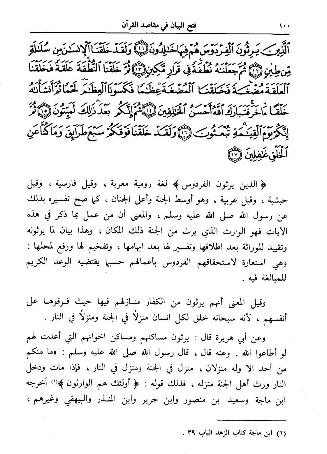 الَّذِينَ يَرِثُونَ الْفِرْدَوْسَ هُمْ فِيهَا خَالِدُونَ (11) وَلَقَدْ خَلَقْنَا الْإِنْسَانَ مِنْ سُلَالَةٍ مِنْ طِينٍ (12) ثُمَّ جَعَلْنَاهُ نُطْفَةً فِي قَرَارٍ مَكِينٍ (13) ثُمَّ خَلَقْنَا النُّطْفَةَ عَلَقَةً فَخَلَقْنَا الْعَلَقَةَ مُضْغَةً فَخَلَقْنَا الْمُضْغَةَ عِظَامًا فَكَسَوْنَا الْعِظَامَ لَحْمًا ثُمَّ أَنْشَأْنَاهُ خَلْقًا آخَرَ فَتَبَارَكَ اللَّهُ أَحْسَنُ الْخَالِقِينَ (14) ثُمَّ إِنَّكُمْ بَعْدَ ذَلِكَ لَمَيِّتُونَ (15) ثُمَّ إِنَّكُمْ يَوْمَ الْقِيَامَةِ تُبْعَثُونَ (16) وَلَقَدْ خَلَقْنَا فَوْقَكُمْ سَبْعَ طَرَائِقَ وَمَا كُنَّا عَنِ الْخَلْقِ غَافِلِينَ (17)
