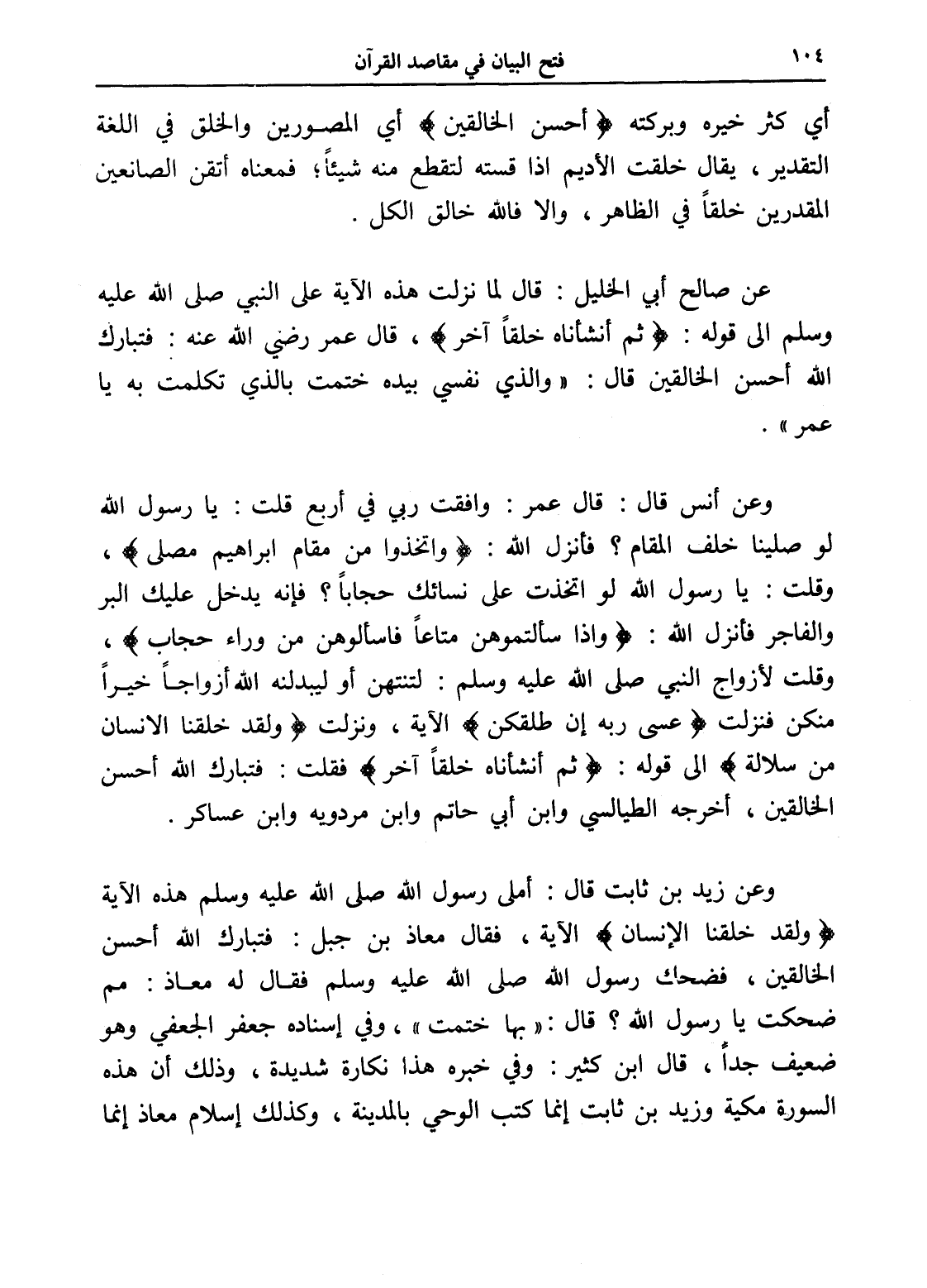 عن صالح أبي الخليل: قال لما نزلت هذه الآية على النبي صلى الله عليه وسلم إلى قوله: (ثم أنشأناه خلقاً آخر)، قال عمر رضي الله عنه: فتبارك الله أحسن الخالقين قال: " والذي نفسي بيده ختمت بالذىِ تكلمت به يا عمر ".