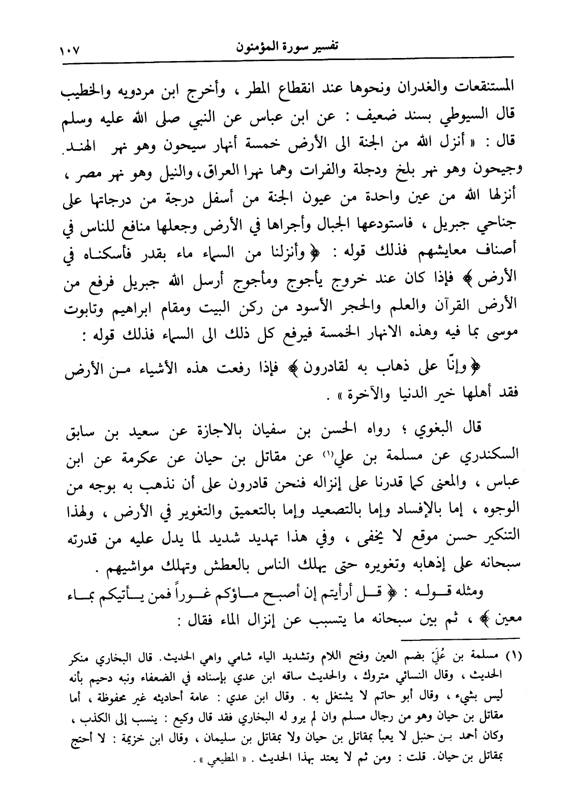 المستنقعات والغدران ونحوها عند انقطاع المطر، وأخرج ابن مردويه والخطيب قال السيوطي بسند ضعيف: عن ابن عباس عن النبي صلى الله عليه وسلم قال: " أنزل الله من الجنة إلى الأرض خمسة أنهار سيحون وهو نهر الهند وجيحون وهو نهر بلخ ودجلة والفرات وهما نهرا العراق، والنيل وهو نهر مصر، أنزلها الله من عين واحدة من عيون الجنة من أسفل درجة من درجاتها على جناحي جبريل، فاستودعها الجبال وأجراها في الأرض وجعلها منافع للناس في أصناف معايشهم فذلك قوله: (وأنزلنا من السماء ماء بقدر فأسكناه في الأرض) فإذا كان عند خروج يأجوج ومأجوج أرسل الله جبريل فرفع من الأرض القرآن والعلم والحجر الأسود من ركن البيت ومقام إبراهيم وتابوت موسى بما فيه وهذه الأنهار الخمسة فيرفع كل ذلك إلى السماء فذلك قوله: (وإنا على ذهاب به لقادرون) فإذا رفعت هذه الأشياء من الأرض فقد أهلها خير الدنيا والآخرة ".