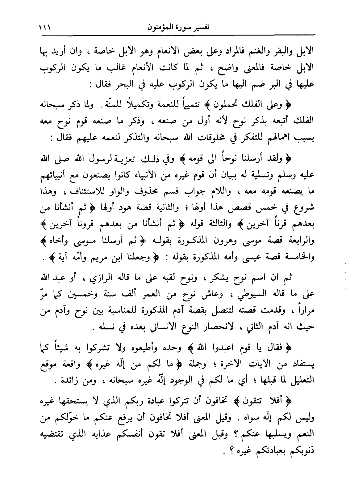 (وعلى الفلك تحملون) تتميماً للنعمة وتكميلاً للمنّة. ولما ذكر سبحانه الفلك أتبعه بذكر نوح لأنه أول من صنعه، وذكر ما صنعه قوم نوح معه بسبب إهمالهم للتفكر في مخلوقات الله سبحانه والتذكر لنعمه عليهم فقال: