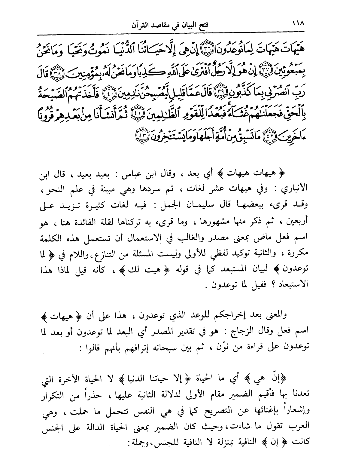 هَيْهَاتَ هَيْهَاتَ لِمَا تُوعَدُونَ (36) إِنْ هِيَ إِلَّا حَيَاتُنَا الدُّنْيَا نَمُوتُ وَنَحْيَا وَمَا نَحْنُ بِمَبْعُوثِينَ (37) إِنْ هُوَ إِلَّا رَجُلٌ افْتَرَى عَلَى اللَّهِ كَذِبًا وَمَا نَحْنُ لَهُ بِمُؤْمِنِينَ (38) قَالَ رَبِّ انْصُرْنِي بِمَا كَذَّبُونِ (39) قَالَ عَمَّا قَلِيلٍ لَيُصْبِحُنَّ نَادِمِينَ (40) فَأَخَذَتْهُمُ الصَّيْحَةُ بِالْحَقِّ فَجَعَلْنَاهُمْ غُثَاءً فَبُعْدًا لِلْقَوْمِ الظَّالِمِينَ (41) ثُمَّ أَنْشَأْنَا مِنْ بَعْدِهِمْ قُرُونًا آخَرِينَ (42) مَا تَسْبِقُ مِنْ أُمَّةٍ أَجَلَهَا وَمَا يَسْتَأْخِرُونَ (43)