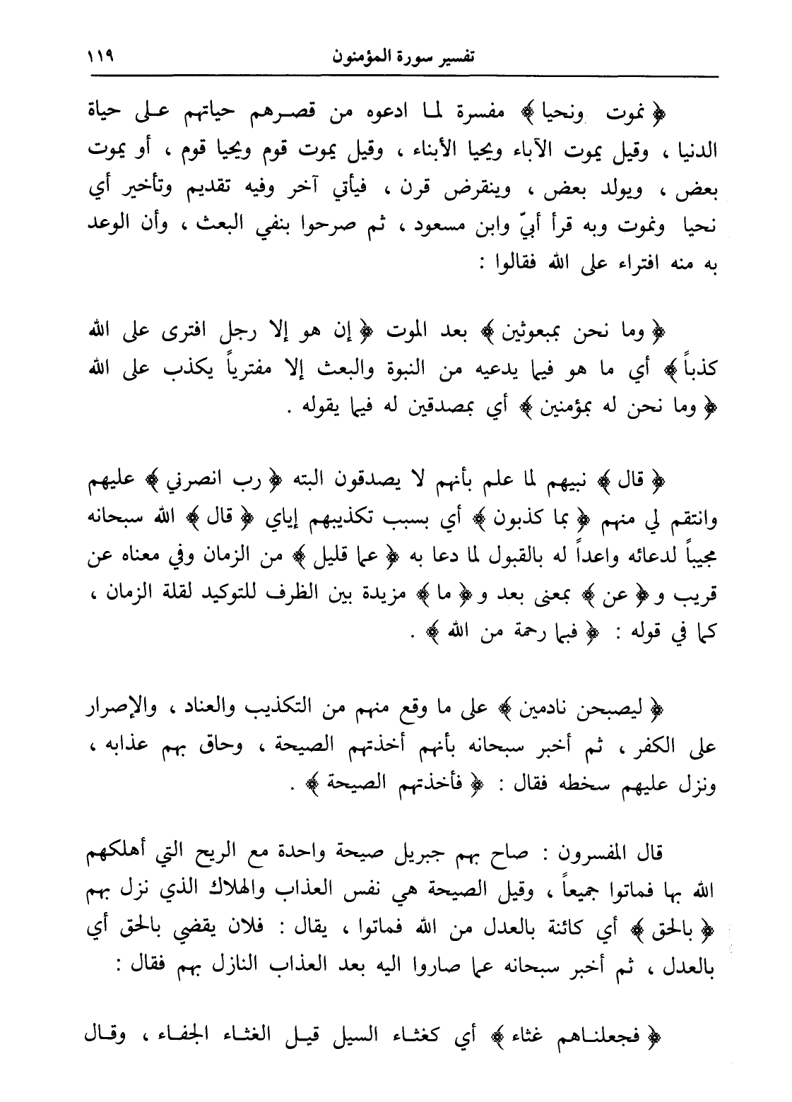 (نموت ونحيا) مفسرة لما ادعوه من قصرهم حياتهم على حياة الدنيا، وقيل يموت الآباء ويحيا الأبناء، وقيل يموت قوم ويحيا قوم، أو يموت بعض، ويولد بعض، وينقرض قرن، فيأتي آخر وفيه تقديم وتأخير أي نحيا ونموت وبه قرأ أبيّ وابن مسعود، ثم صرحوا بنفي البعث، وأن الوعد به منه افتراء على الله فقالوا: